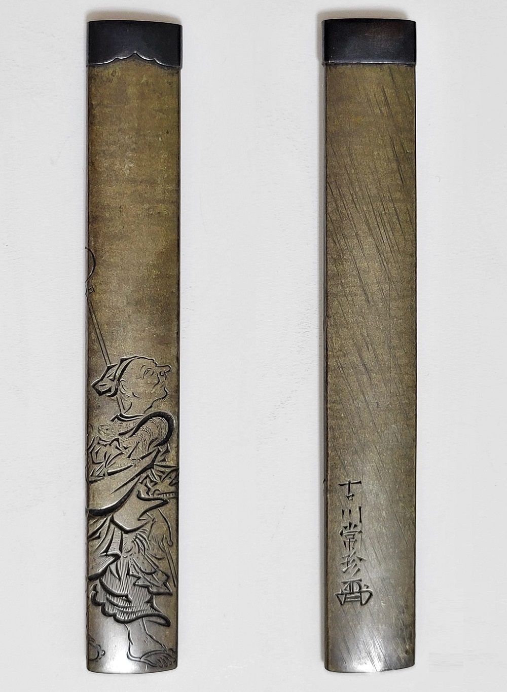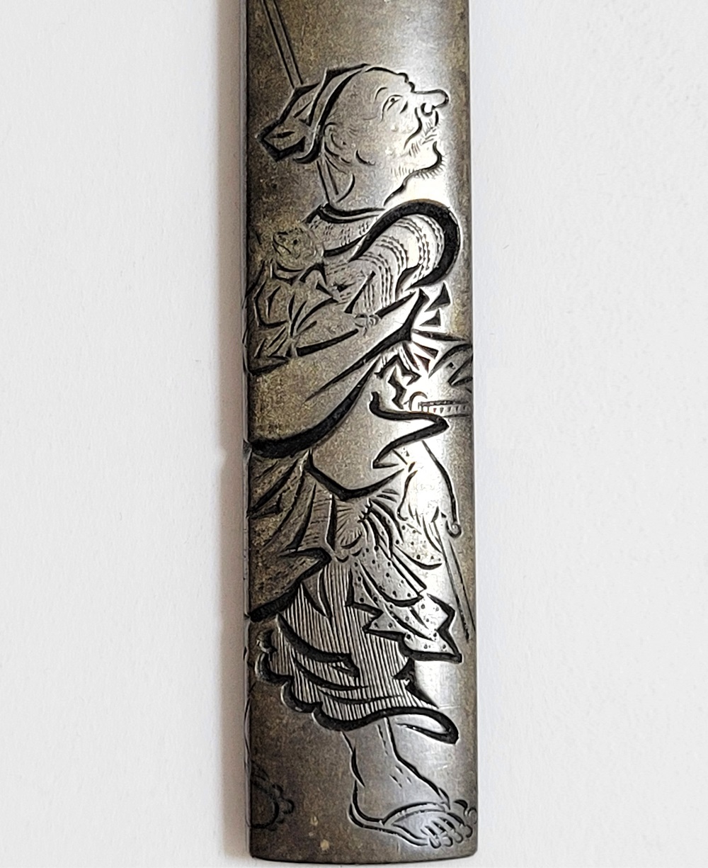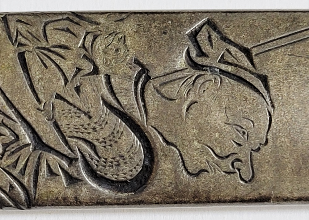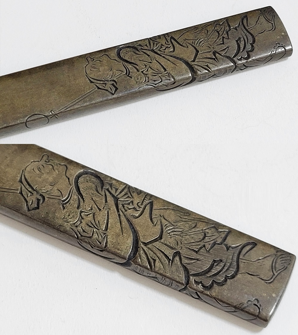 半開きになった大きな貝から気が立ち昇り、その中に山水や楼閣があらわれる図は「蜃気楼」。蜃(しん)とは、蜃気楼を作り出すといわれる伝説の生物。中国と日本で伝承され、竜の類とする説と巨大なハマグリとする説がある。 蜃気楼の名は「蜃(みずち)」が「気」を吐いて「楼」閣を出現させると考えられたことに由来する。 本作者の濱野矩施(のります)は二代濱野矩随(のりゆき)の若名。初代矩随の子で濱野政随に14歳で入門。17歳で政方と名乗り、その後一門の永随に師事して矩施と改める。22歳時に亡父の遺言により二代矩随を名乗る。明和八年(1771)生まれ嘉永五年(1852)没。二代矩随は濱野を「濱埜」と鐫る。初代に劣らぬ良工。特別保存刀装具。