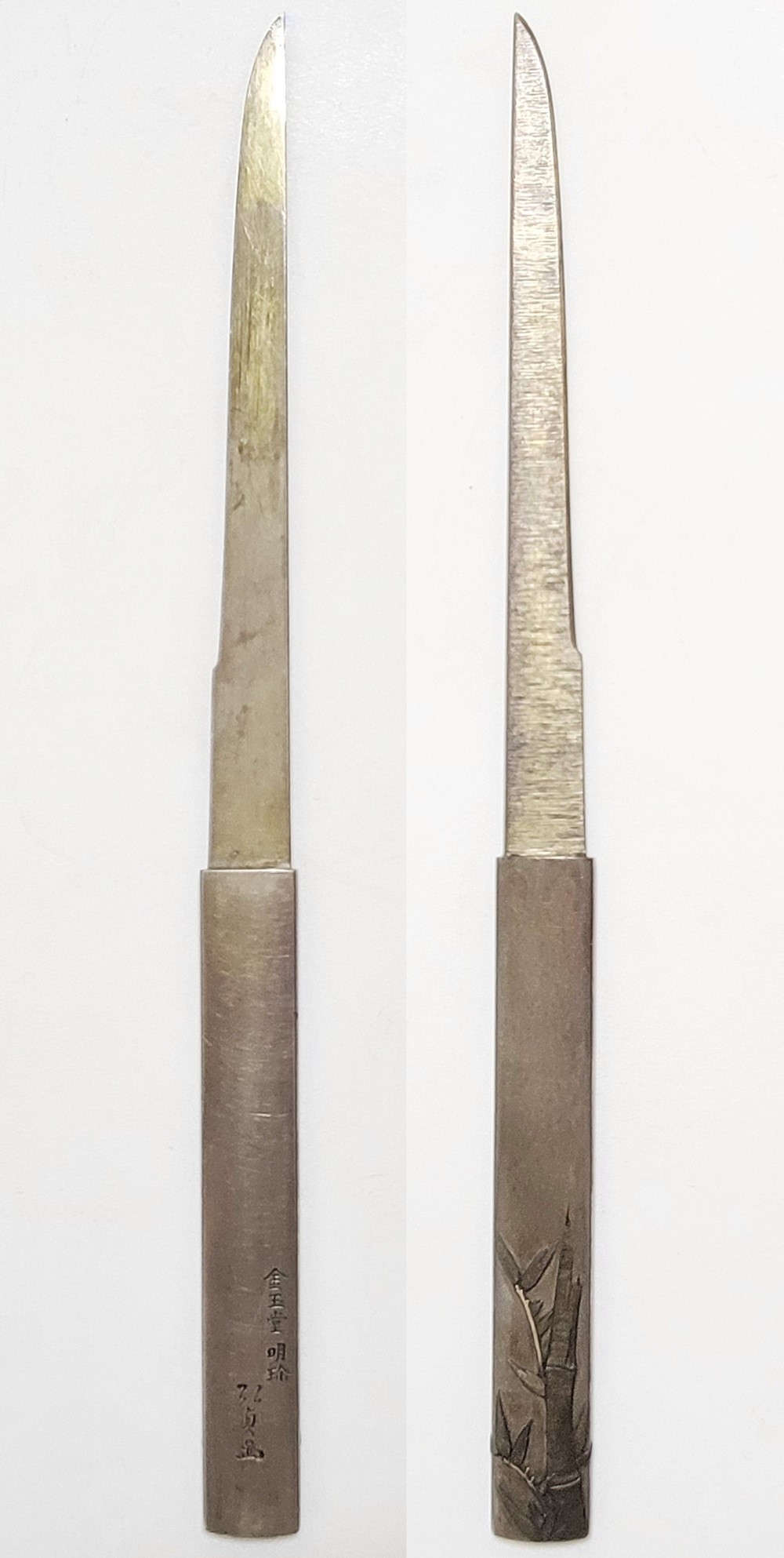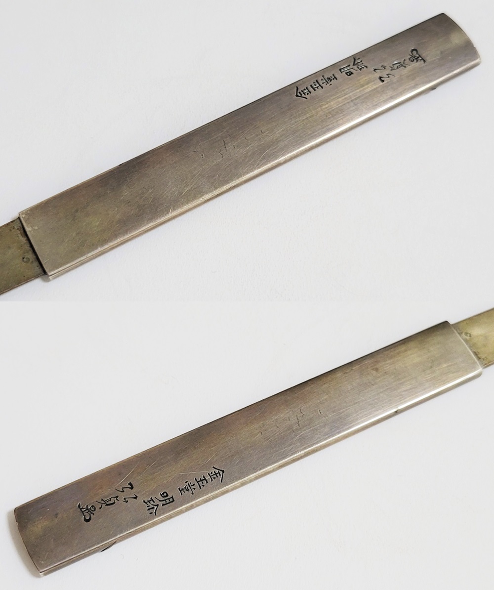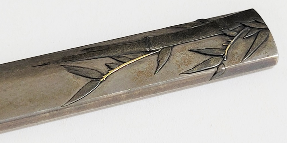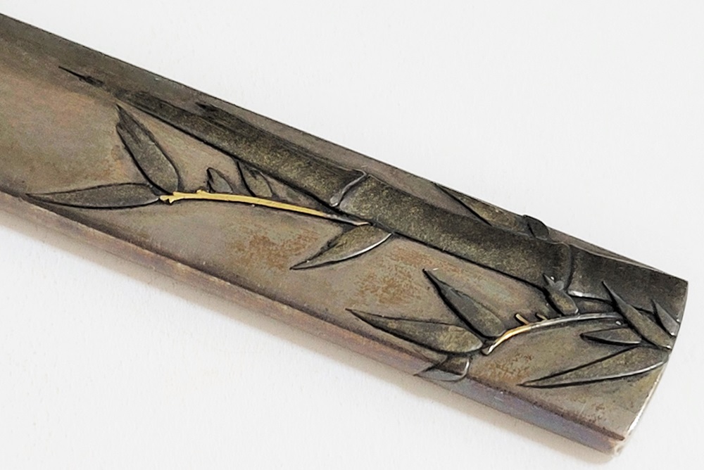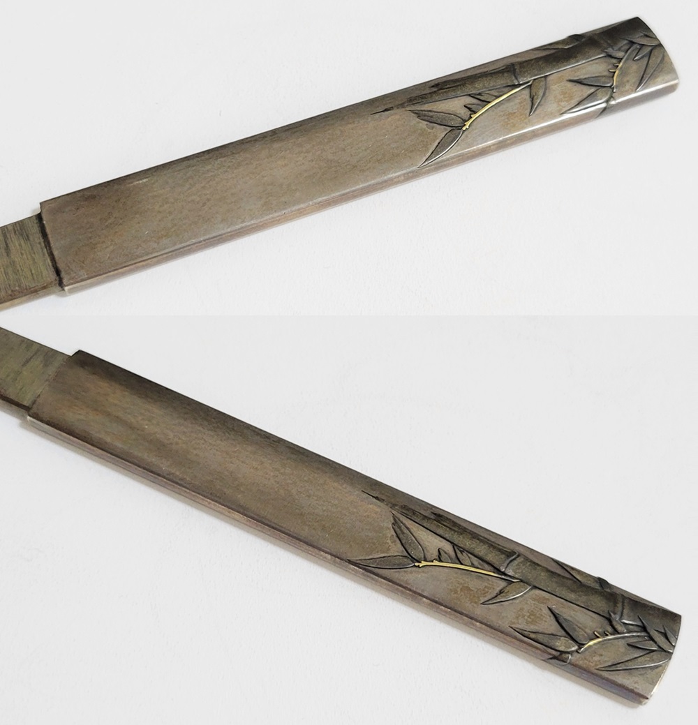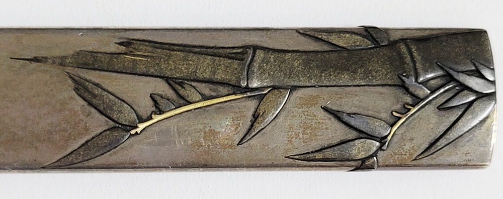 | 冬の厳しさに耐え、節目正しく真直ぐにそしてしなやかに生長する竹は人気の画題。本作は四分一掛かる銀地で作られた小柄と穂先が一体の共小柄。天に向かって伸びる竹を巧みにあらわす。弘貞は写実風の高彫りで打越派を成す打越弘寿の門人。弘化四丁未年五月年紀(1847)作がある。号は秀現斎・金玉堂、後年に圓象を使用した。穂:長さ12.5cm/元幅1.22cm/元重0.23cm。特別保存刀装具。 |