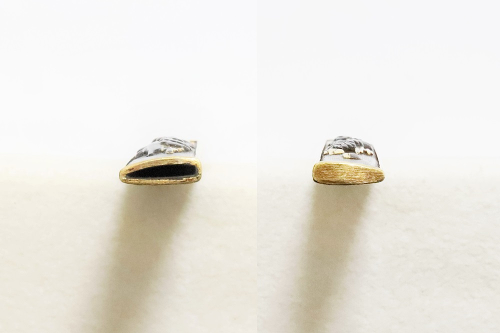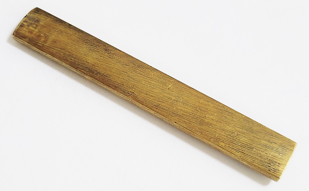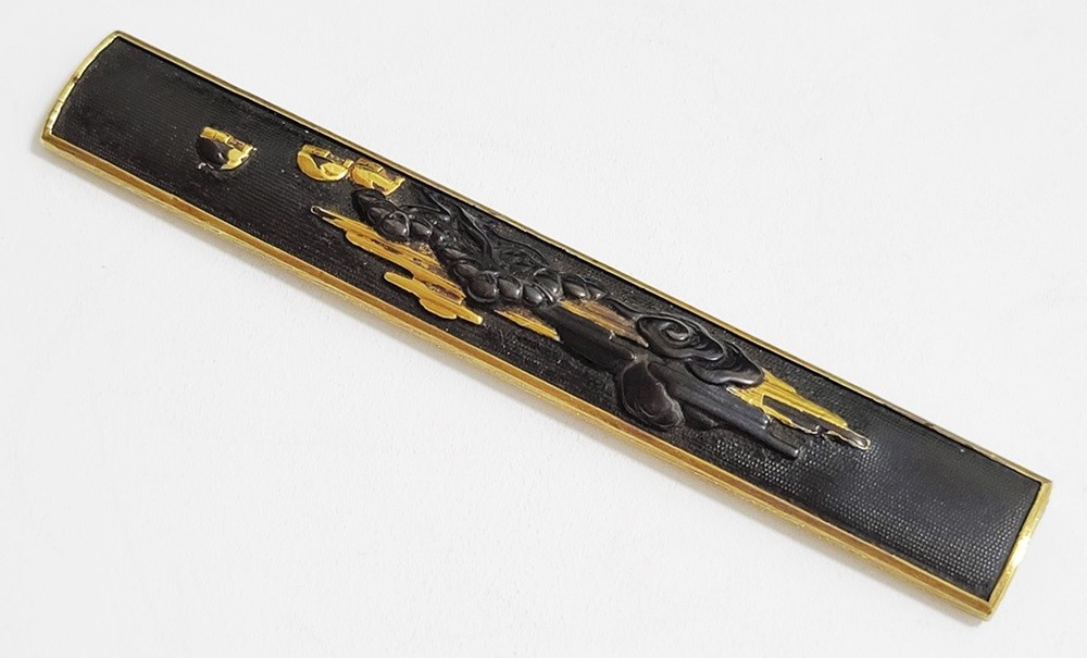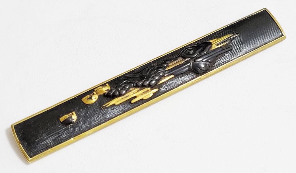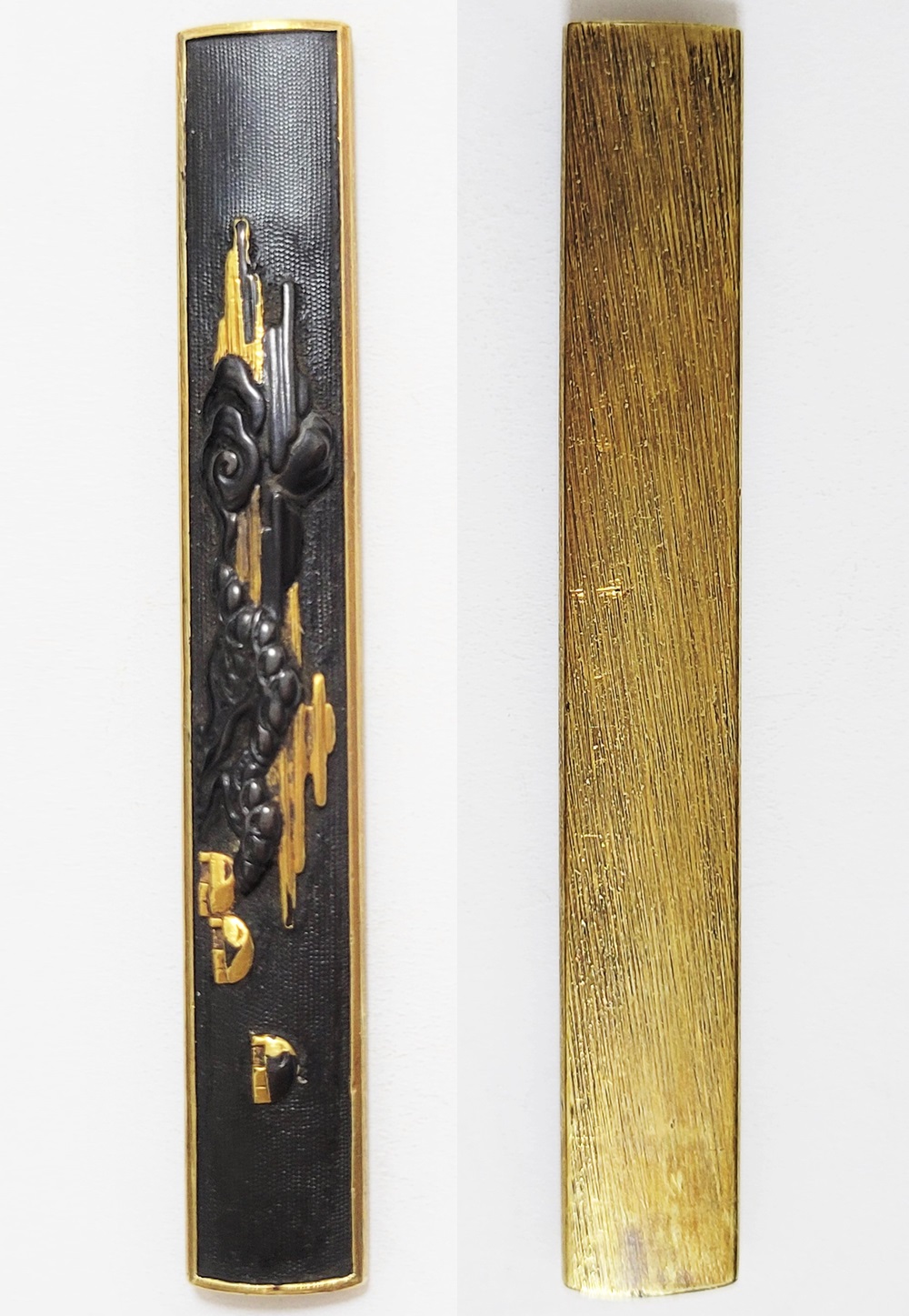 | 古後藤と極められた塩屋図小柄。古後藤とは江戸期まで時代が下らない桃山時代までの古い後藤家で作者を特定できない作。初代祐乗、二代宗乗、三代乗真、四代光乗、五代徳乗の時代に相当する。塩屋は海水から砂浜で塩を作る日本古来からの製塩法を題材にした図。本作は、擦れ剝がれた袋着せや魚子の擦れ具合および作域から古後藤。裏板の保存状態もよい。保存刀装具。 |