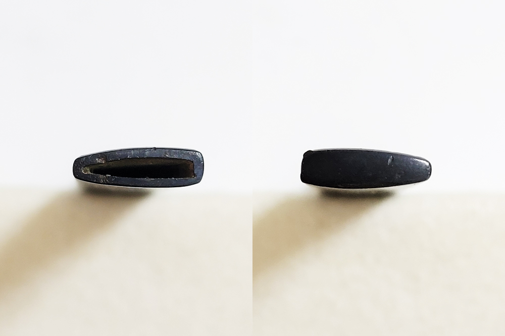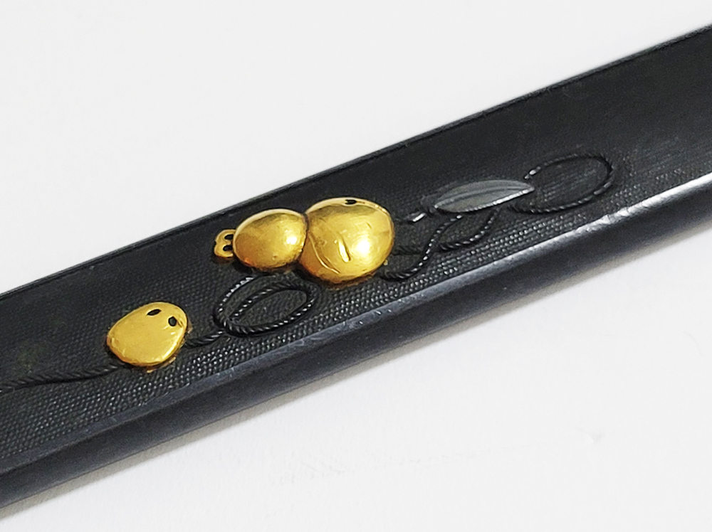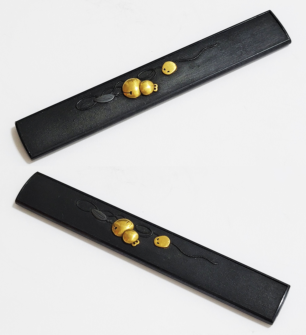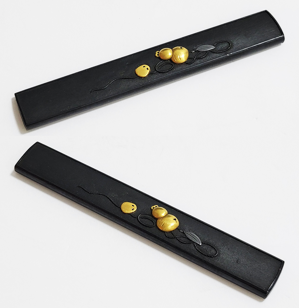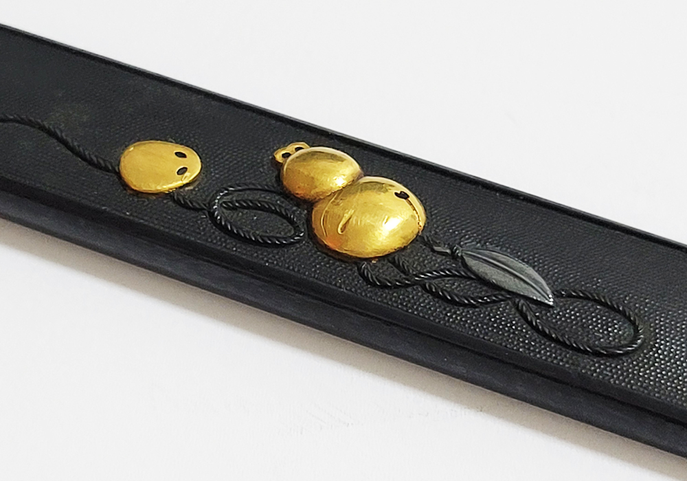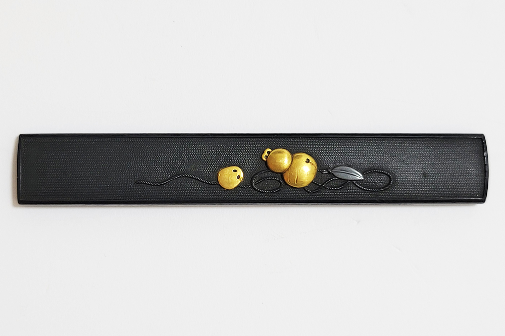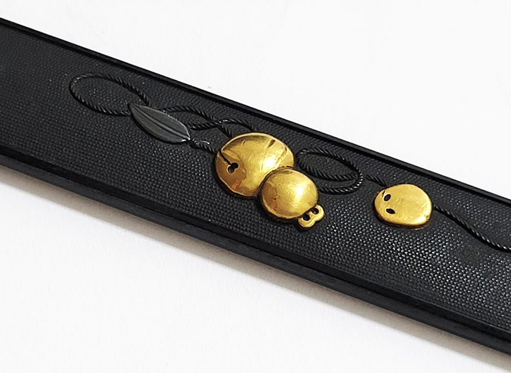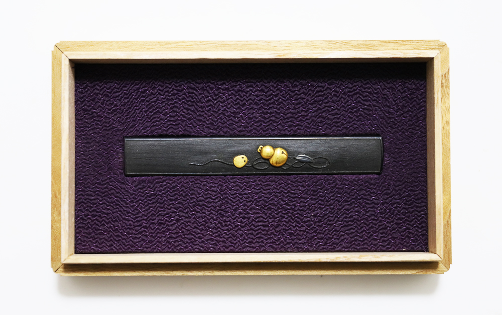 | 瓢箪鈴(ひょうたんすず)は瓢箪の形をした鈴。運を集めて開運に導きまた邪気を集めて封じ込めるといわれる瓢箪が鈴の音を鳴らしご利益を願う縁起物。本作は細微に整った赤銅魚子地に瓢箪鈴を配した小柄。状態頗るよい。2024年11月刀装具審査で京金工に極まり保存合格。 |
