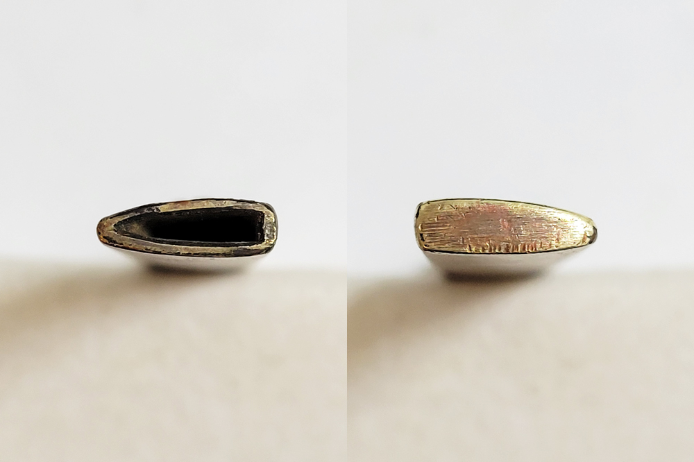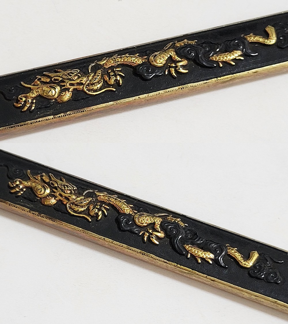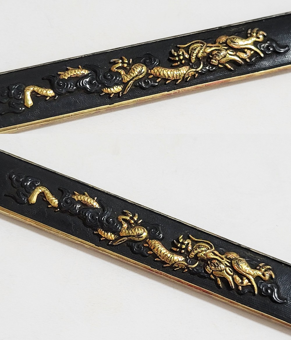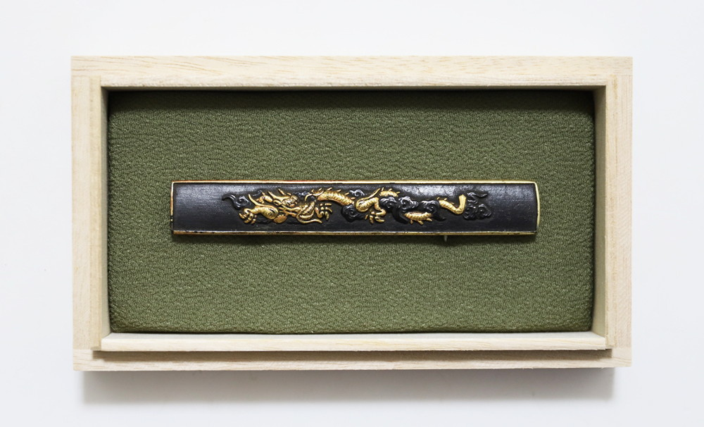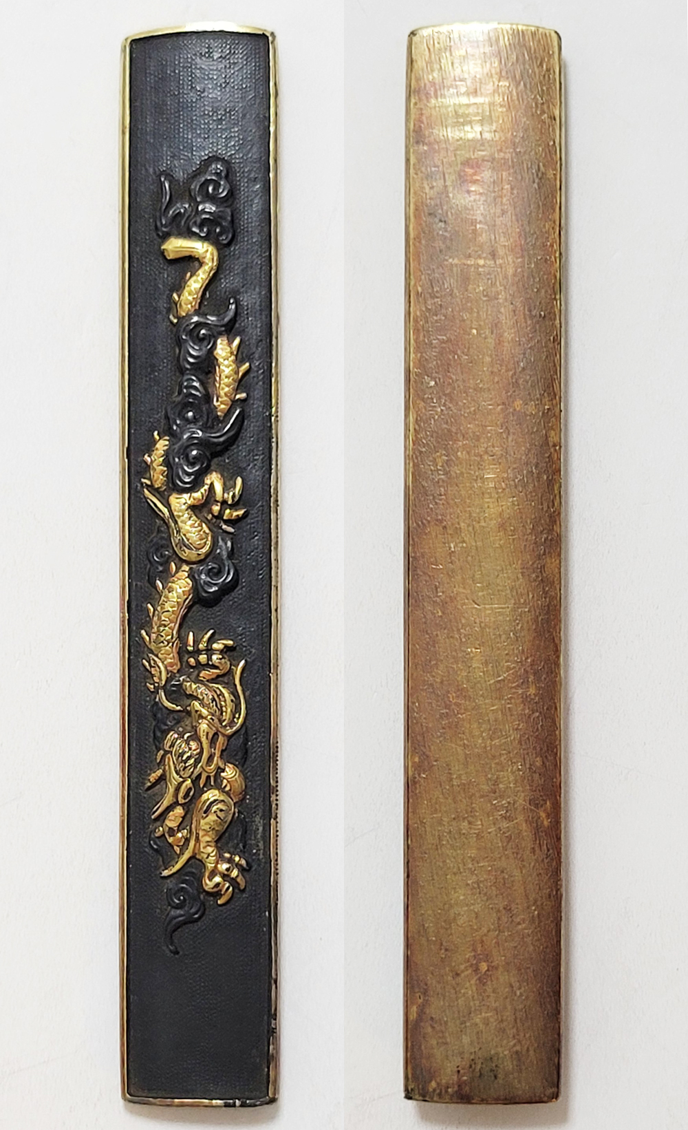 | 瑞雲を纏う這龍図小柄。金性映える裏哺金と擦れた魚子地より江戸中期は下らない京金工作と思われる。 |
