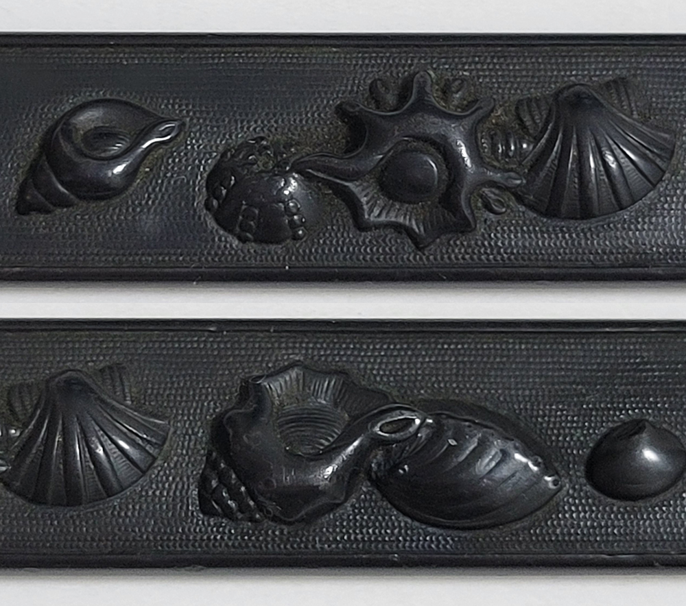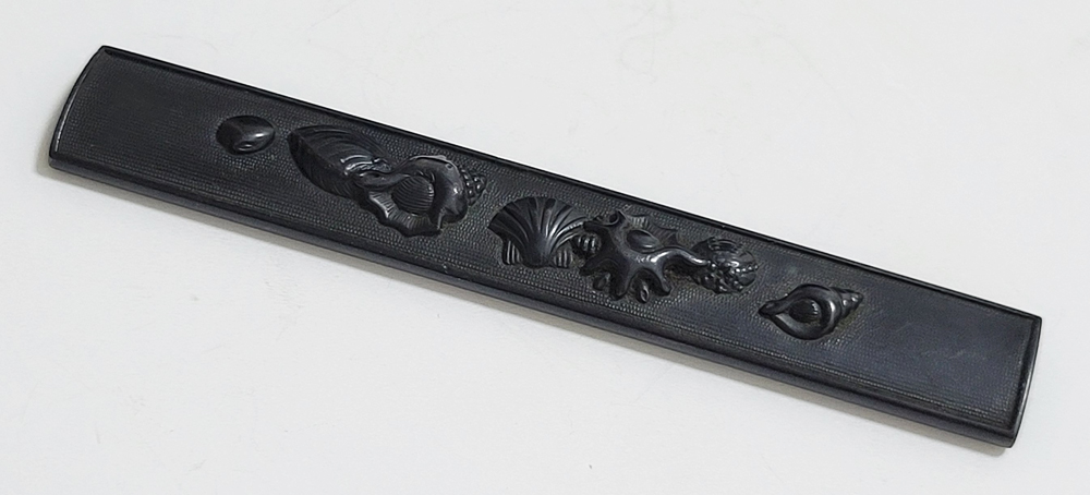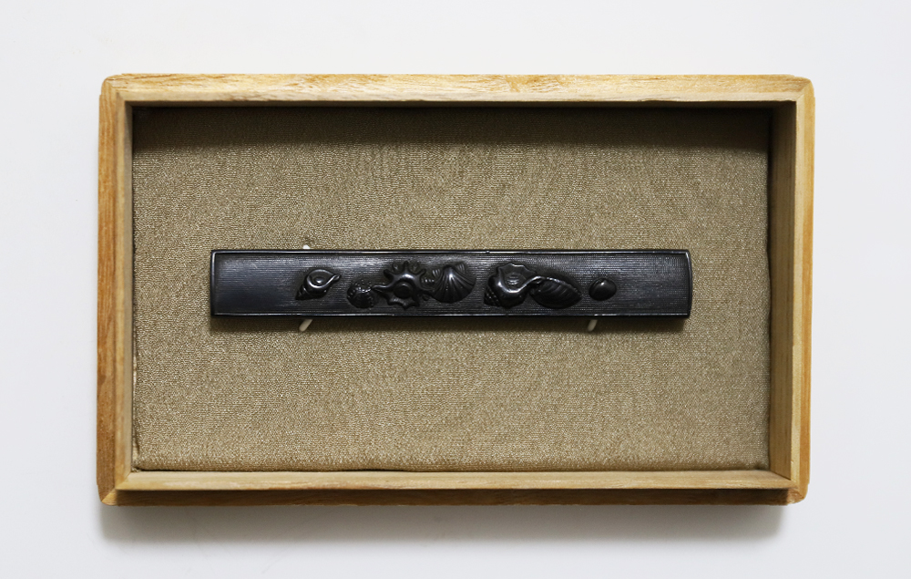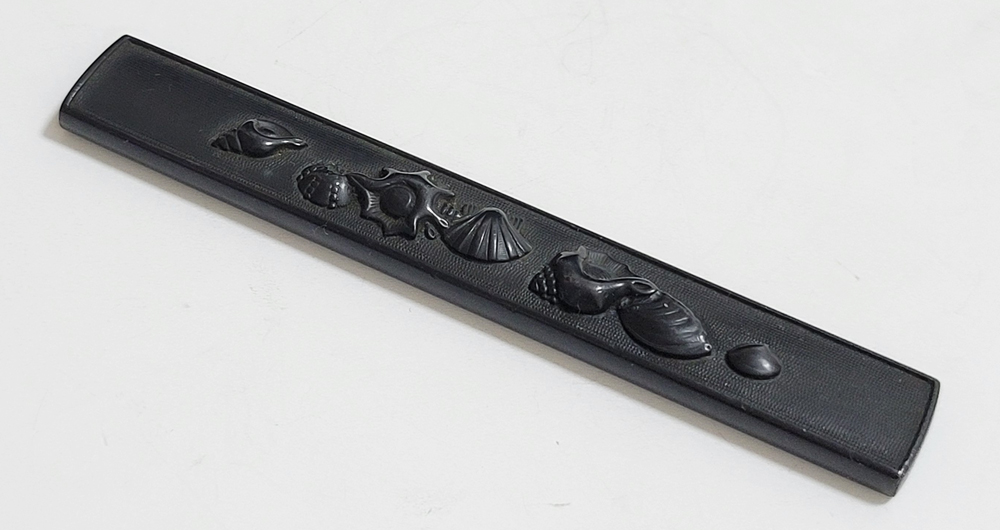 | 貝尽(かいづくし)は異なる主だった貝の美しい形を絵や文様にした図。刀装具のほか着物や陶器に人気のある画題として好まれた。本作は赤銅のみで巻貝、雲丹、法螺貝、蛤、栄螺、鮑、浅蜊を並べた意匠。後藤流の格調ある小柄。魚子の擦れが時代をあらわしている。2025年2月刀装具審査で「後藤」に極まり保存合格。 |