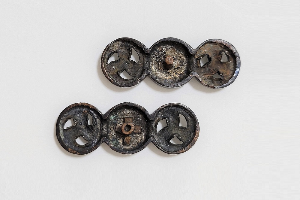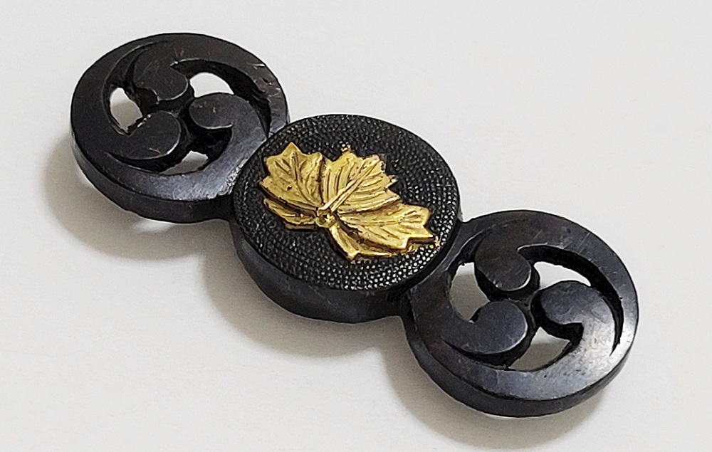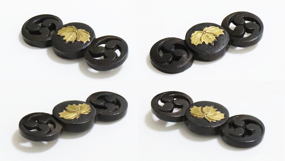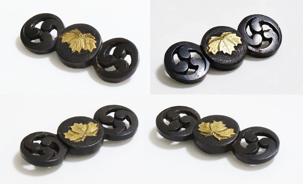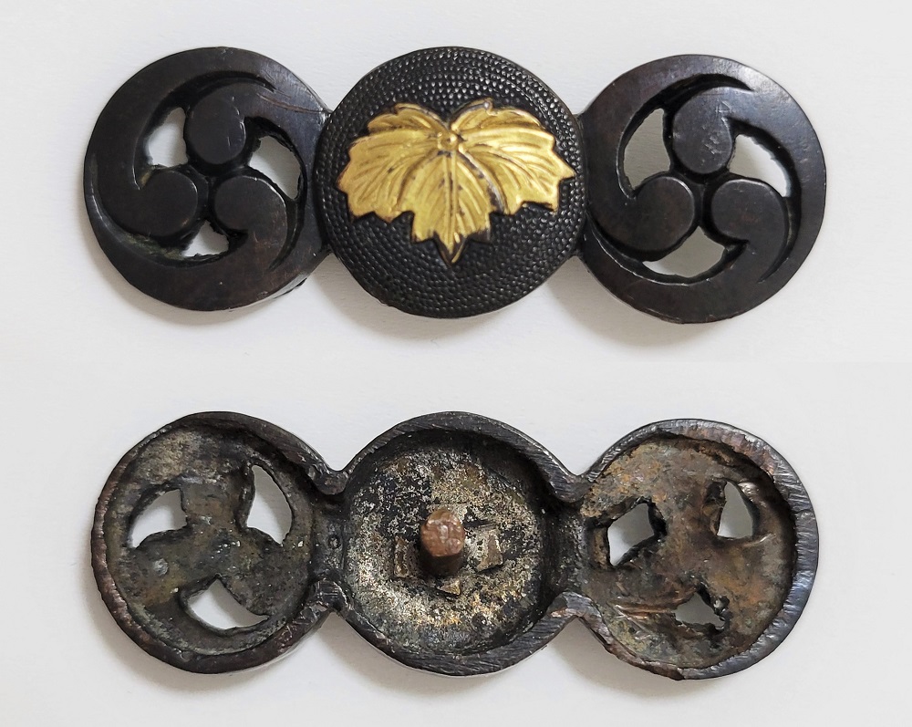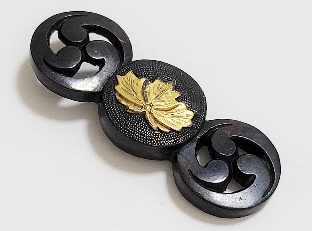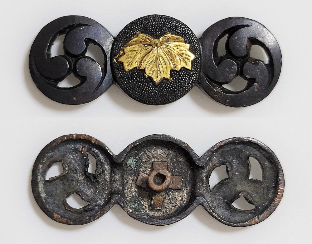 | 巴(ともえ)は、コンマあるいは勾玉のような形をした日本の伝統的文様。弓をひく人の左腕に結びつけて矢を放った際の弓返りを防ぐ半月形の革製品「鞆」(とも)を図案化したもの、あるいは鞆(とも)に描かれた文様からきているという。巴紋は、家紋や神紋・寺紋としても用いられ、太鼓、軒丸瓦などにも描かれる。本作は右三つ巴紋を左右に、そして中央に蔓(つる)が伸びて繁栄を意味する蔦(つた)を描いた三双図赤銅地陰陽根目貫。 |