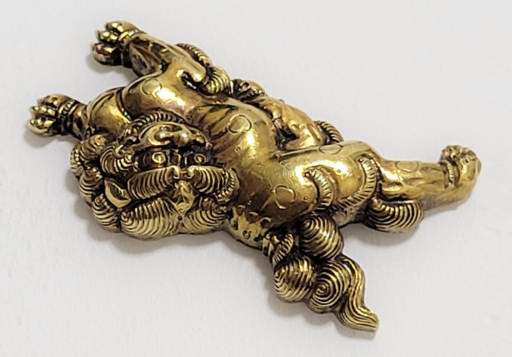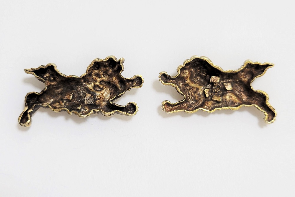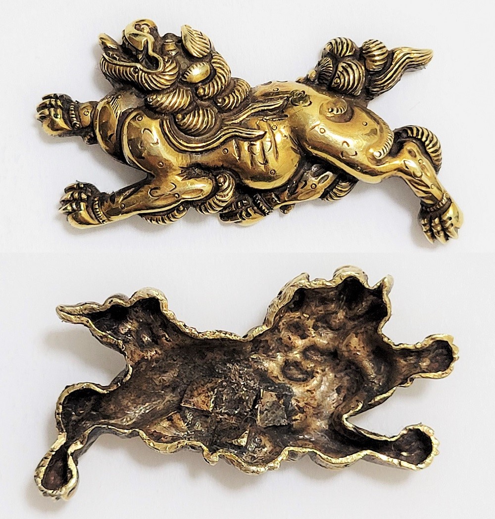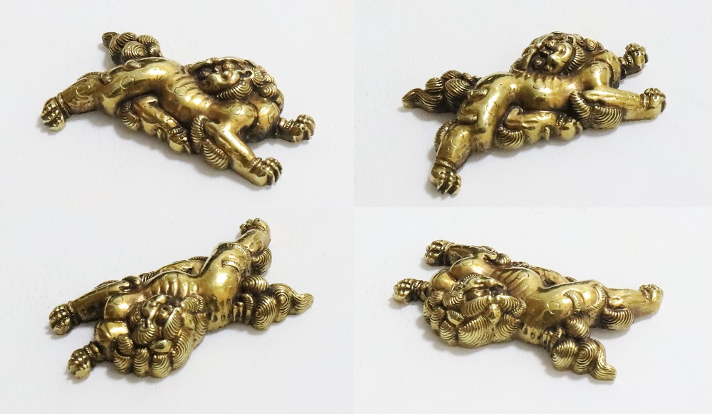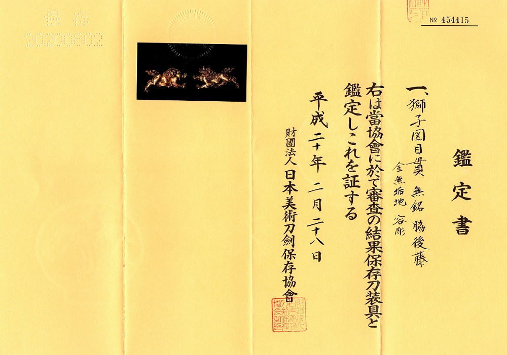 | 背筋のなめくり鏨、後足付け根の筋など後藤の掟どおりであるが、洲浜崩れの胴の班からか、脇後藤と極められた一疋獅子金無垢目貫。相応の時代が窺える。 |