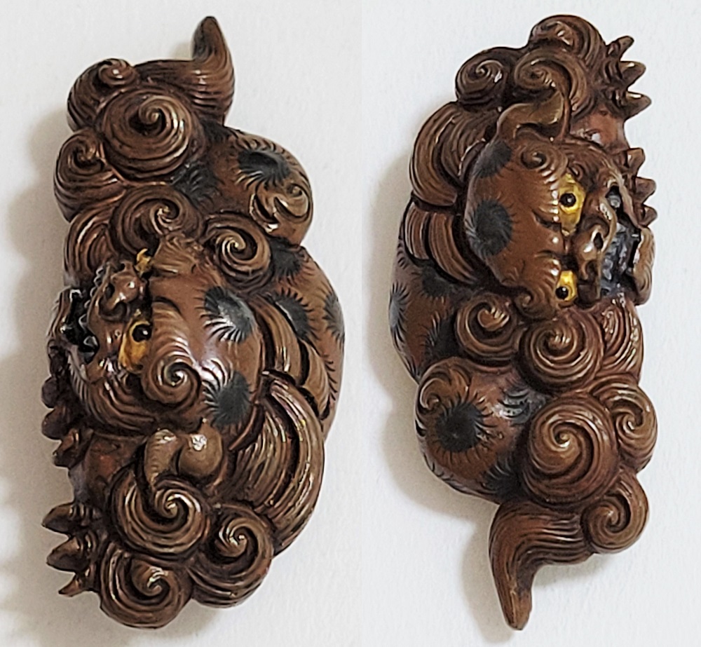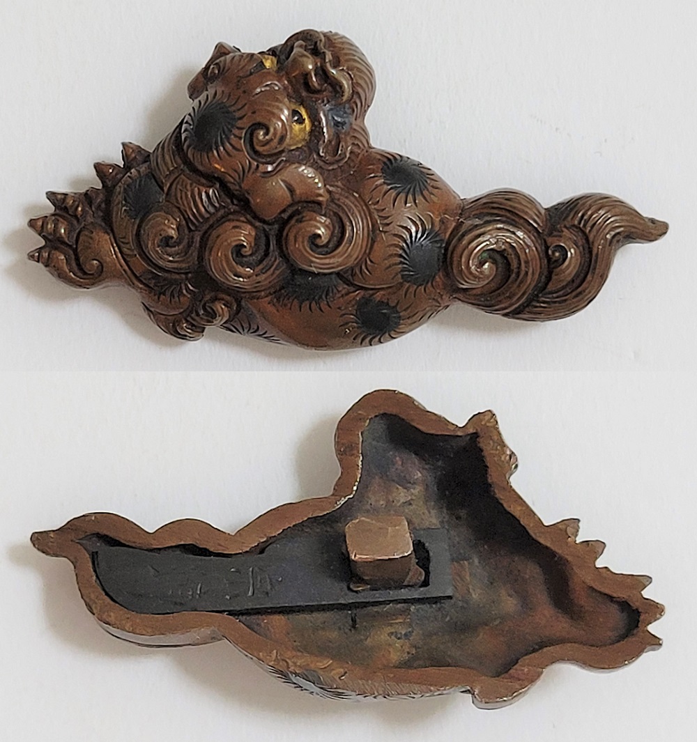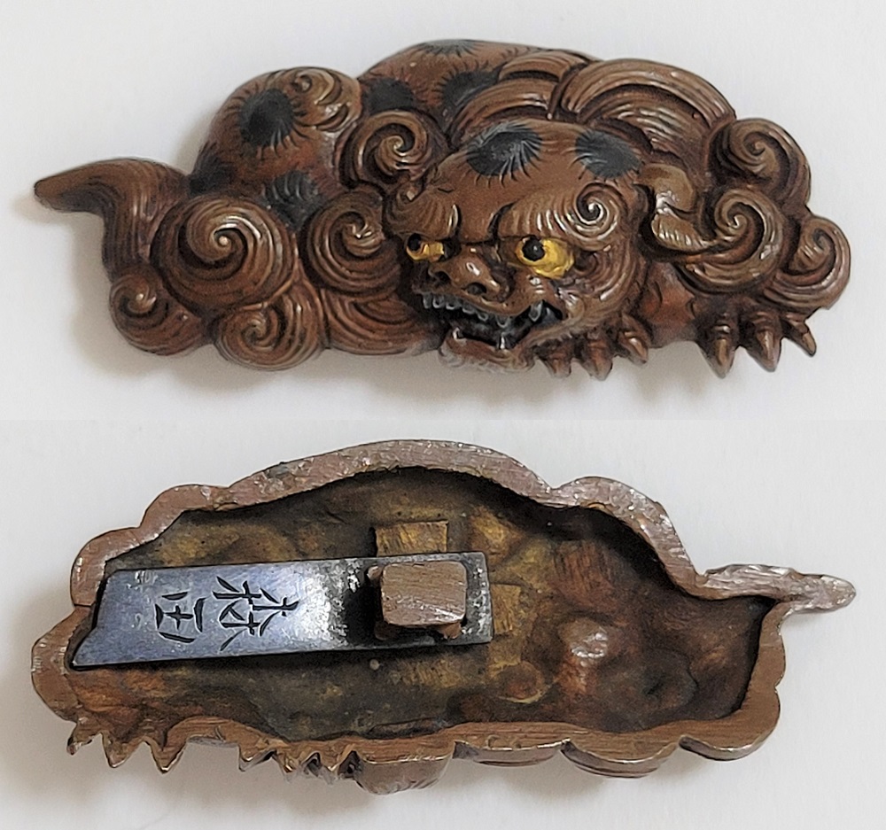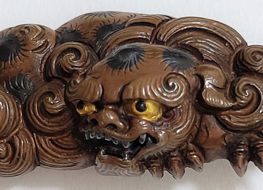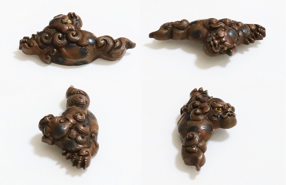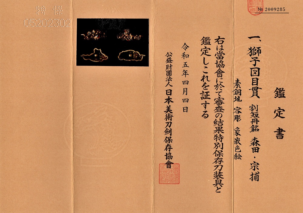 | 素銅の躯体に赤銅の色金を埋め彫を加えて班を装飾。宗珉に倣った横谷獅子。割短冊銘 森田・宗捕については不詳ながら、精緻な鏨で表現された顔に実力が示されている。特別保存刀装具。 |