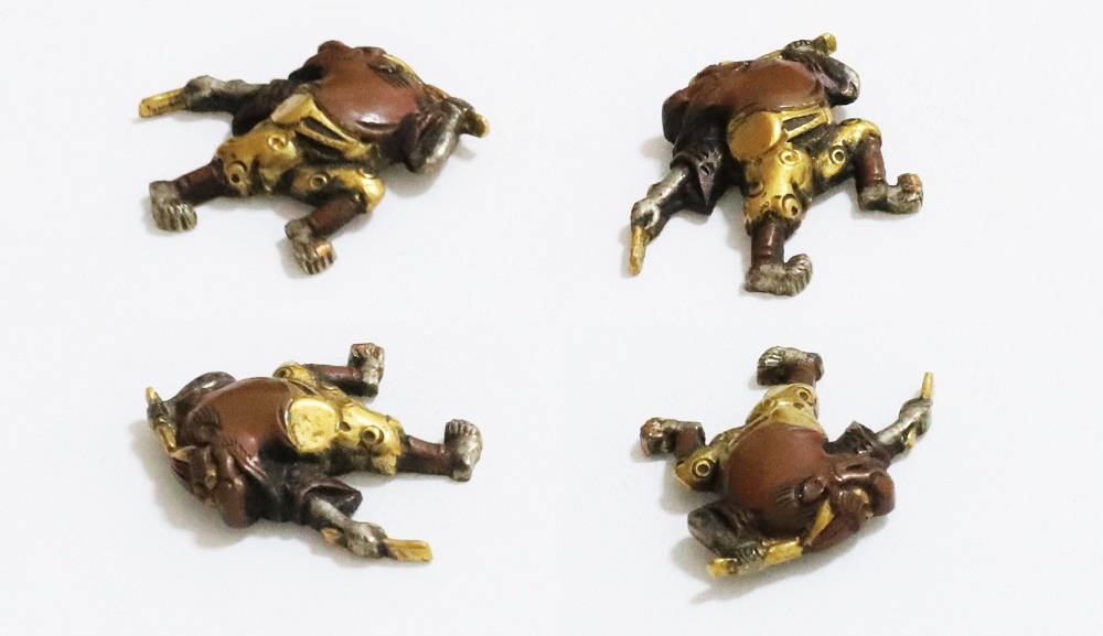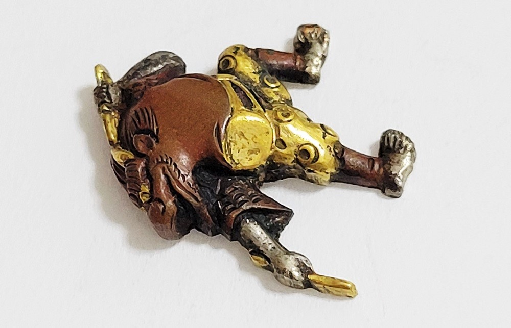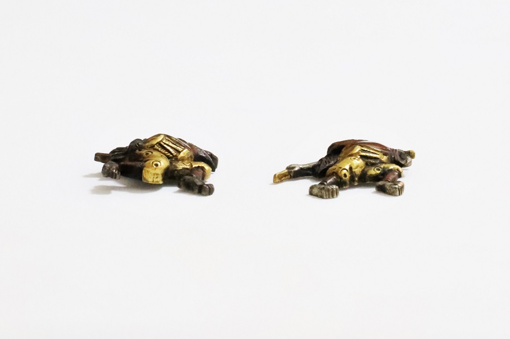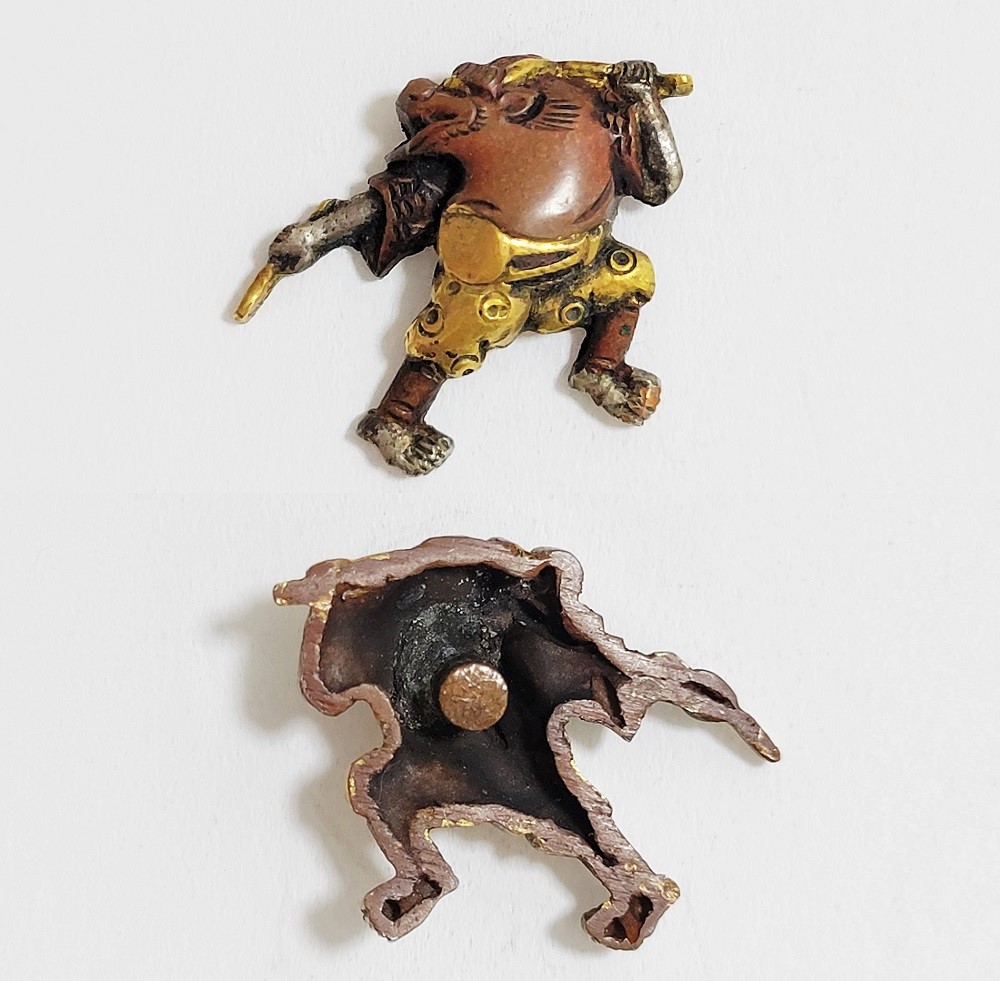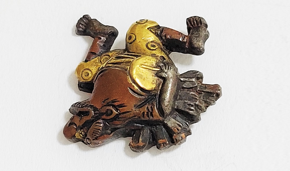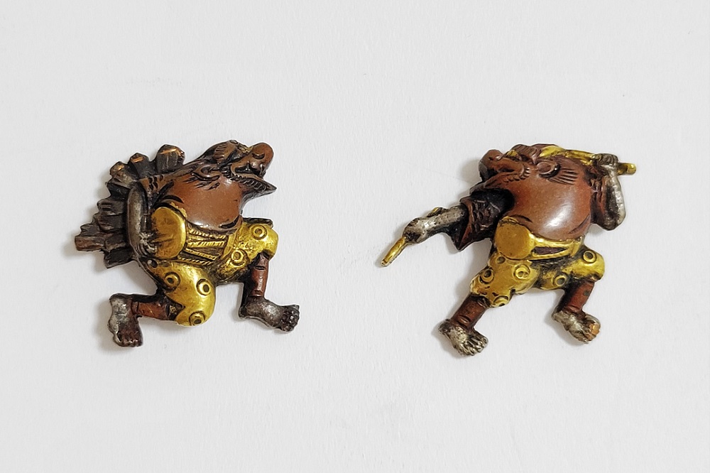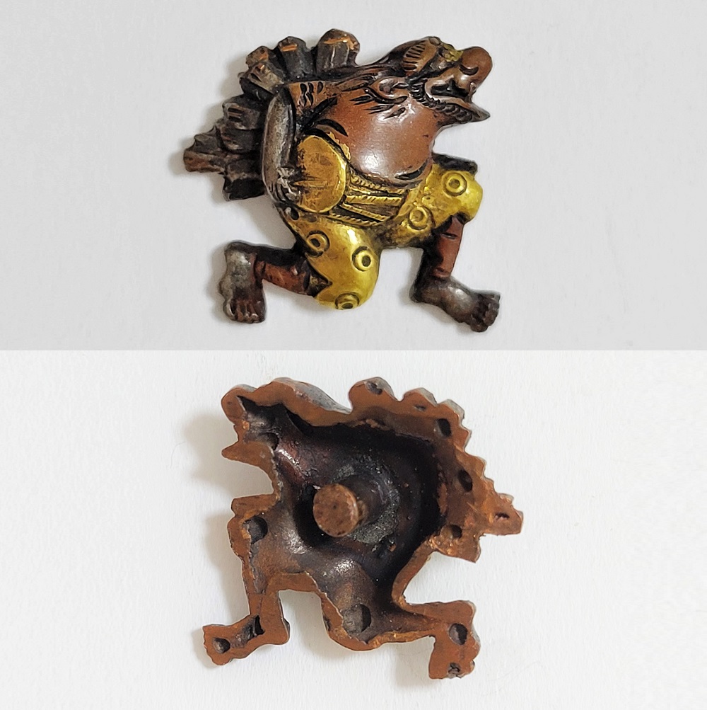 | 越後獅子は、越後国西蒲原郡月潟村(現新潟市)が発祥の一人立ち獅子舞。家の前で獅子頭(ししがしら)をかぶった子供が、親方の笛・太鼓に合わせて踊りや軽業などを見せ銭を貰う大道芸。江戸中後期に盛んにおこなわれた。本作は小振りの越後獅子図素銅目貫。裏行きに容彫の妙が窺える。 |