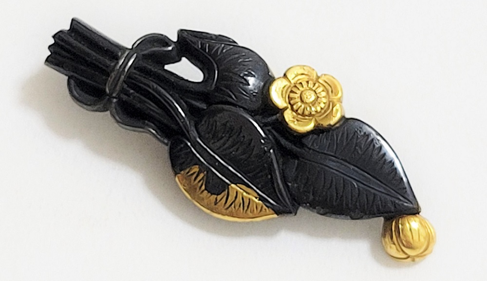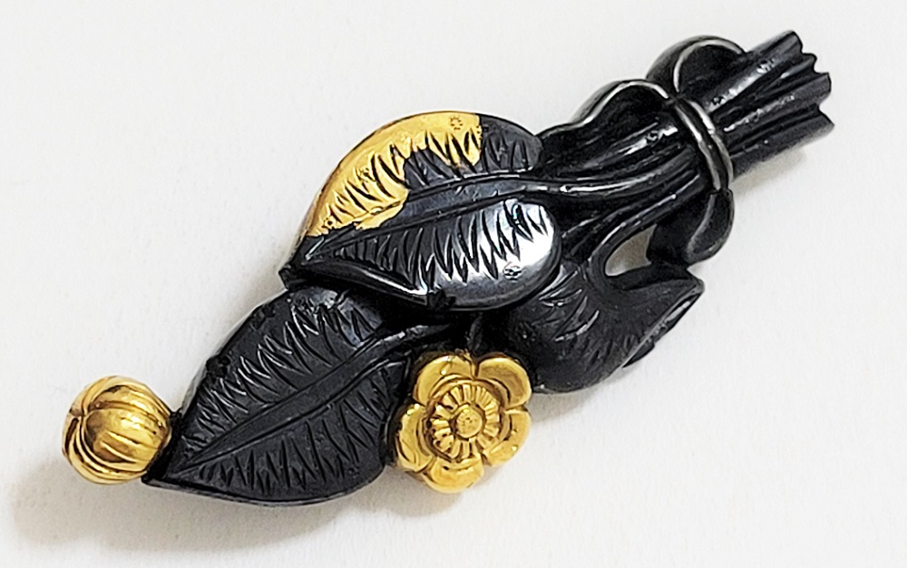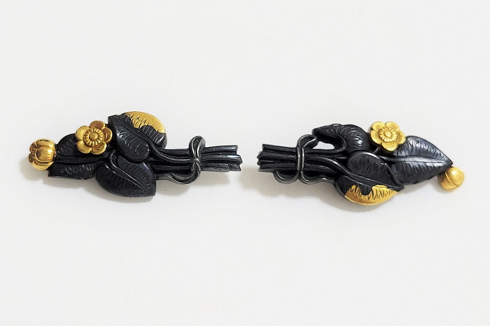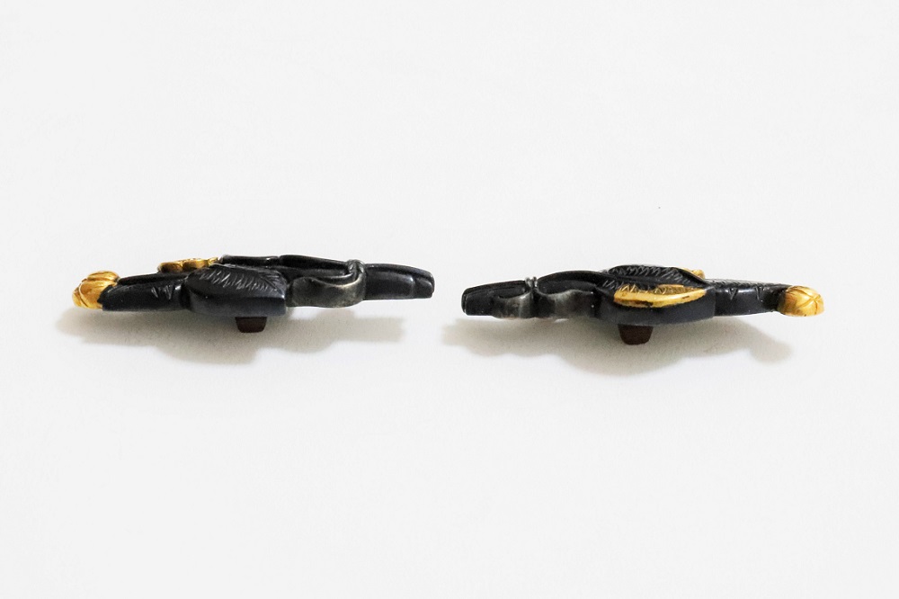| 河骨(こうほね)はスイレン科の植物。白い地下茎が骨のように見えることから河骨と名付けられたという。浅い池や沼に自生し夏に花柄を水上に出し長い花茎の先端に黄色い花を咲かせる。本作は河骨の花と葉を束ねた図柄の目貫。上質の赤銅を用いて金色絵が効果的に施されている。 |