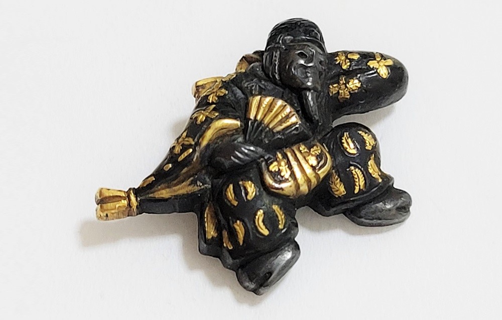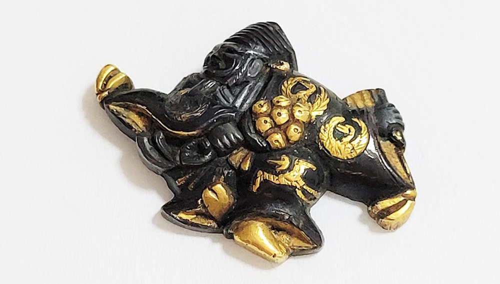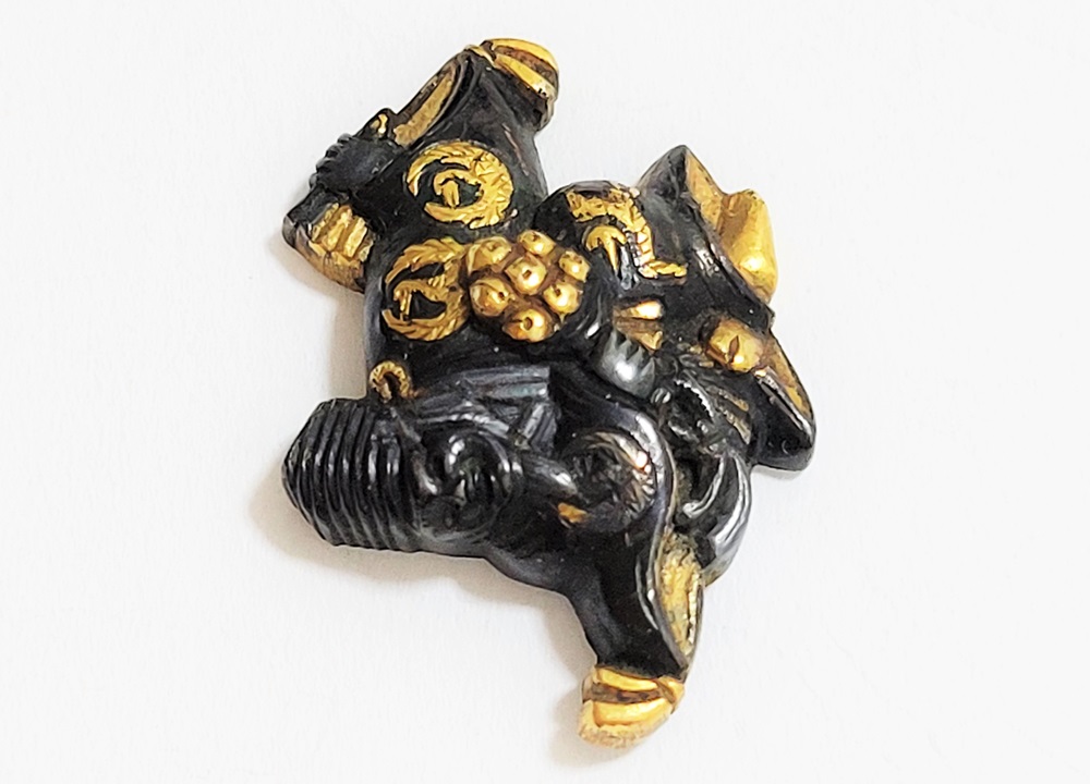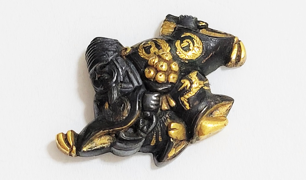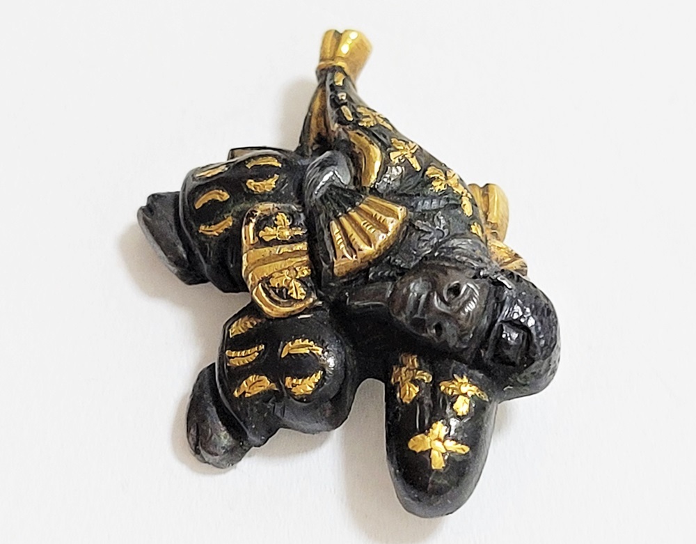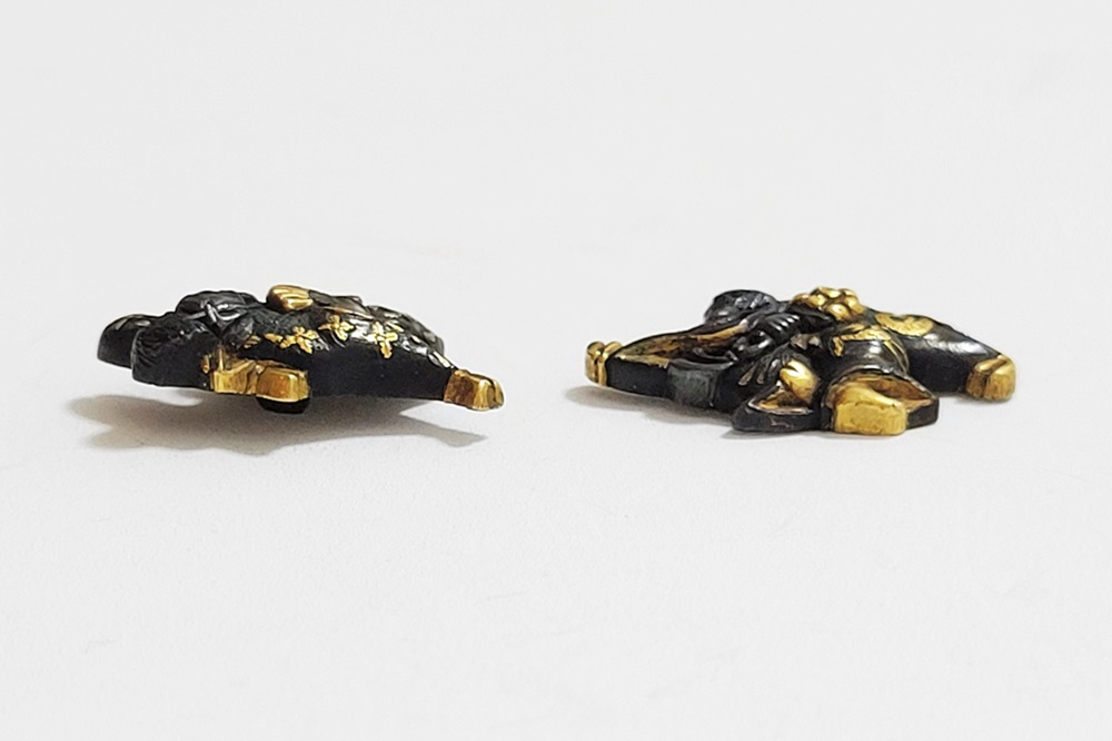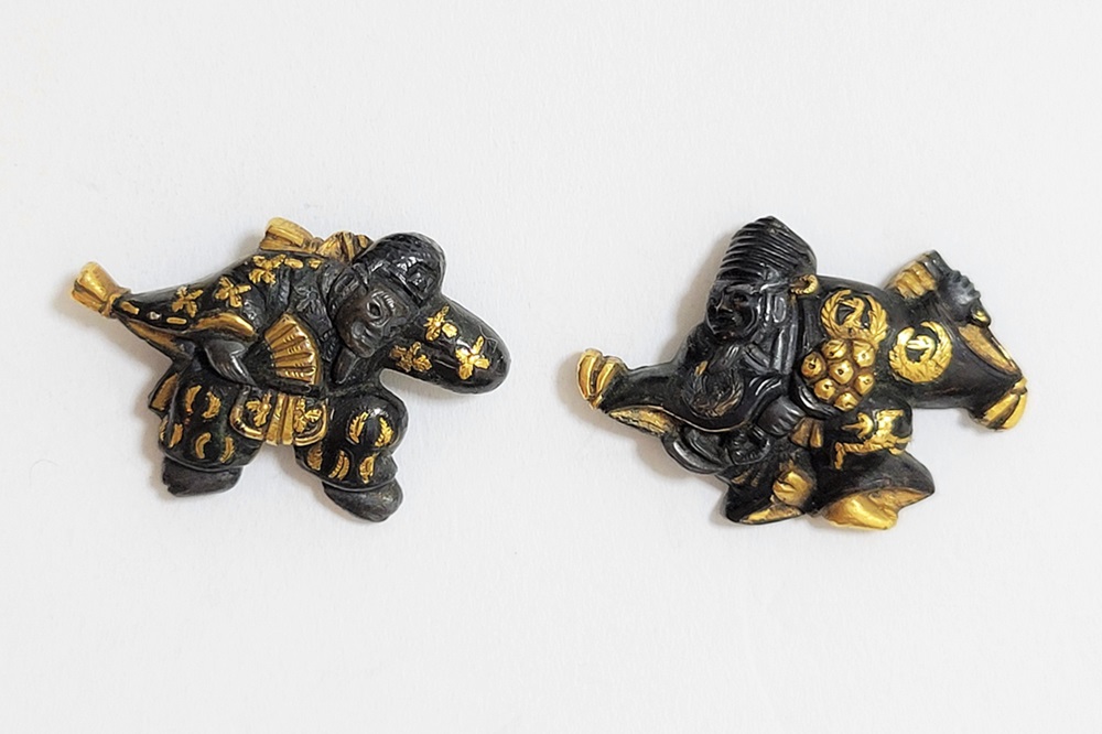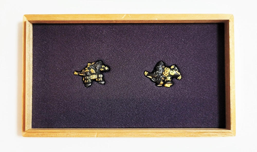 | 「三番叟(さんばそう)」は歌舞伎の演題として知られているが元は能楽からでた天下泰平、五穀豊穣を祈る舞。足利時代では最も重要な曲目であり、お目出度い席では三番叟が演ぜられた。目貫では、祐乗、宗乗、真乗などから一般古後藤と称せられるものなど桃山時代の名工が多く製作。その後後藤十代宗家の廉乗あたりまで見受けられる。顔立ちがきりりとして、動作がのびのびし、少しもかじかんだところがなく象嵌が精巧。こうした三番叟が、名人上手の作と謳われている。本作は後藤宗家七代顕乗と極められた三番叟図目貫。顕乗は後藤家中興の祖といわれる名人で、覚乗と共に江戸時代初期を代表する装剣金工家。後藤徳乗(宗家五代)の次男として天正十四年(1586)に生まれ分家して理兵衛家を創立。元和三年(1617)実兄栄乗(宗家六代)が没し一族合議の結果、宗家七代を継承する。寛永五年(1628)宗家の家督を兄栄乗の次男光重に譲る。その後従兄弟の覚乗と交替で隔年加賀国金沢に出張し前田家から扶持を給される。寛文三年(1663)78歳没。京都住。顕乗のころの目貫の裏の根は、陽根のみとなり、四個の力がねでしっかり止める新しい手法となった。本作は顕乗極めの格調高い三番叟図目貫。2024年5月審査で特別保存審査合格。 |