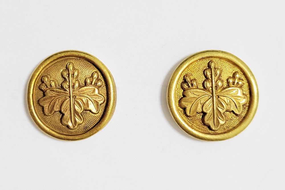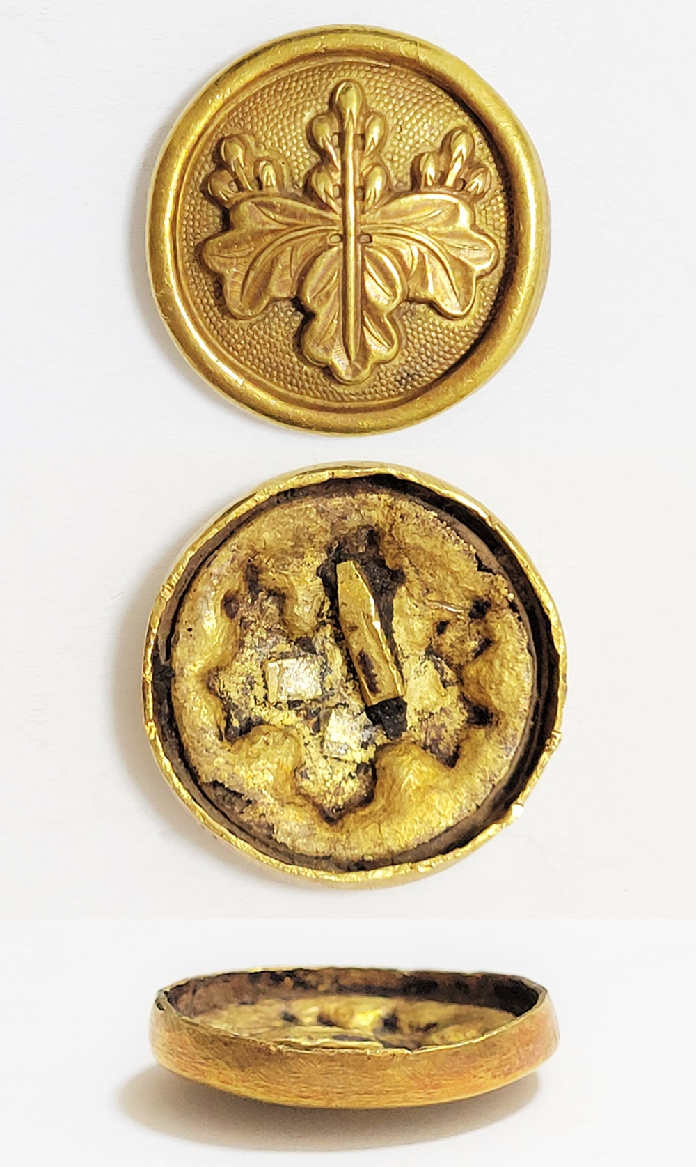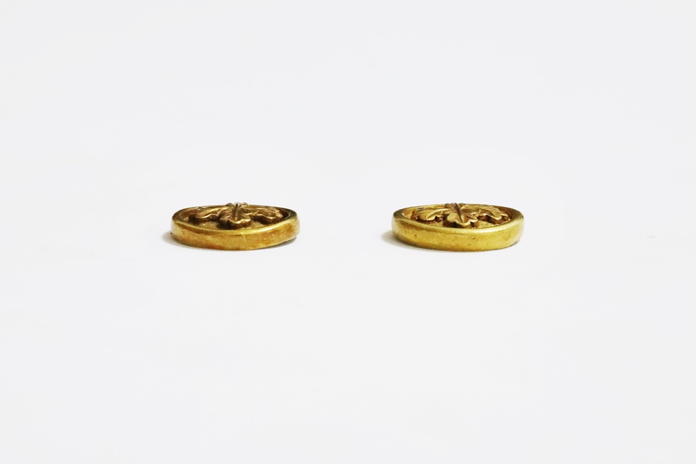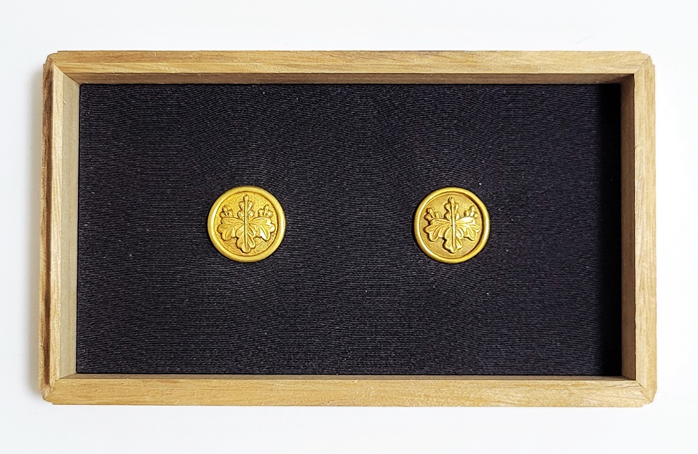 | 栄乗(後藤宗家六代)に極められた金無垢魚子地の五三桐紋図壺傘目貫。栄乗は徳乗(宗家五代)の長男で天正五年(1577)生。文禄三年(1594)に家督を相続。元和三年(1613)41歳没。京都住。自身銘は少なく遺作の多くは後代宗家の極めによる。作風は後藤家の典型的な作で、彫法古風にして大振り、紋高く三代乗真に似る。本作は魚子地に鋤出彫で五三桐紋をあらわす。麦鏨が入った大振りの壺傘金無垢目貫。2010年保存審査合格を2025年2月の刀装具審査で特別保存に昇格。 |
