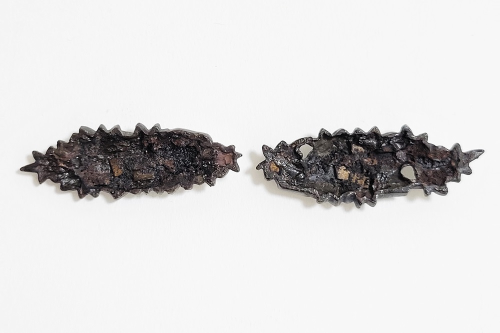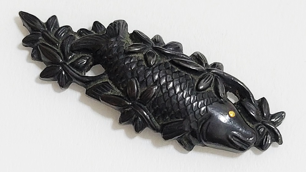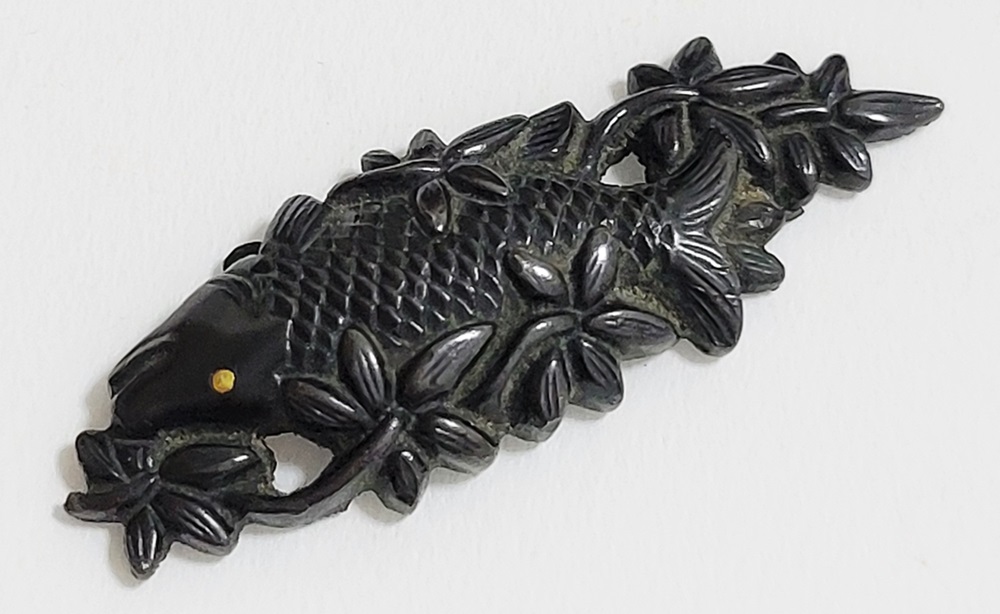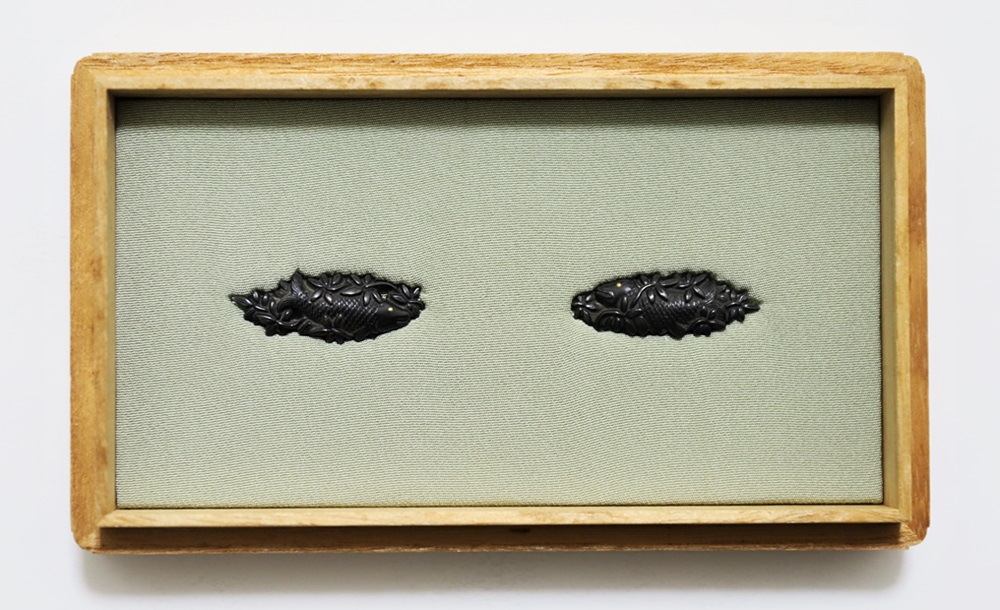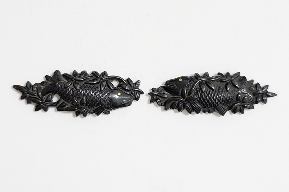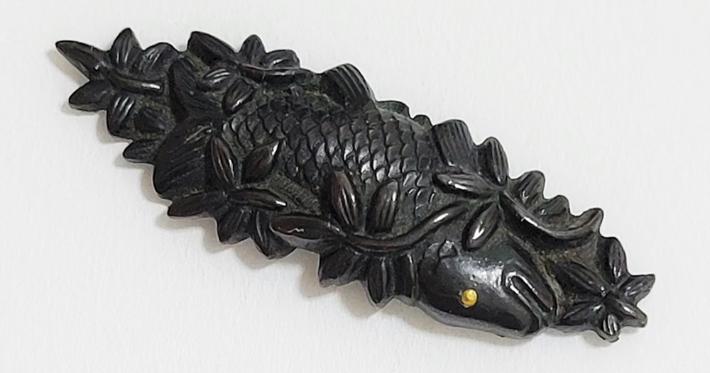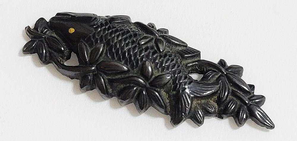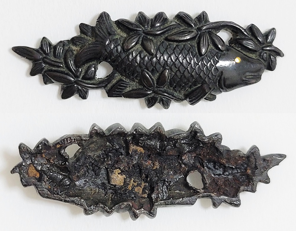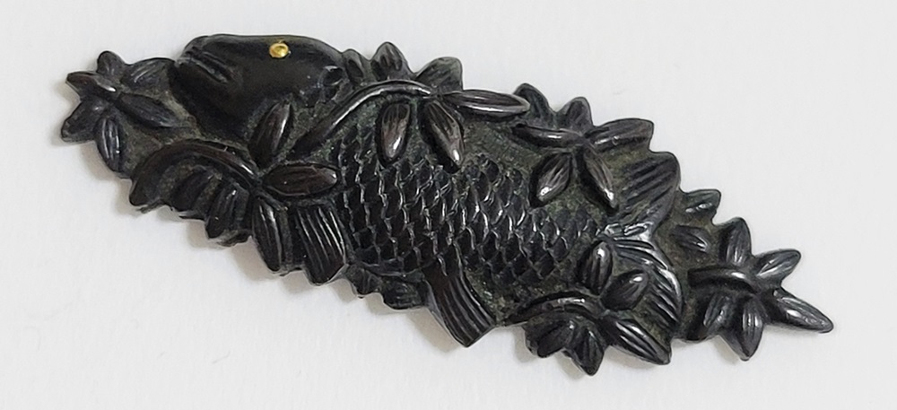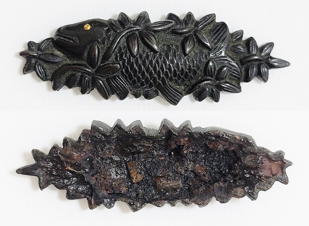 | 藻鯉図は吉兆図。鯉は普段深みに棲むが春から夏の一時期産卵のため川藻の浅瀬にあらわれる。それを古人は「藻出鯉(もいでこい)」として愛でた。あまり見る事のない川魚の長である鯉をみる目出度い徴(しるし)であり、産卵は子孫繁栄の吉祥事。本作は無銘の藻出鯉図目貫。2012年刀装具審査で庄内金工に極められて保存合格。 |