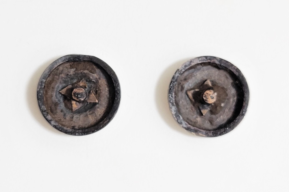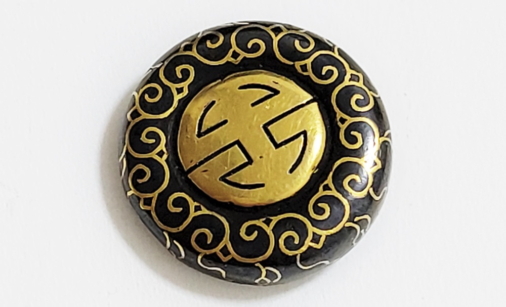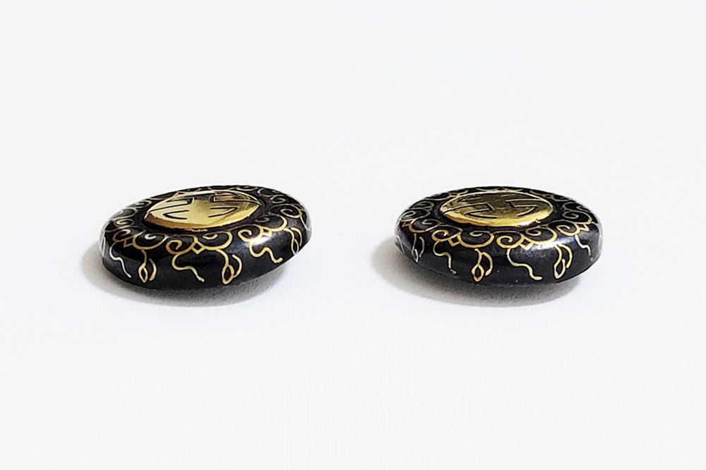 | 外周は唐草模様を赤銅磨地に金の平象嵌で、内円には金で記号のような紋を施す。加賀金工作と思われる優美な壺傘目貫。 |