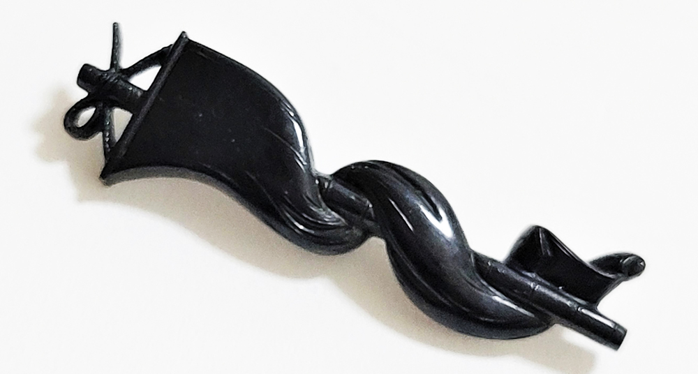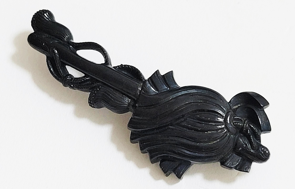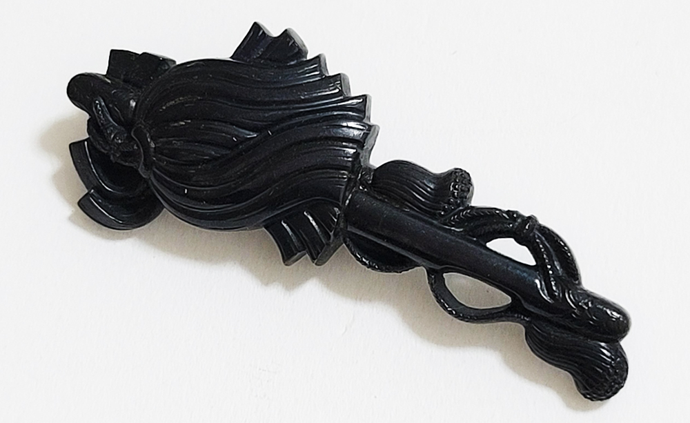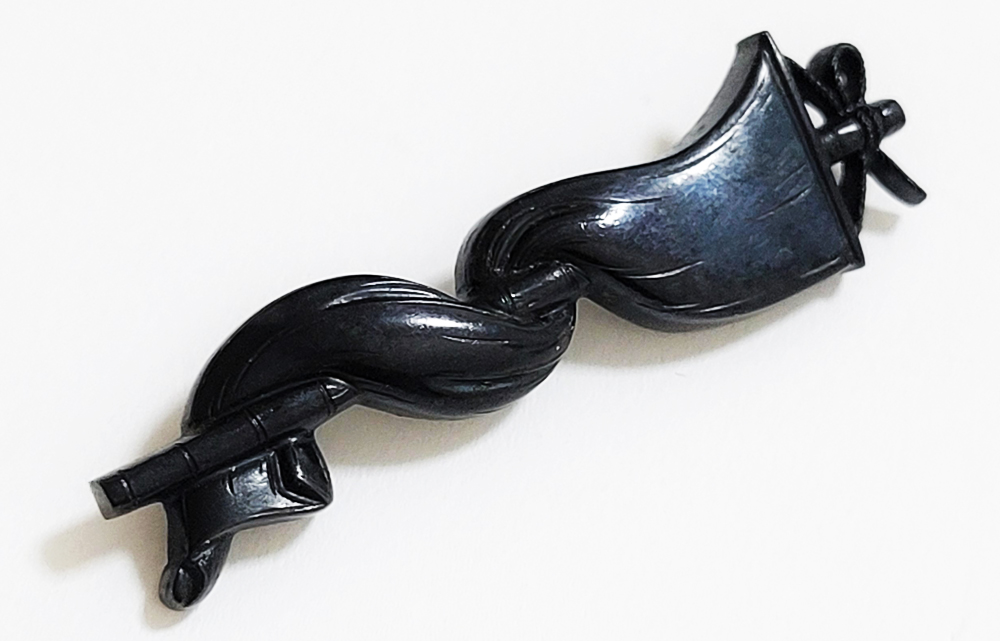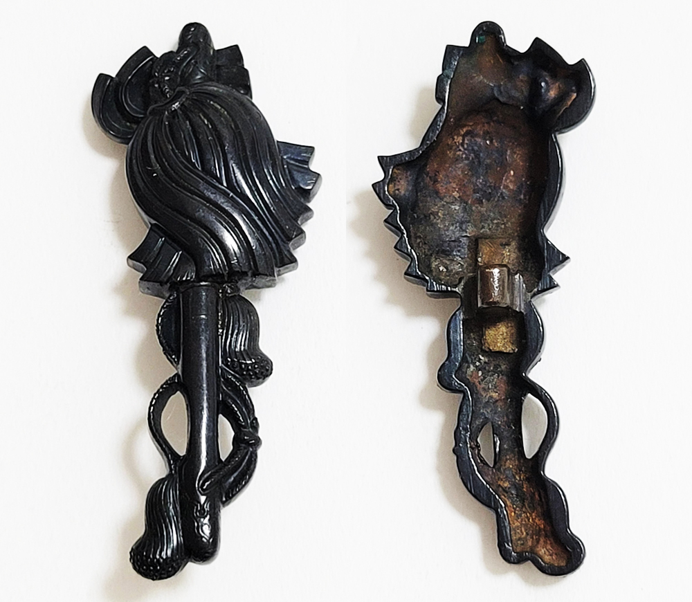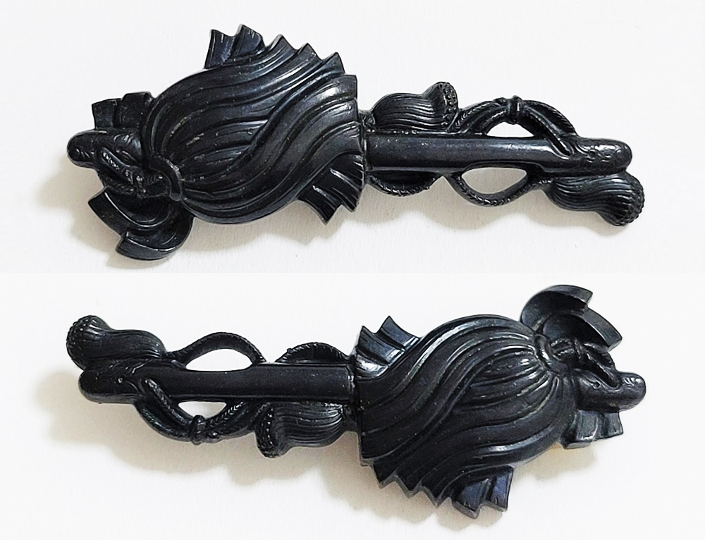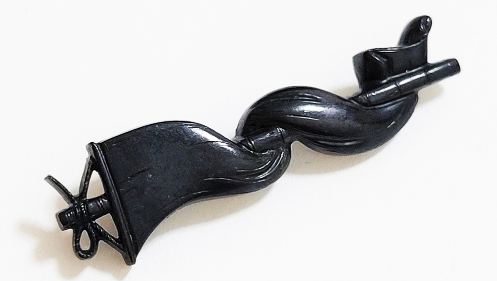 | 戦陣の象徴といえる流し旗と采配の竪図目貫。上質の赤銅のみを用いて、旗の上部にのみ竿を通す流れ旗(軍旗)と大将が陣頭で指揮を振る采配を表現した意匠。2024年11月刀装具審査で脇後藤に極まり保存合格。 |