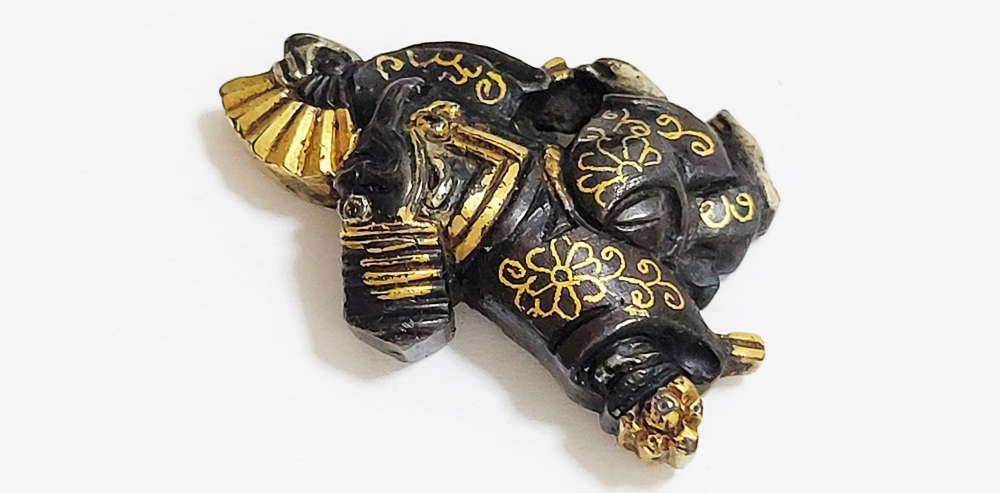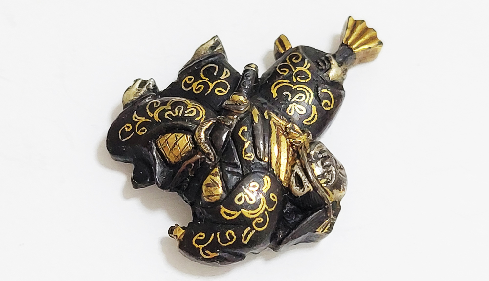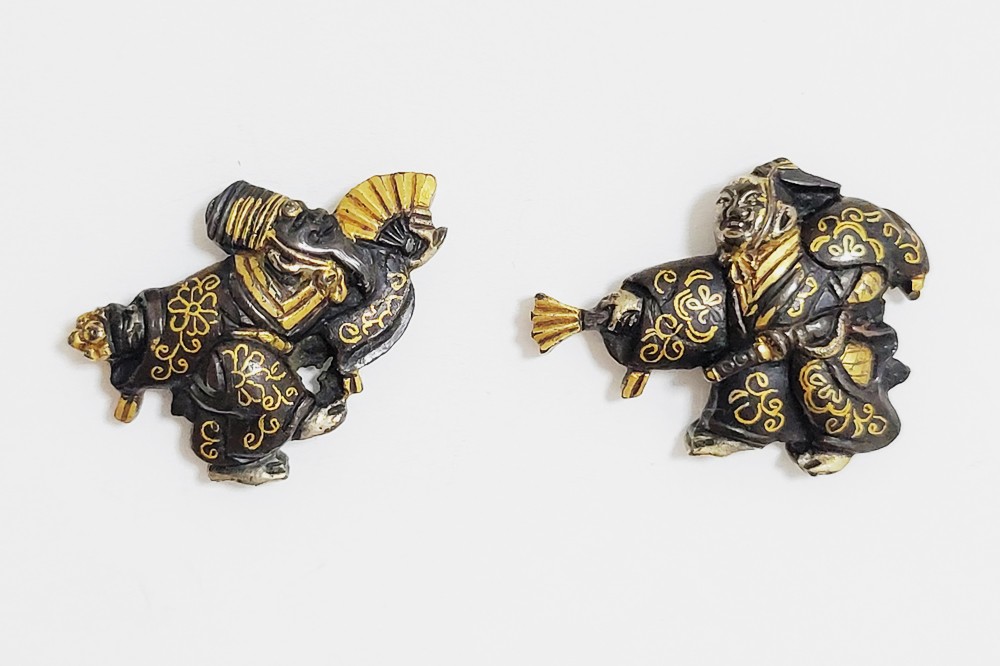 三番叟(さんばそう)は天下泰平を願い、五穀豊穣を祝う能楽のめでたい演目。黒尉(こくじょう)の面を付けて鈴を振って舞う表目貫と面をつけない直面(ひためん)で足拍子を踏みしめ力強く舞う裏目貫。落し箱に納められ見映えする。2010年刀装具審査で京金具師に極められ保存合格。