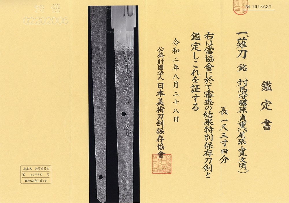 対馬守藤原貞重は尾張名古屋住、大阪にても造る。越中守貞幸門。良き業物刀工。本作は同工によるめずらしい薙刀作。焼幅広く健全で出来が良い。2020年6月審査で特別保存刀剣合格。