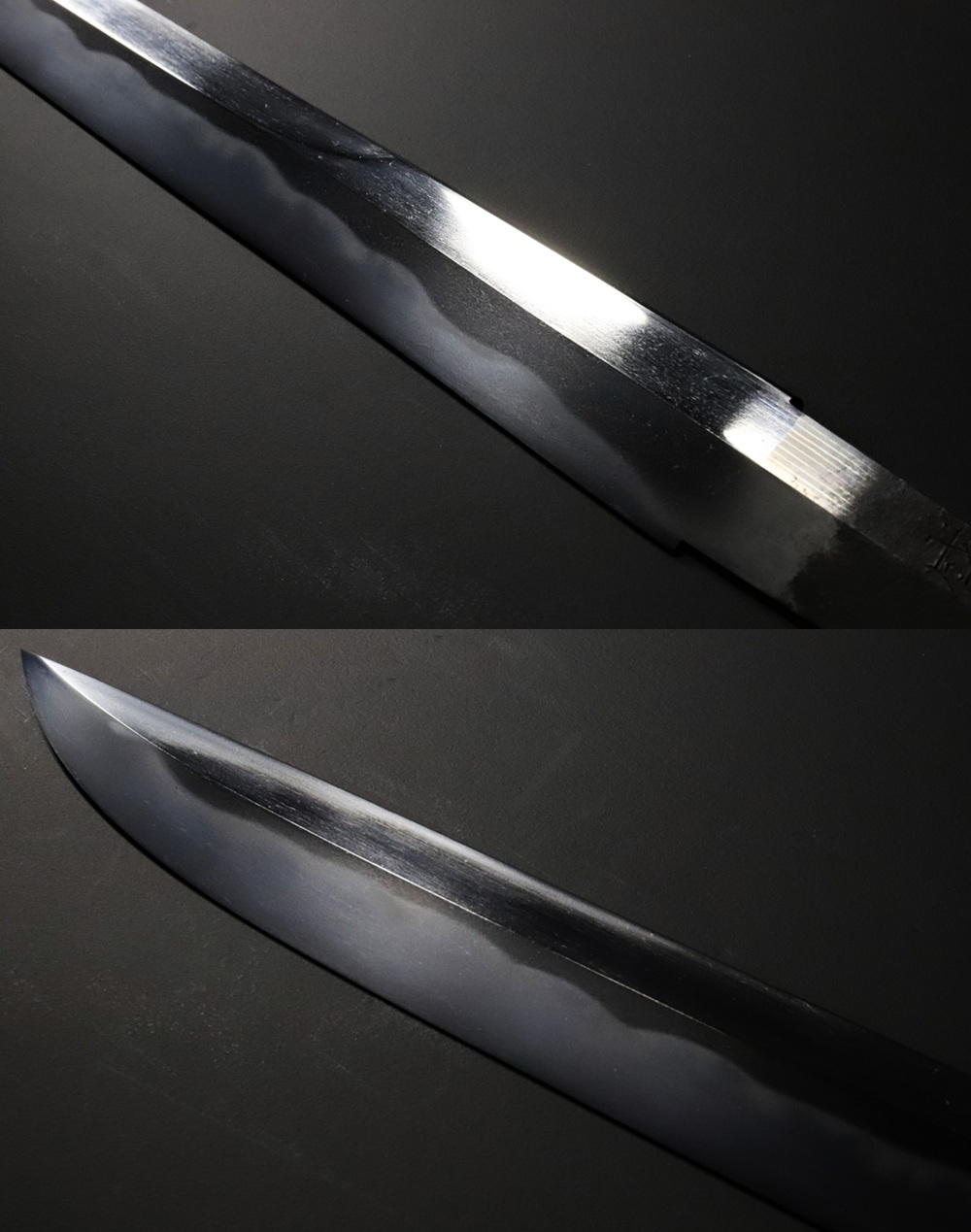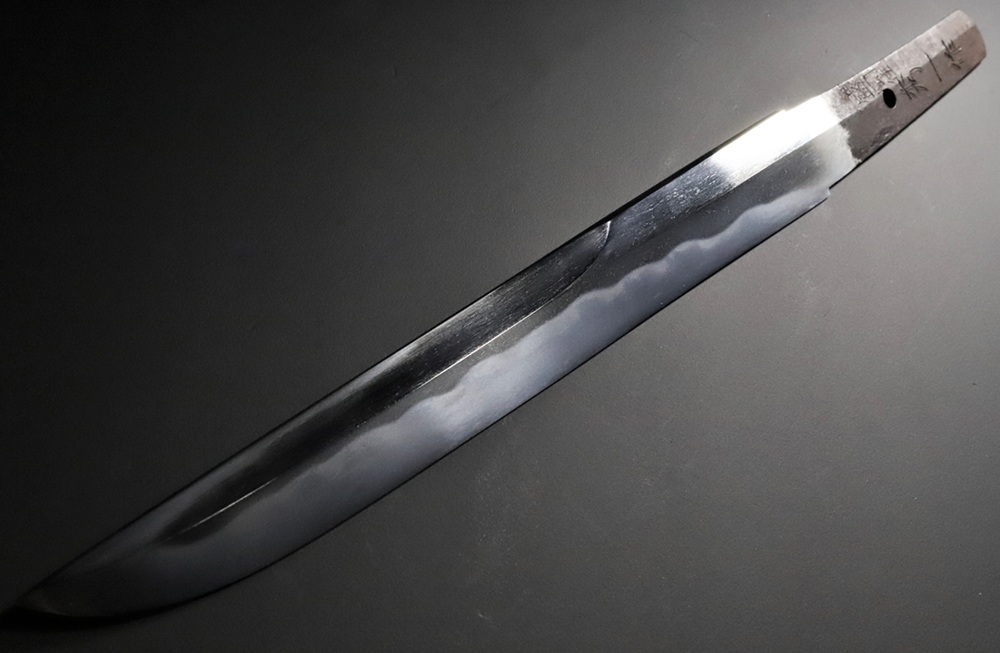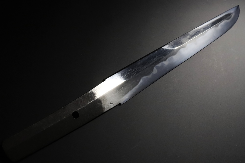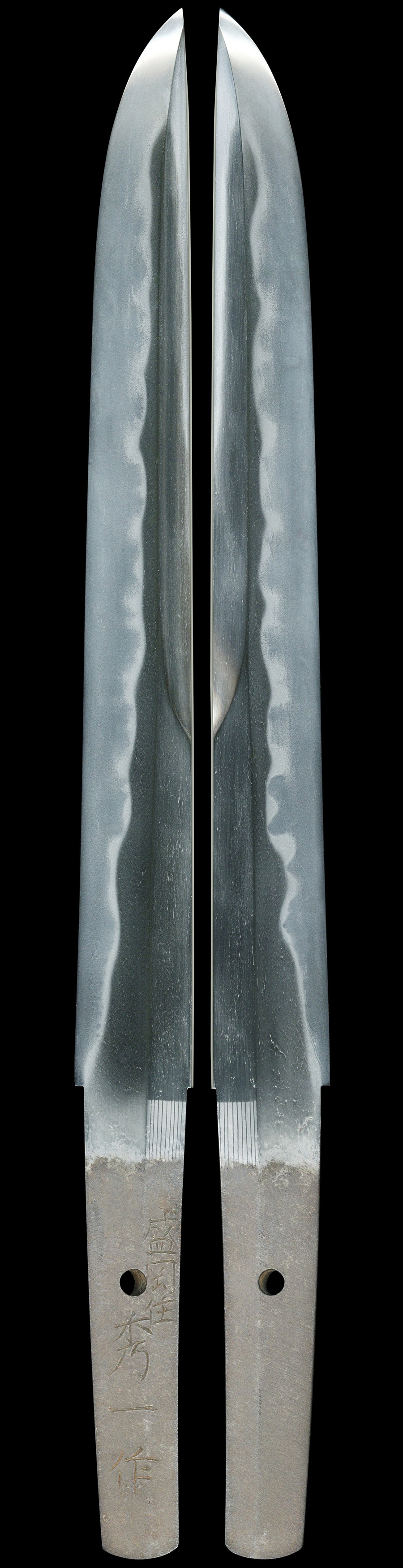 | 盛岡住秀一(ひでかず)は宮川庄右衛門。文化十年(1813)二子通轟村(現花巻市)生まれ。天保十四年(1843)藩士栃内与兵衛(三百石格)に従って江戸に上り、七代石堂運寿是一の門人となって刀鎗鍛練の修業を積む。業成り嘉永五年(1852)帰途に就く。安政二年(1855)頃南部藩抱工。冶明治20年(1887)没。年紀作は嘉永二年から明治三年(1849-1890)を遺す。本作は腰部上の鎬地を削いだ変り鵜の首造り。黒石目地塗合口拵が付されている。2025年特別保存刀剣審査合格。 |