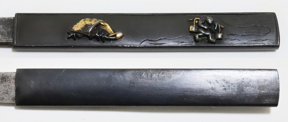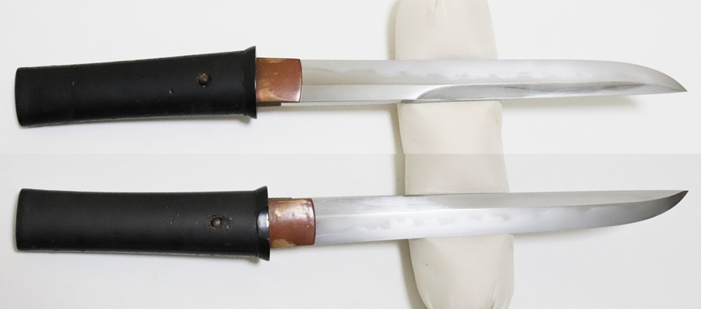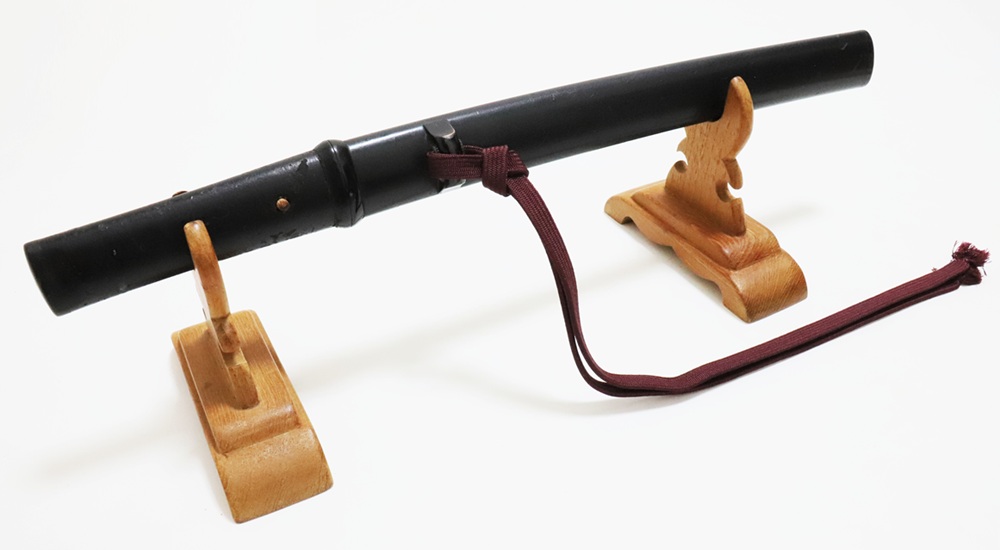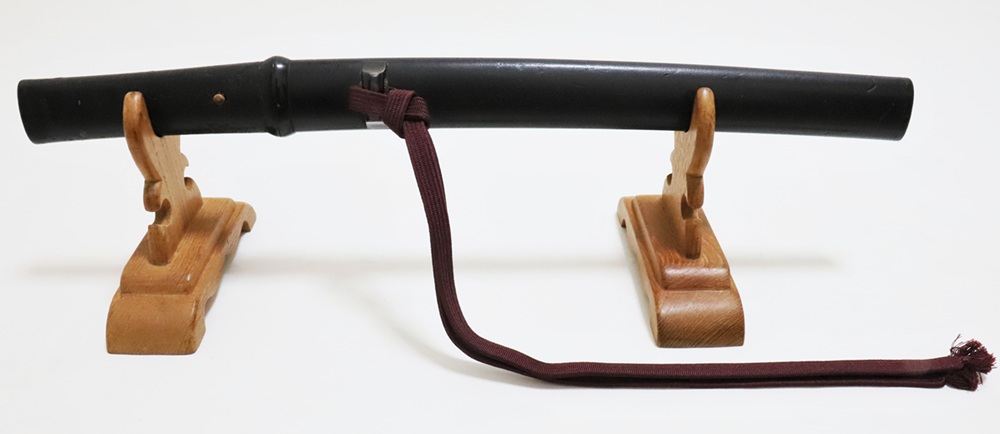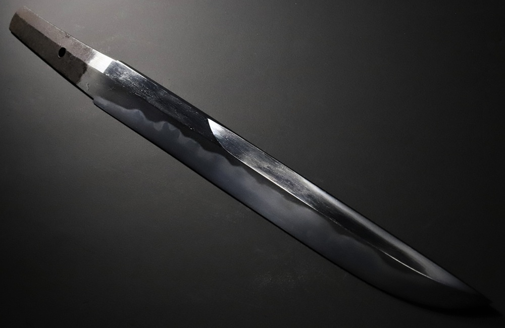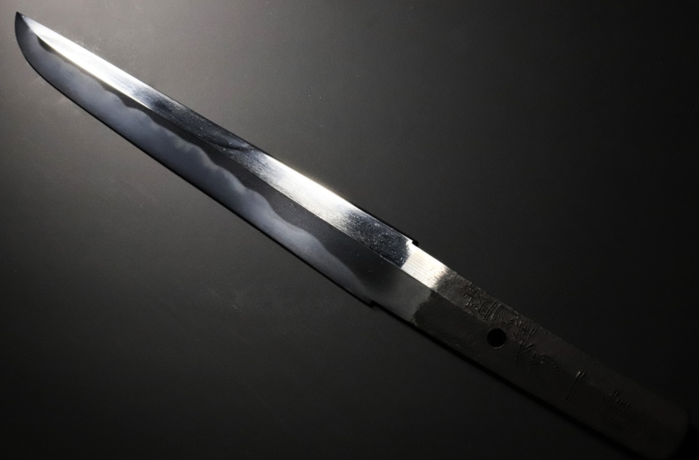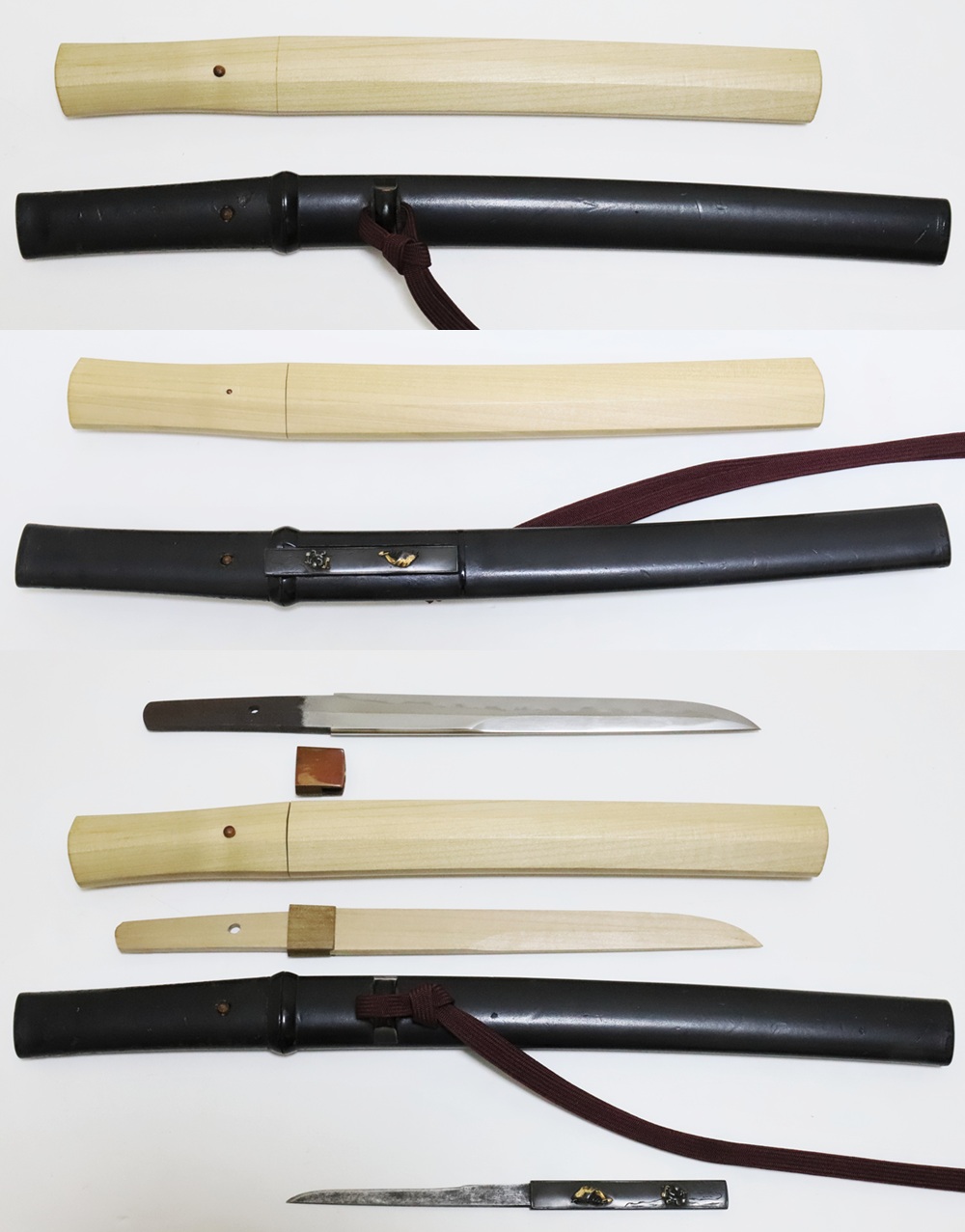 | 盛岡住秀一(ひでかず)は宮川庄右衛門。文化十年(1813)二子通轟村(現花巻市)生まれ。天保十四年(1843)藩士栃内与兵衛(三百石格)に従って江戸に上り、七代石堂運寿是一の門人となって刀鎗鍛練の修業を積む。業成り嘉永五年(1852)帰途に就く。安政二年(1855)頃南部藩抱工。冶明治20年(1887)没。年紀作は嘉永二年から明治三年(1849-1890)を遺す。本作は腰部上の鎬地を削いだ変り鵜の首造り。黒石目地塗合口拵が付されている。2025年特別保存刀剣審査合格。 |