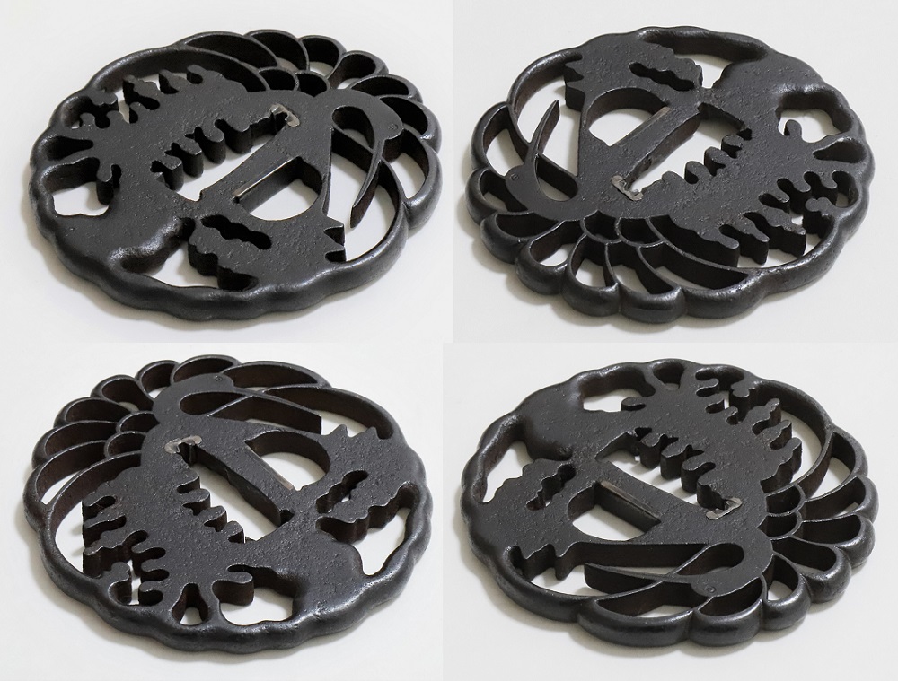 | 林は肥後金工の一派。肥後金工は藩主細川家の庇護によって発達し肥後独特の刀装、肥後拵に掛けるためにつくられた。実用に適してよく鍛錬された鉄鐔である。林派の初代林又七は慶長十年(1605)生まれ。一派の基礎を固めた肥後金工を代表する名人。二代重光も技量に優れ、以下三代藤八、四代平蔵、五代又平、六代又八、七代藤八と続いた。本作は精美な地鉄の格調高い人気の鐔。2020年1月審査で特別保存刀装具合格。 |