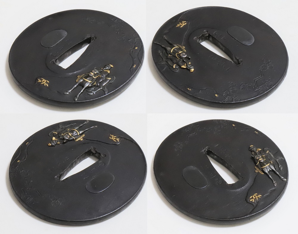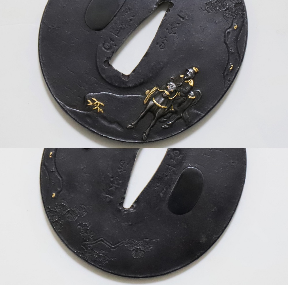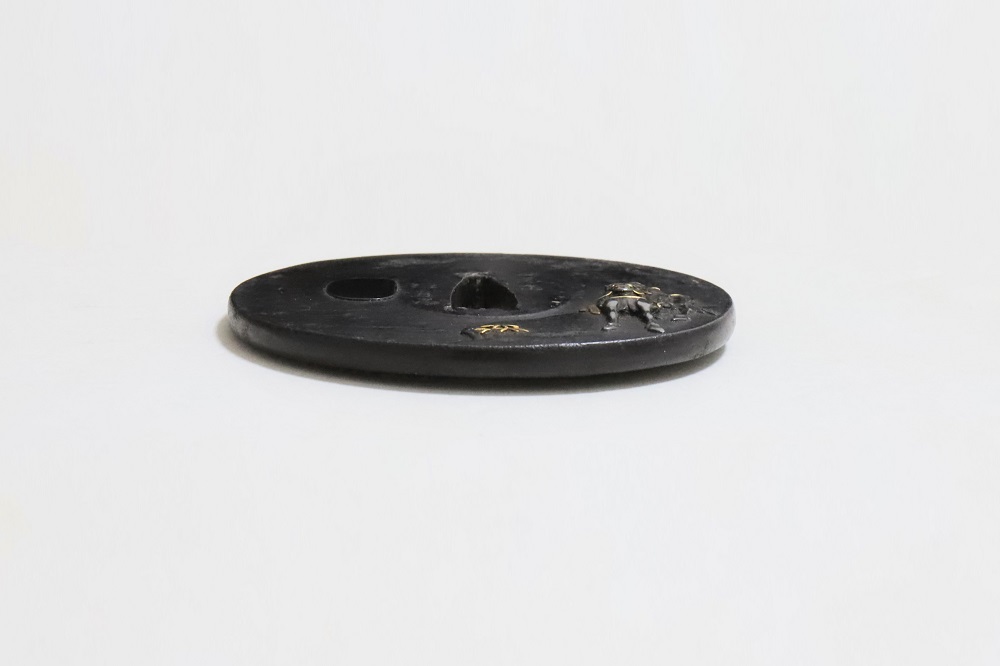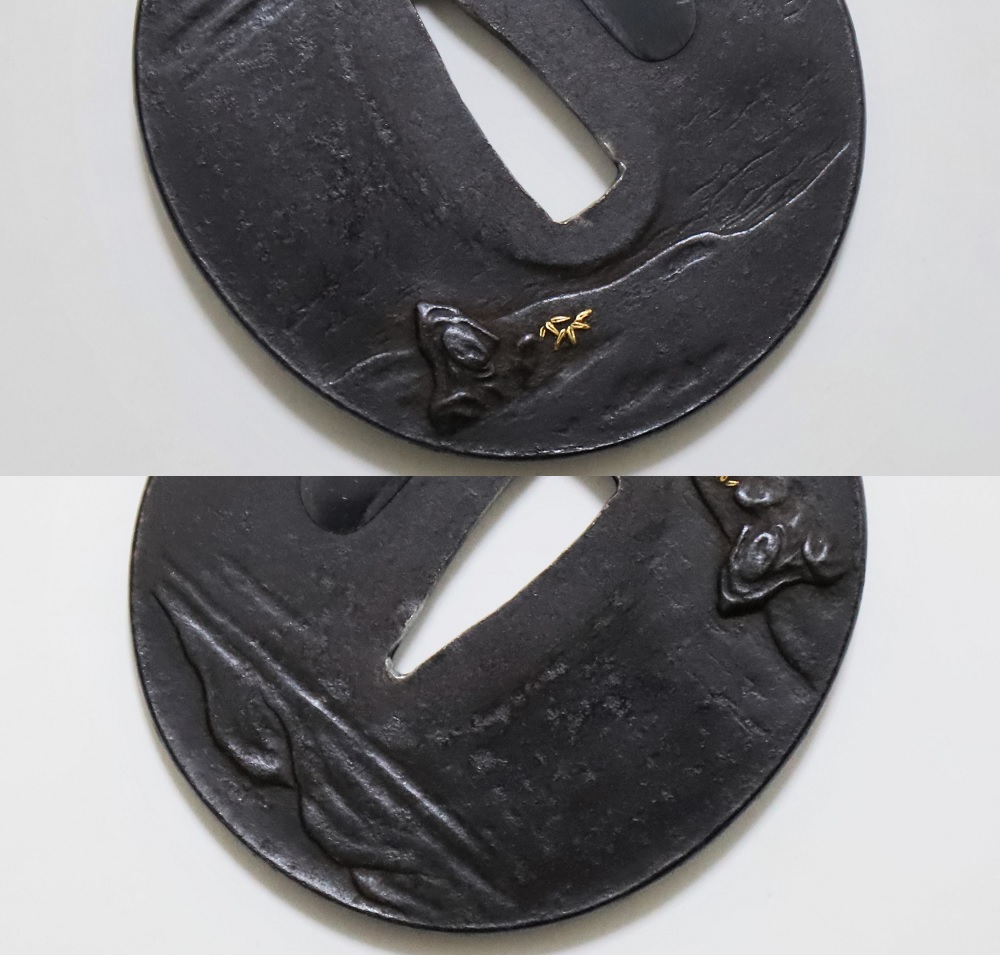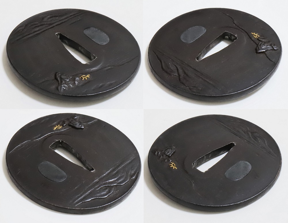 一葉斎弘直は打越弘寿の門人で江戸時代後期の水戸金工。本作は、精錬された鉄、僅かな鋤残耳、簡素ながらも広がりを想起させる構図と彫法で非の打ち所がないと感じ得る上出来の名鐔。