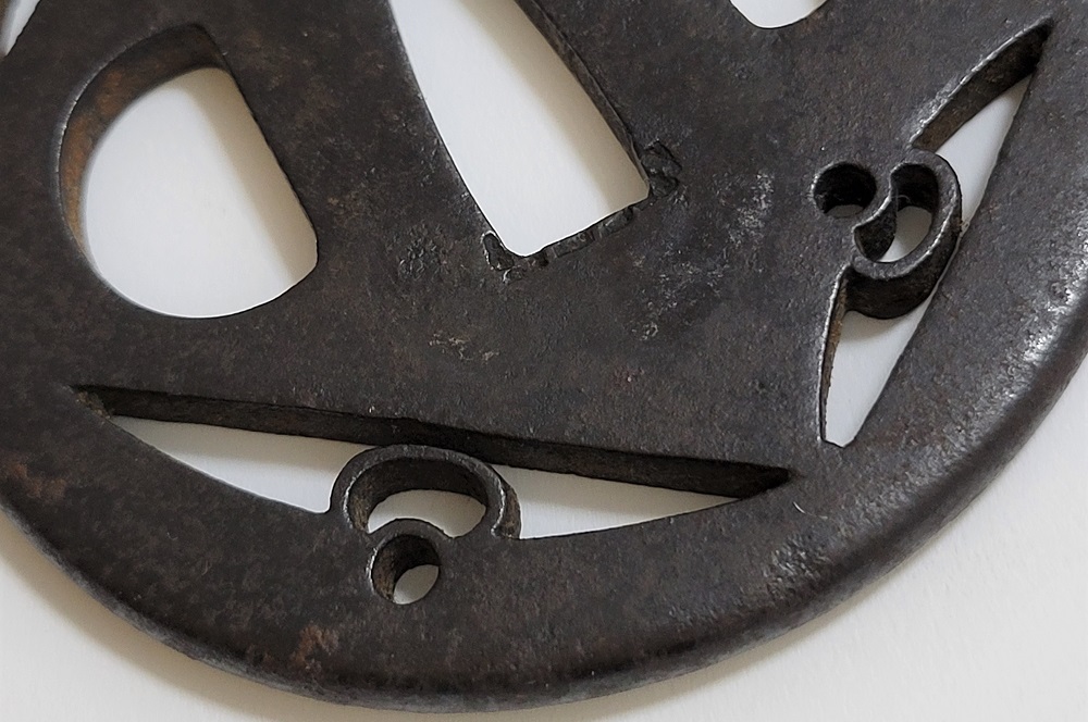 | 神吉と極められた肥後鐔。神吉(かみよし)は肥後金工の一派。藩主細川公が肥後金工の伝統を守るために技量の優れた林家(初代又七、二代重光)の三代藤八に命じて神吉寿平に林家の秘法すべてを相伝させ、その息子深信(寛政十年1798-嘉永四年1851)と楽寿(文化十四年1817-明治十四年1884)親子が近世の名工として名を馳せた。本作は、茎櫃の責鏨に特徴がある。構図は四方に菅笠(すげがさ)を配するが対称でなく、その意図に思いが巡る。 |
