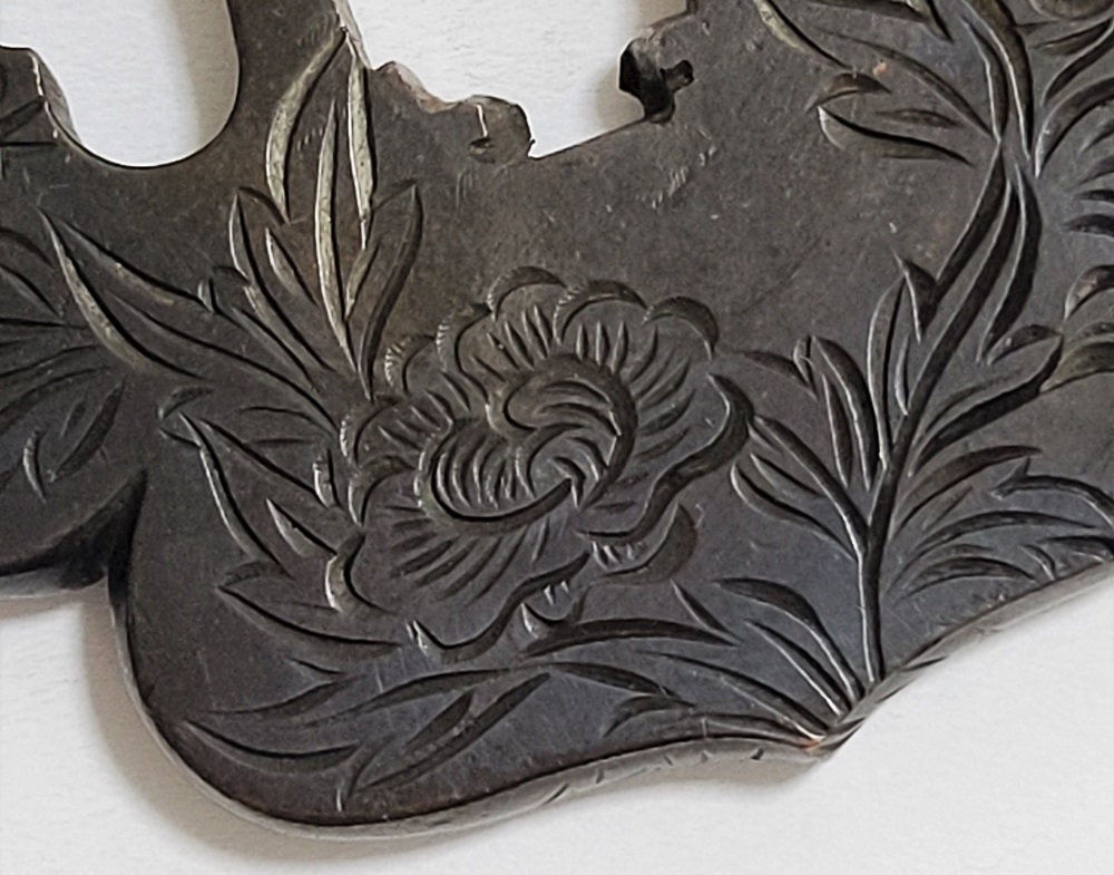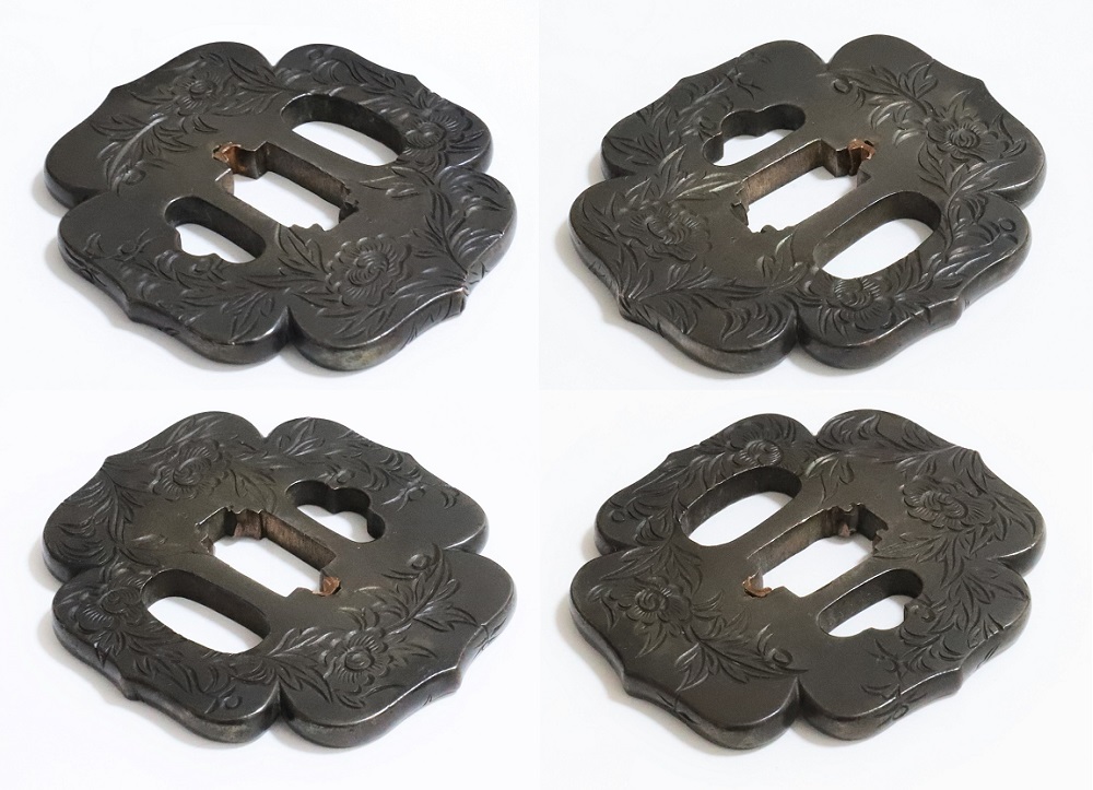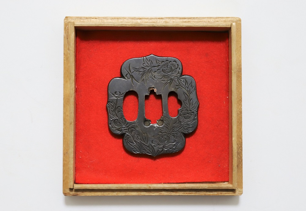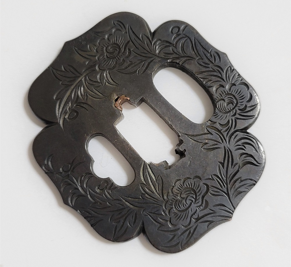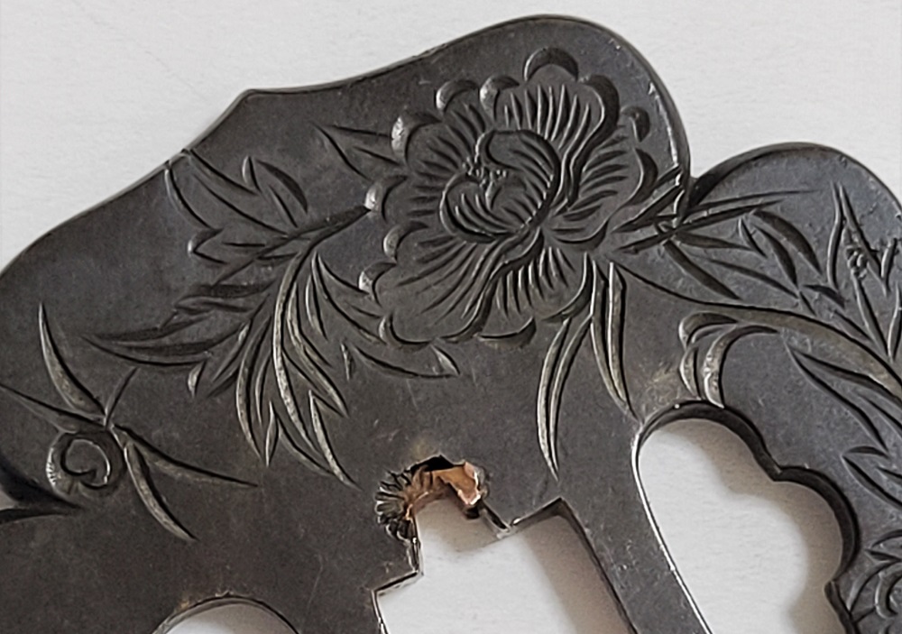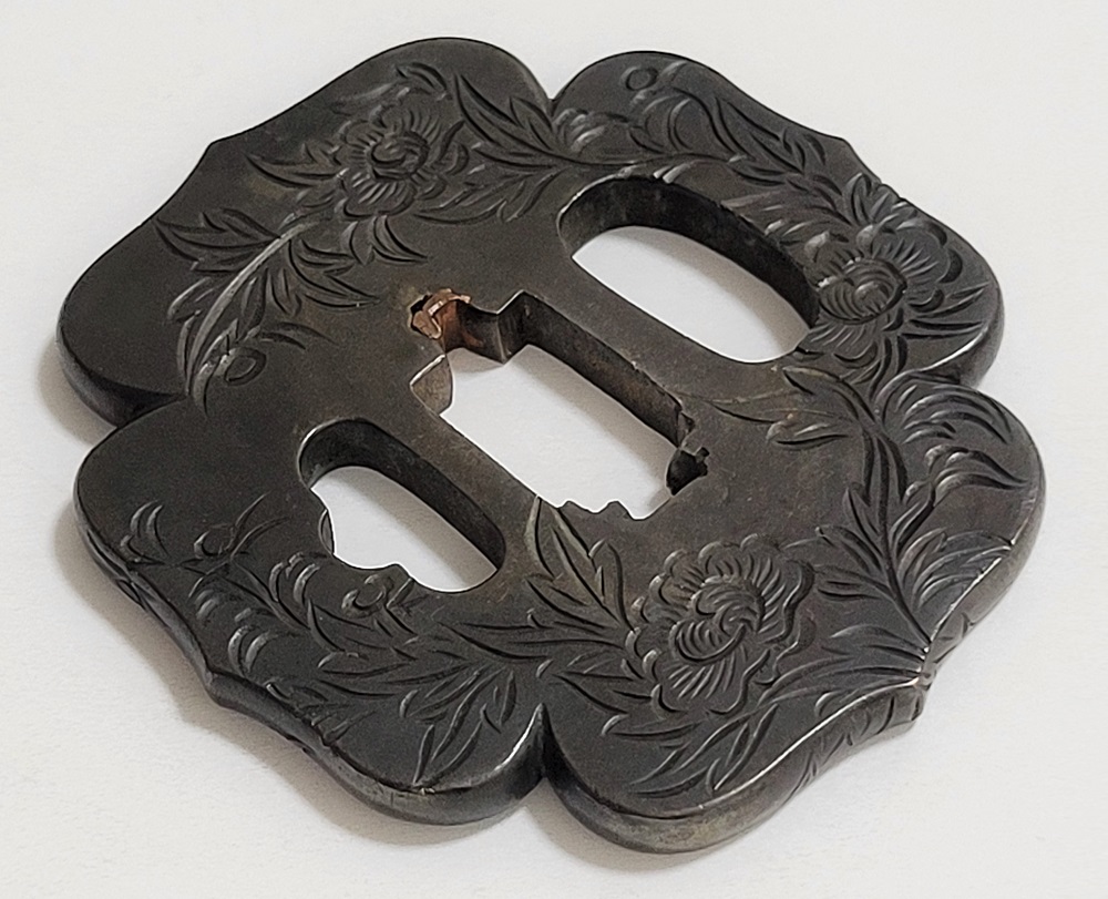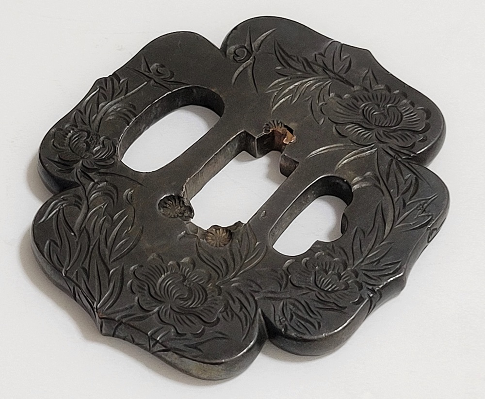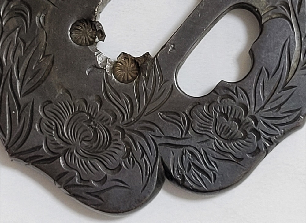 | 茎櫃孔や菊座鏨の責め方から特殊に作られた鐔であろう。四分一磨地、太刀木瓜小形、片切彫の牡丹図鐔。 |