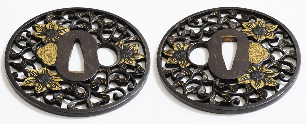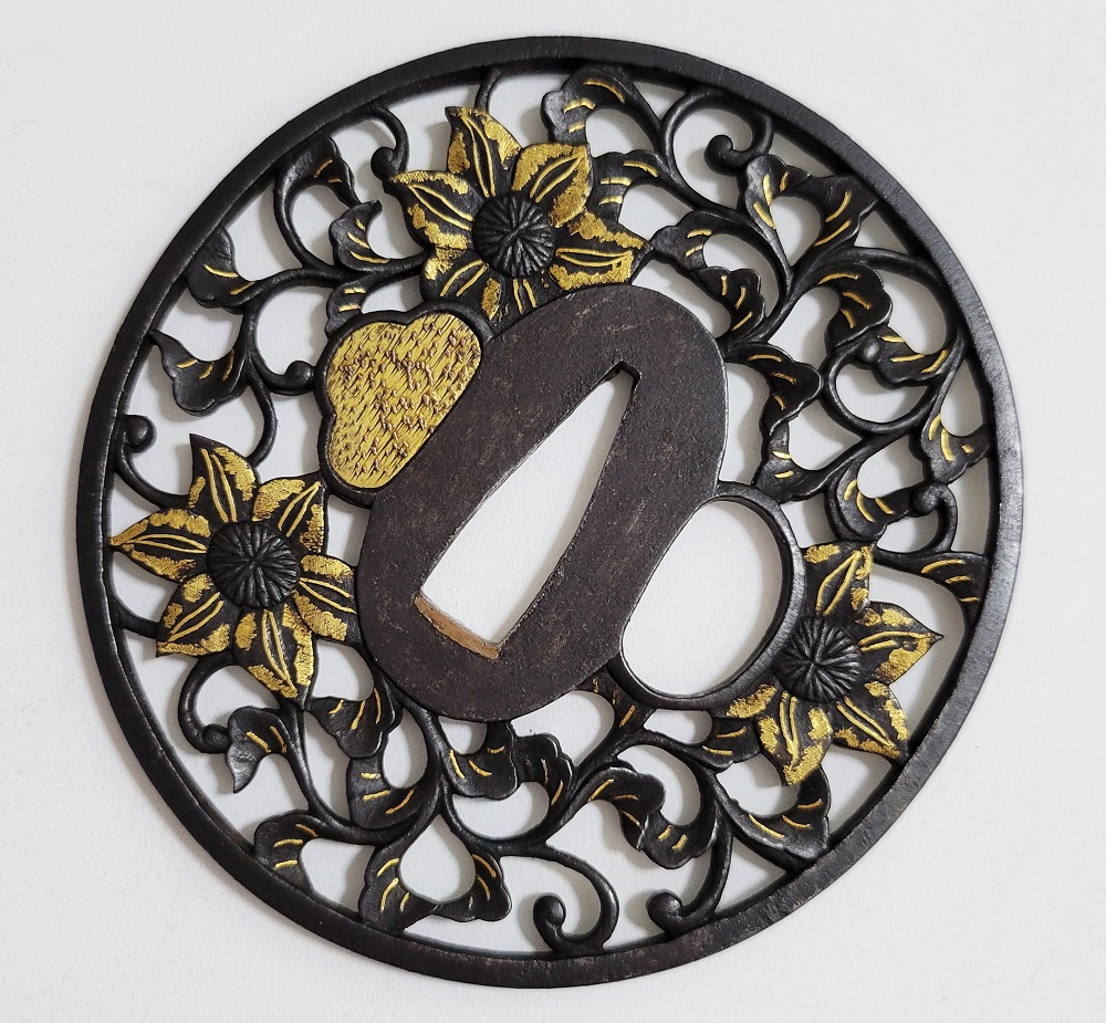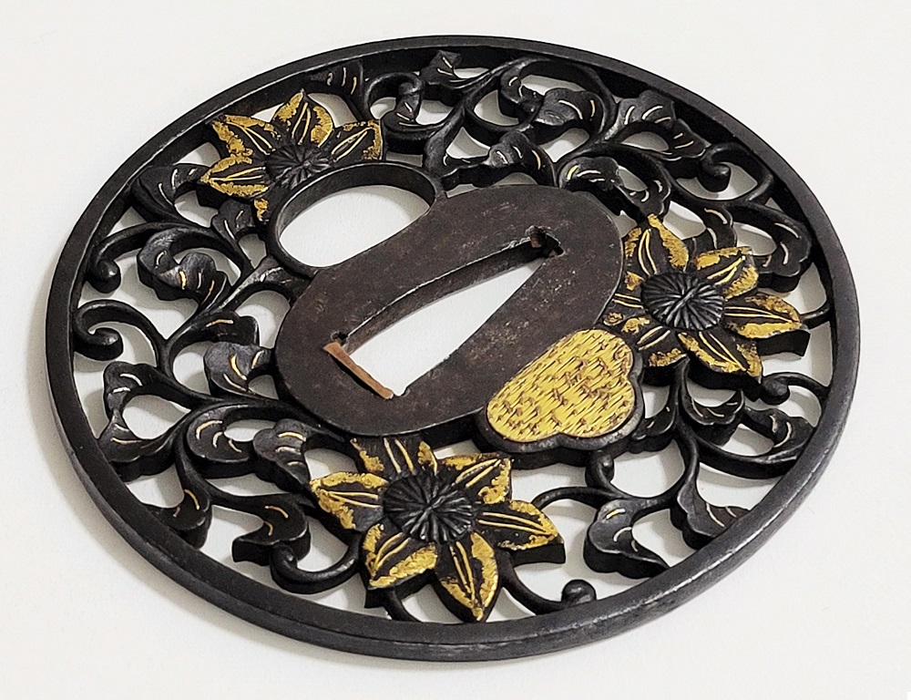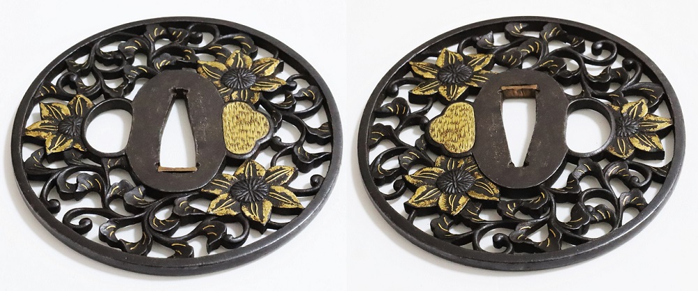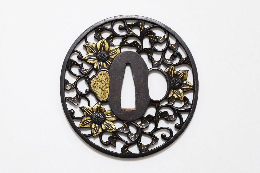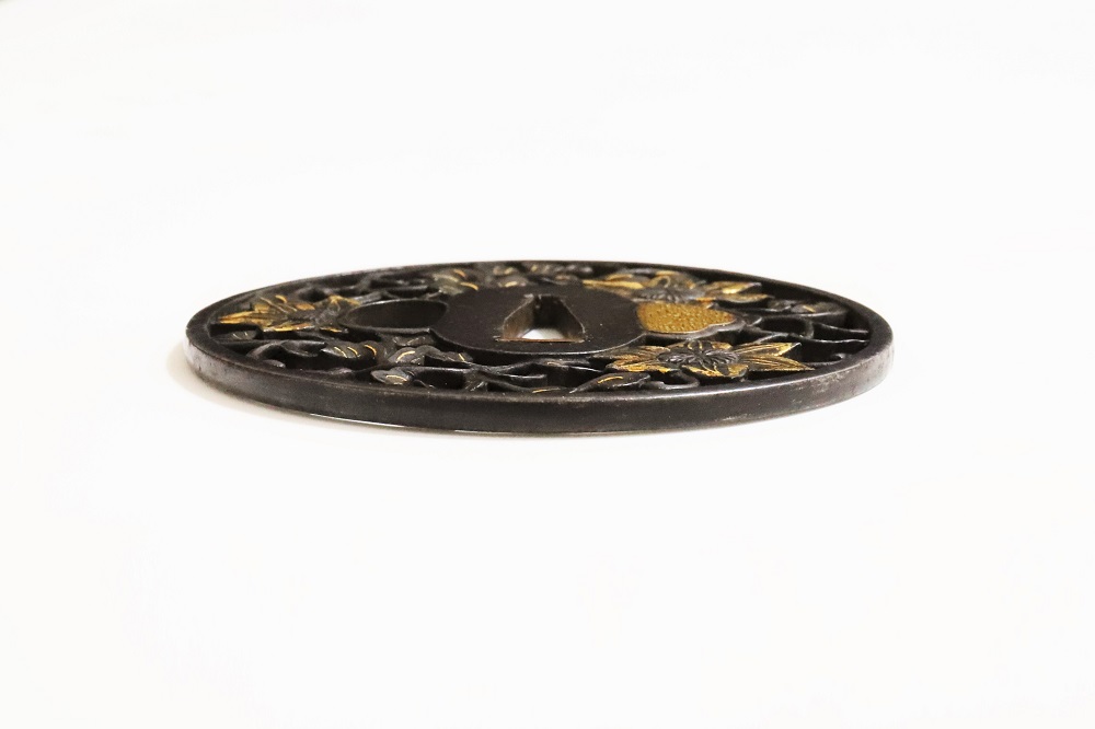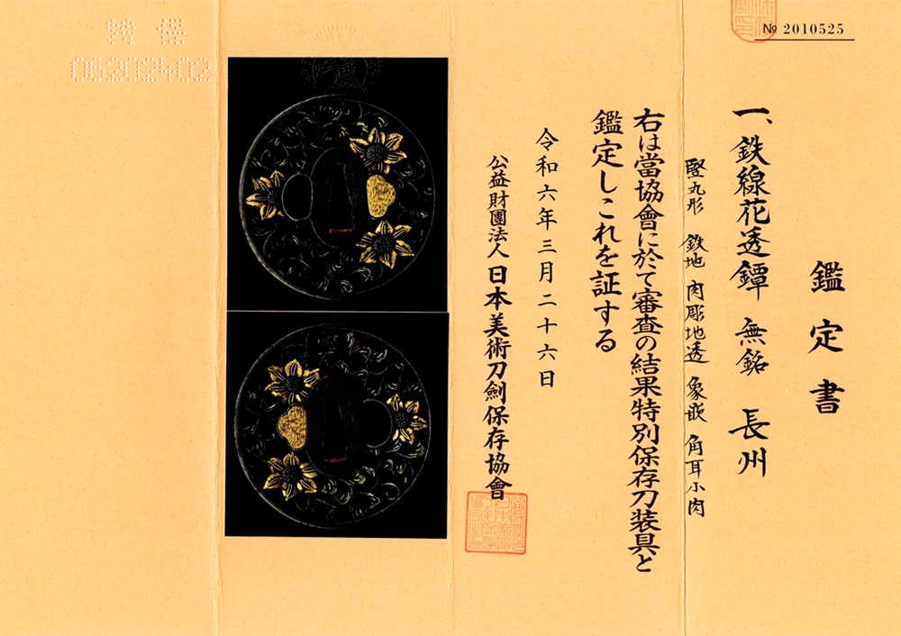 | 毛利家を藩主とする長州藩は、多くの鐔工を抱えて財政を潤すべく積極的に作鐔をおこない他国に鐔を供給。長州鐔は拵に用いて釣合いよく広く一般に愛好された。河治、中井、岡本の三家が主流をなし繁栄した。特徴は鉄を磨仕上げとし密画風に画面一杯綿密に山水、草花図を肉彫地透し象嵌を施す。本作は2024年2月審査で「長州」に極められ特別保存合格。精巧優美な鐔。 |