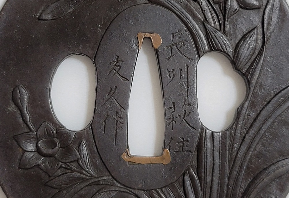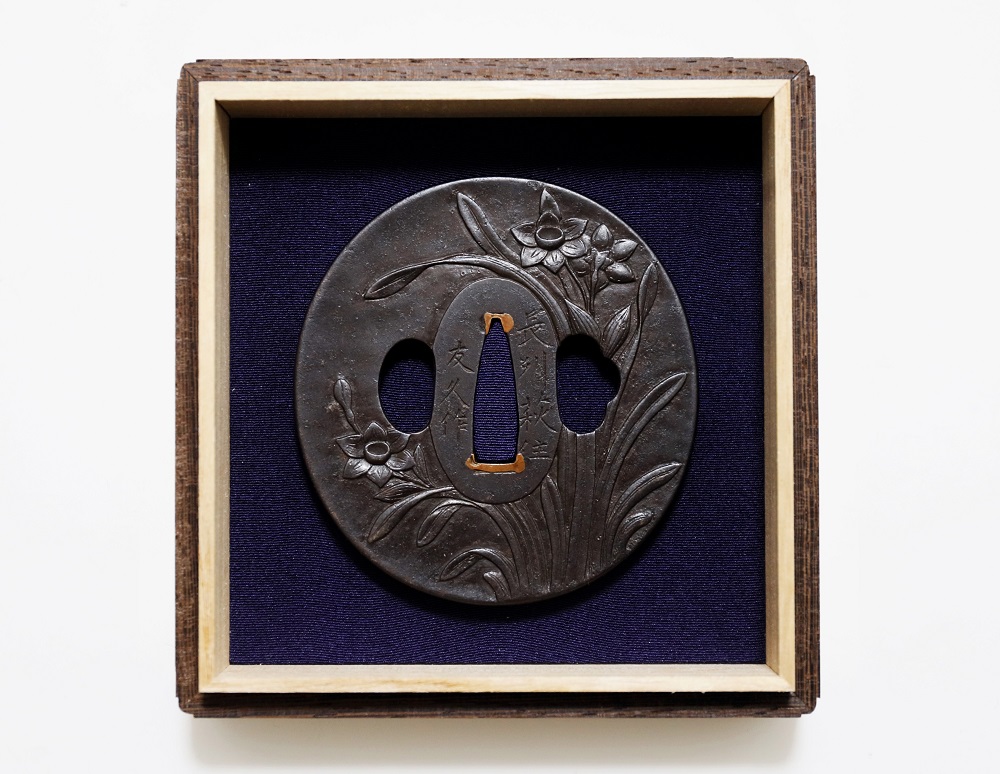 | 長州は、藩公の奨励もあり他国他藩に広く輸出されて全国で最も鐔工が多い。長州鐔は拵に用いて釣合いが良く広く愛好された。本作は竪丸形やや厚手に鍛錬の良い地鉄が用いられ精巧な鋤出彫で水仙を描く。江戸時代後期の典型的かつ長州鐔の優品。特別保存刀装具。 |