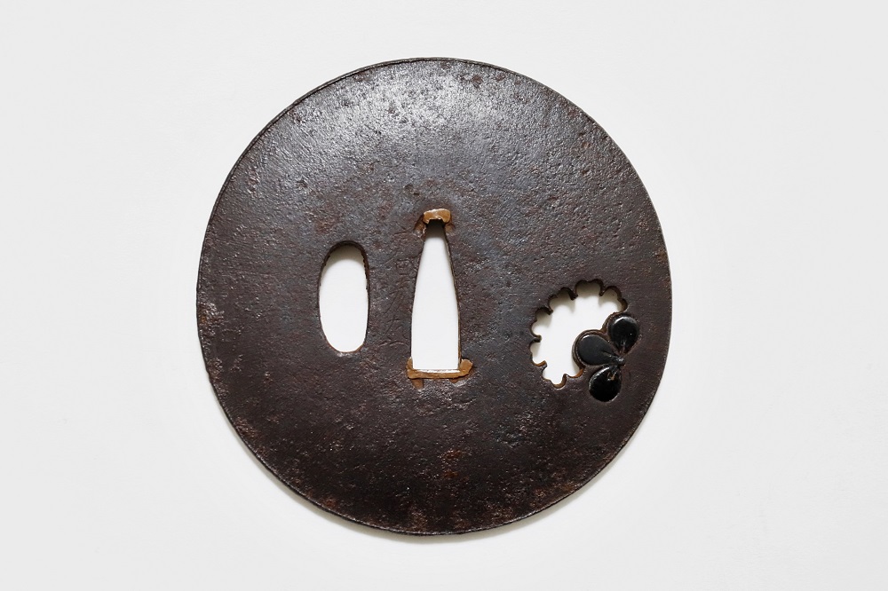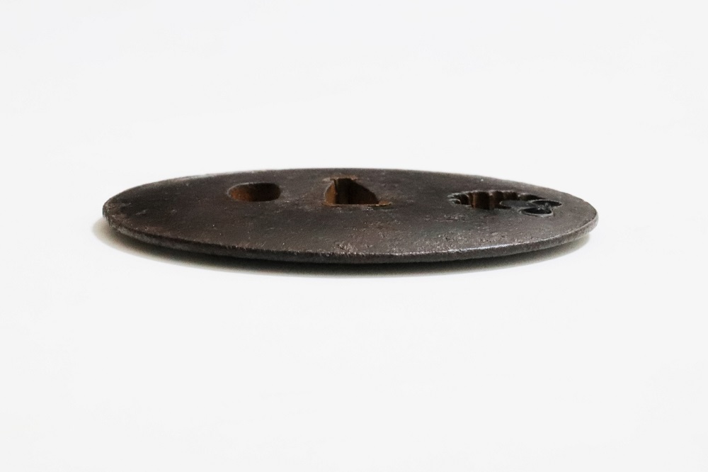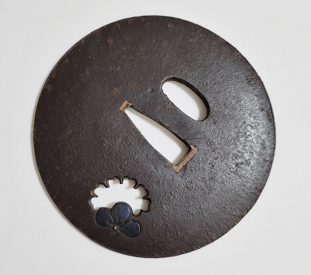 | 彦左衛門は戸田氏。尾張江戸期代表工の一人。小透し多く、阿弥陀鑢得意。尾張戸田村住。本作は中高の碁石形に微細な阿弥陀鑢を掛け僅かに打返し耳を付ける。精錬された鉄地には雪華紋小透と赤銅梅の花を半分づつワンポイントで配す。冬の終わりを告げる早春の図。質素ながらも気品ある鐔。2022年保存刀装具審査合格。 |