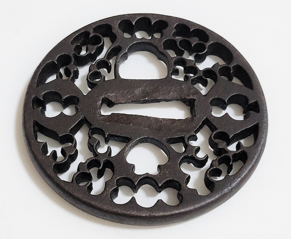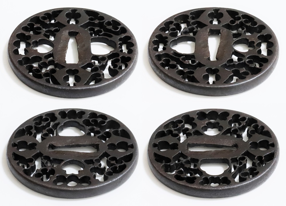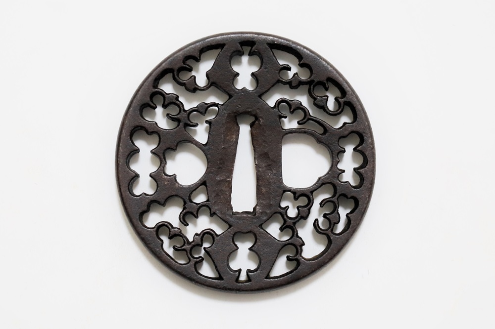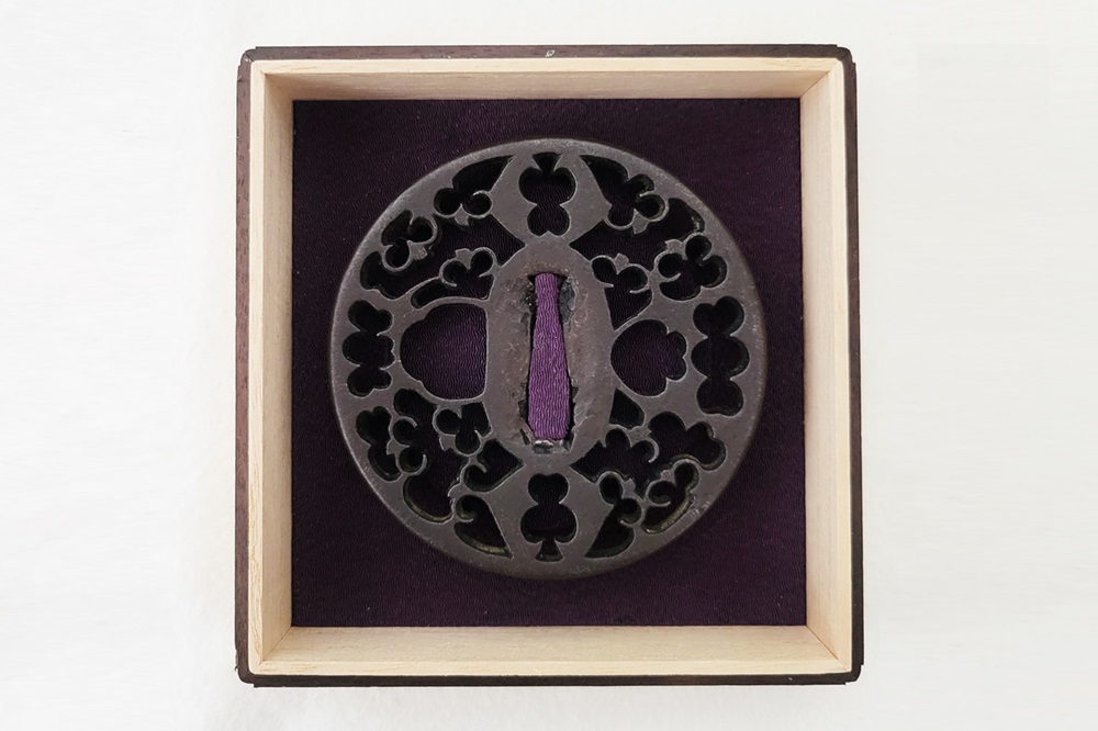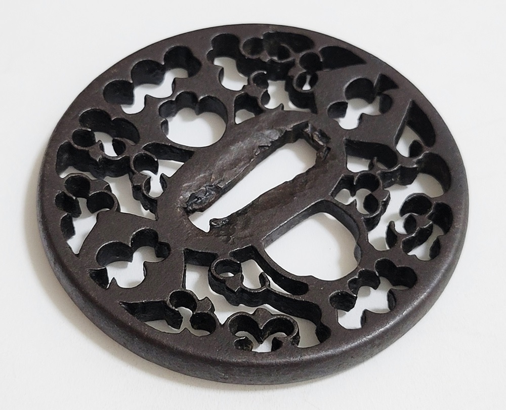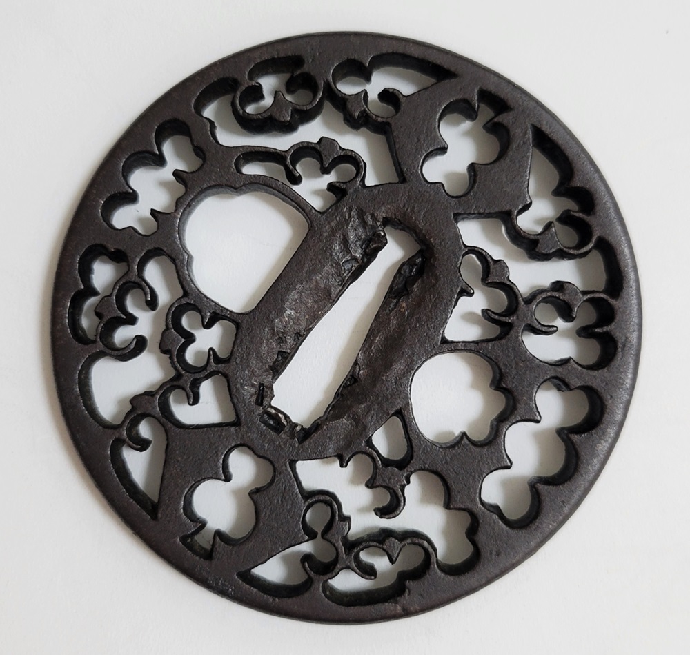| 尾張と極められた厚手、大振り、丸形、鉄地、角耳小肉、地透鐔。精良な地鉄には深みがあり、耳に鉄骨があらわれ重厚で骨太。中低(なかびく)が顕著な造込み。構図は抱茗荷と雁金の対称的な透に見えるが精察すると微妙に違えている。地透鐔の優品。2024年保存刀装具審査合格 |