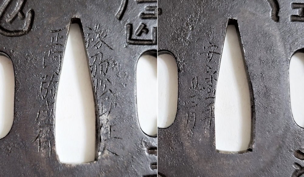 | 伊予正阿弥は、豊臣秀吉の重臣加藤嘉明が慶長八年(1603)松山に入城の際に、京都から京正阿弥を招いたことに始まるといわれる。銘において、予州正阿弥一派は「予州」の「州」の字はすべて「刕」字となる。本作の盛伴は「盛」通字とする盛某の一門。安永五年(1776)の年紀入作。2024年11月刀装具審査で保存合格。 |