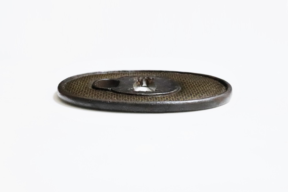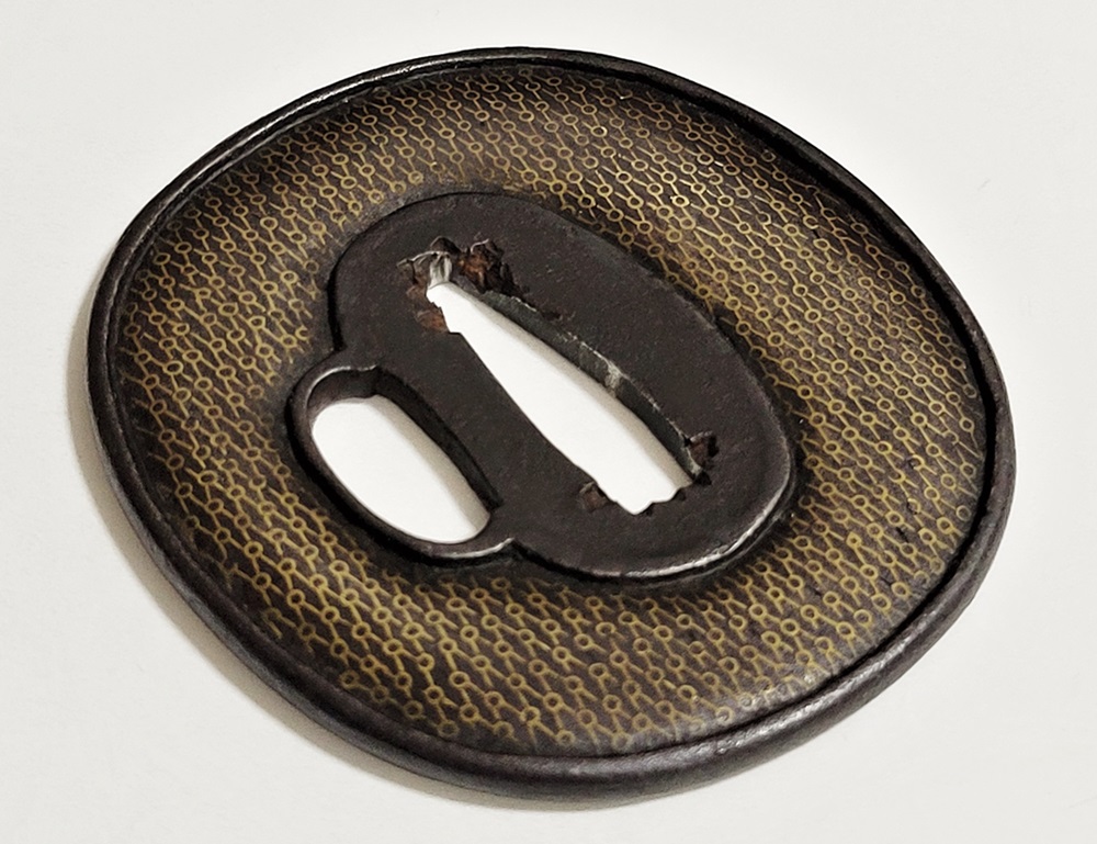 | 材質 | 鉄地 竪丸形 鋤下彫 象嵌 鋤残耳 |