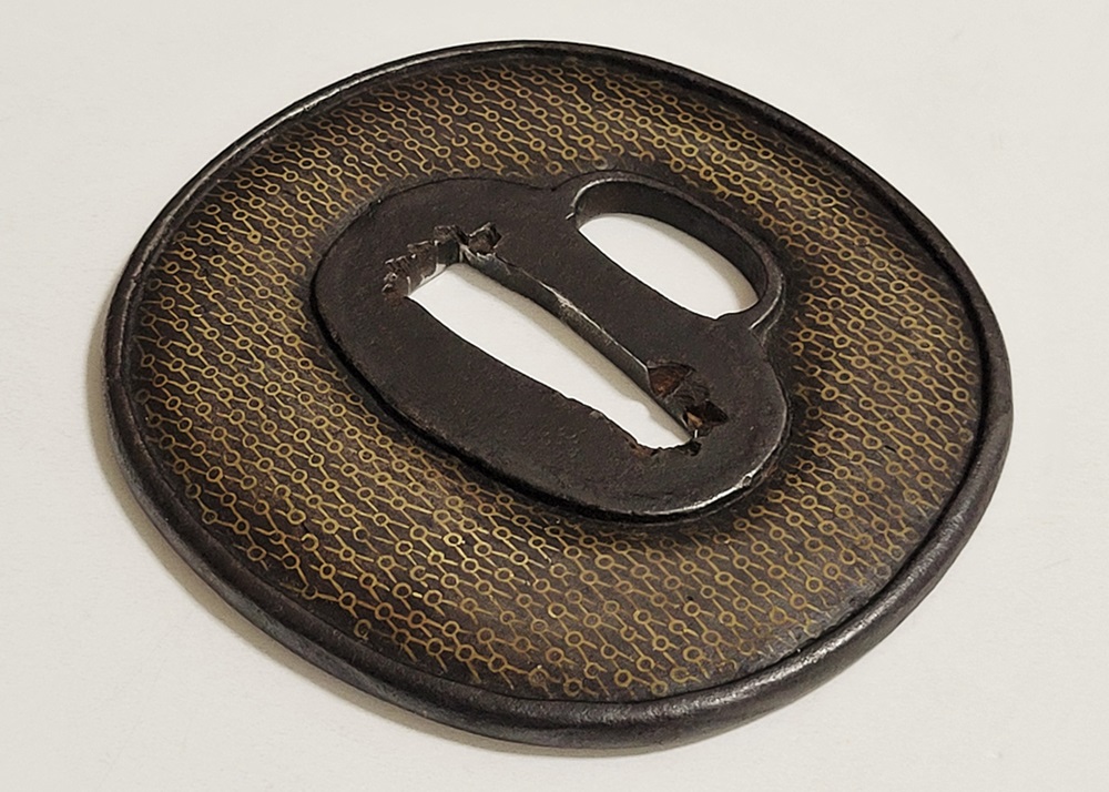| 網目紋は結ばれて離れないことをあらわす吉祥紋。また一網打尽で一度に全てを捉えることから勝利を意味し武将に好まれた。本作は「庄内」と極められた真鍮平象嵌の網目図鐔。出羽国庄内は現在の山形県鶴岡市を拠点とした地域。酒井家十四万石が藩主の庄内藩城下町で、古くは羽黒山僧侶の作と伝わる数珠鐔、江戸時代後期には奈良風を庄内に広めた珍久やその弟子で後に娘を嫁にした安親(初代)、鷲田光仲や桂野赤文などを始め著名な金工が出現した。作風は進取の気性が窺われ、本作も鉄平地を鋤下彫して立体感のあるめずらしい肉置きをあらわしている。保存鑑定書付。 |