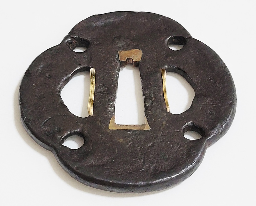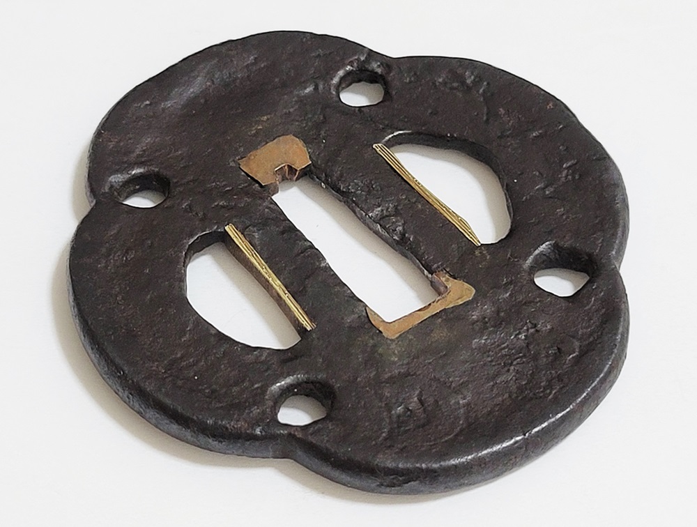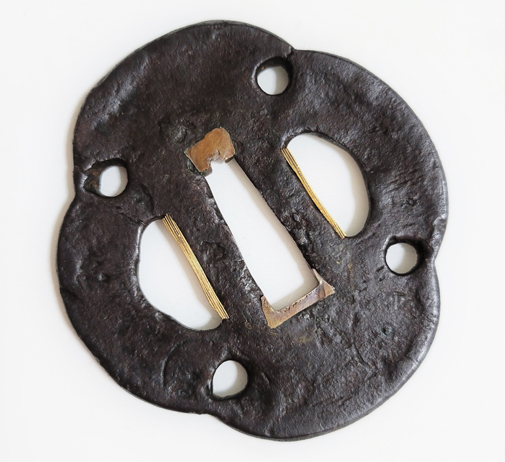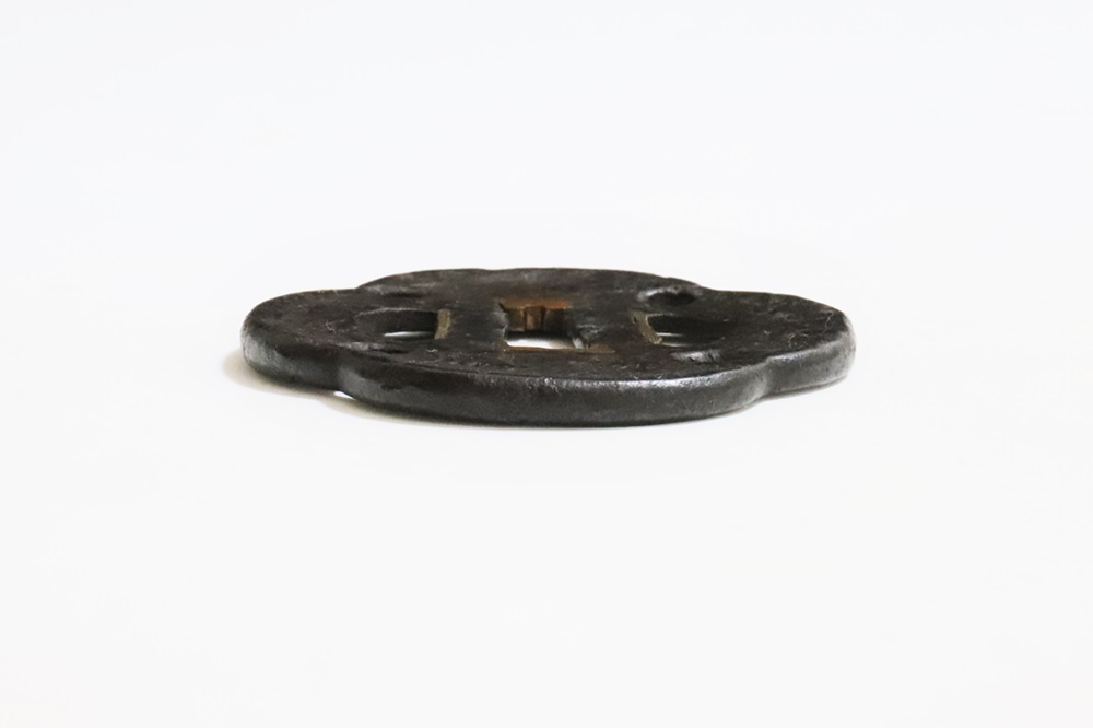 | 本作は耳に鉄骨があらわれ中低の造込みであることから尾張系統と思料するが、2024年5月刀装具審査で明珍と極められた。明珍家は古くは鎌倉時代までさかのぼり、甲冑・具足の製作から後代は鐔、鉄製置物、各種鉄工品の製作を全国に分布しておこない幕末まで繁栄する。本作両櫃孔には金の責金が施され伝来を思わしめる作。 |