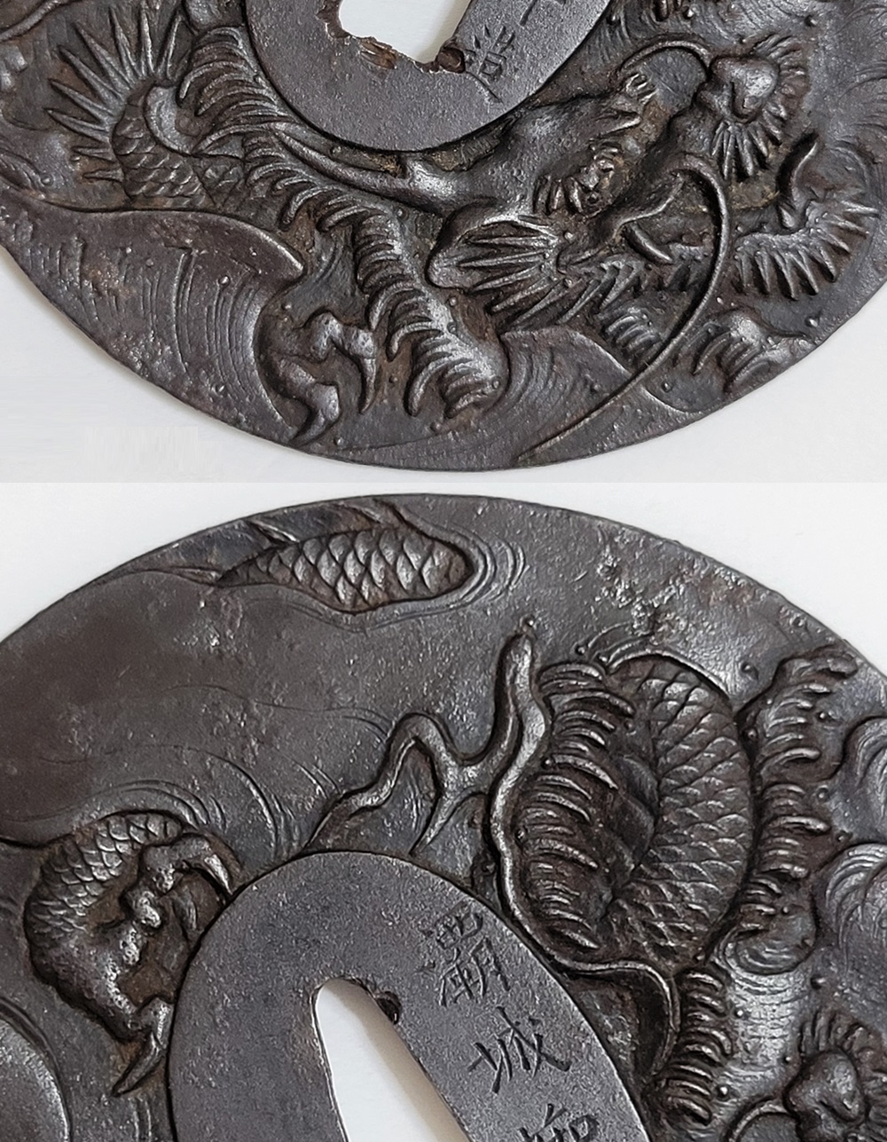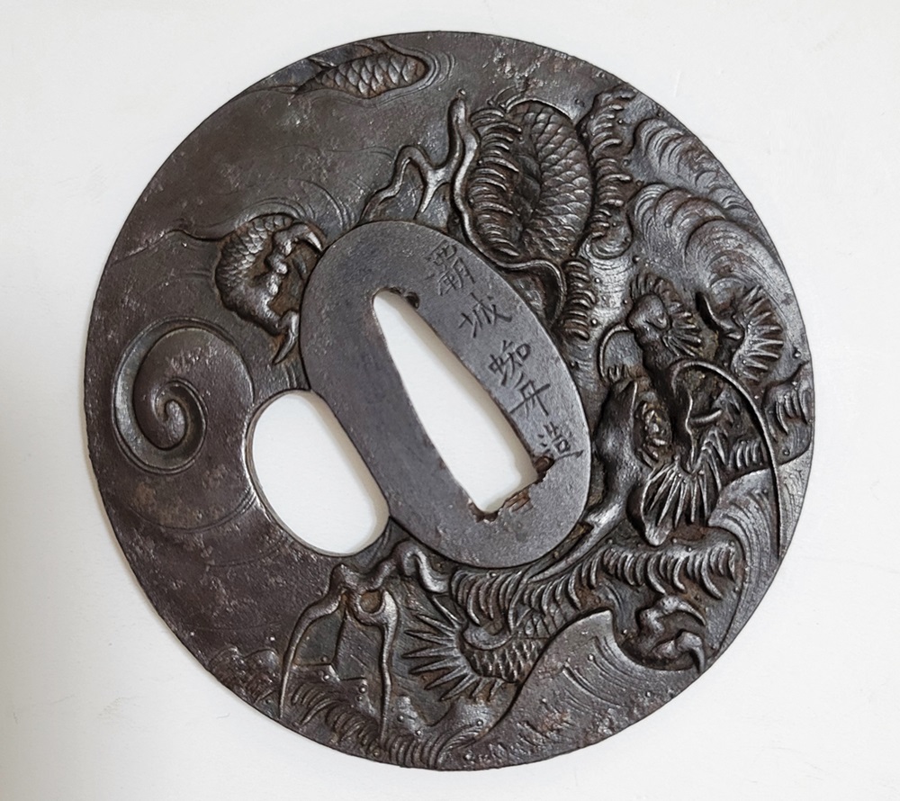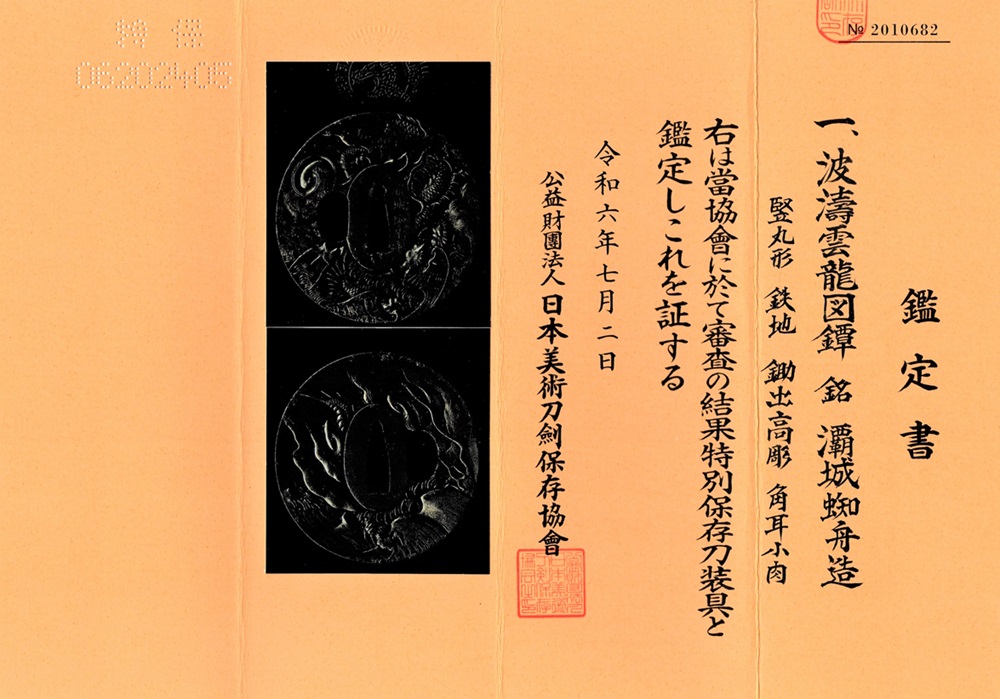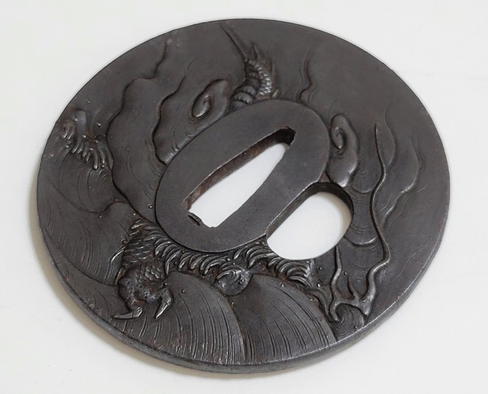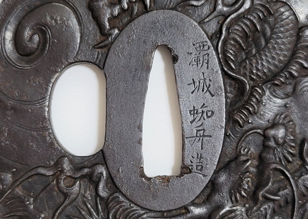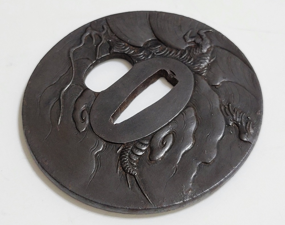 精巧な鋤出高彫で波濤雲龍図をあらわす。作者の蜘舟は、長州を意味する「覇城」を用いており、岡本家五代で毛利家抱工の知賢(ともかた)門人か。「知周」等の銘を当て字で切ったか。めずらしい銘の迫力見応えある長州鐔。2024年特別保審査存合格。