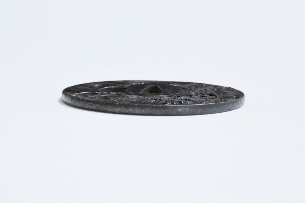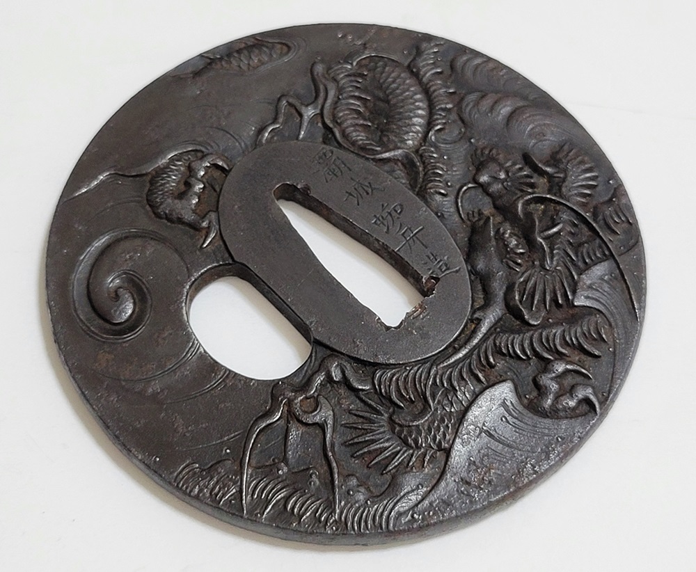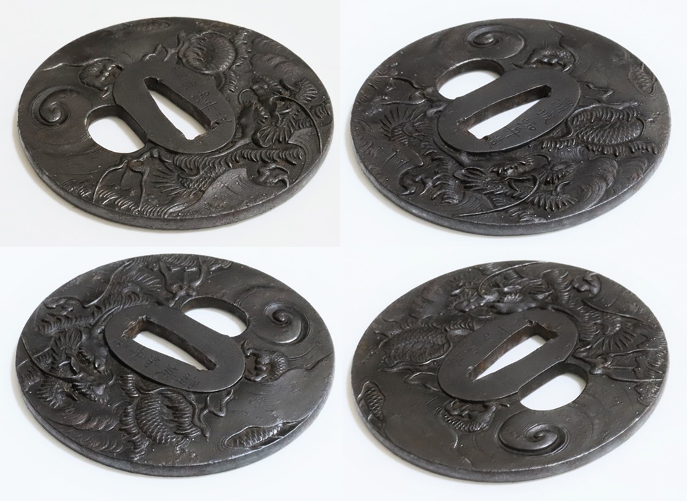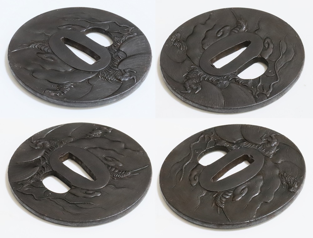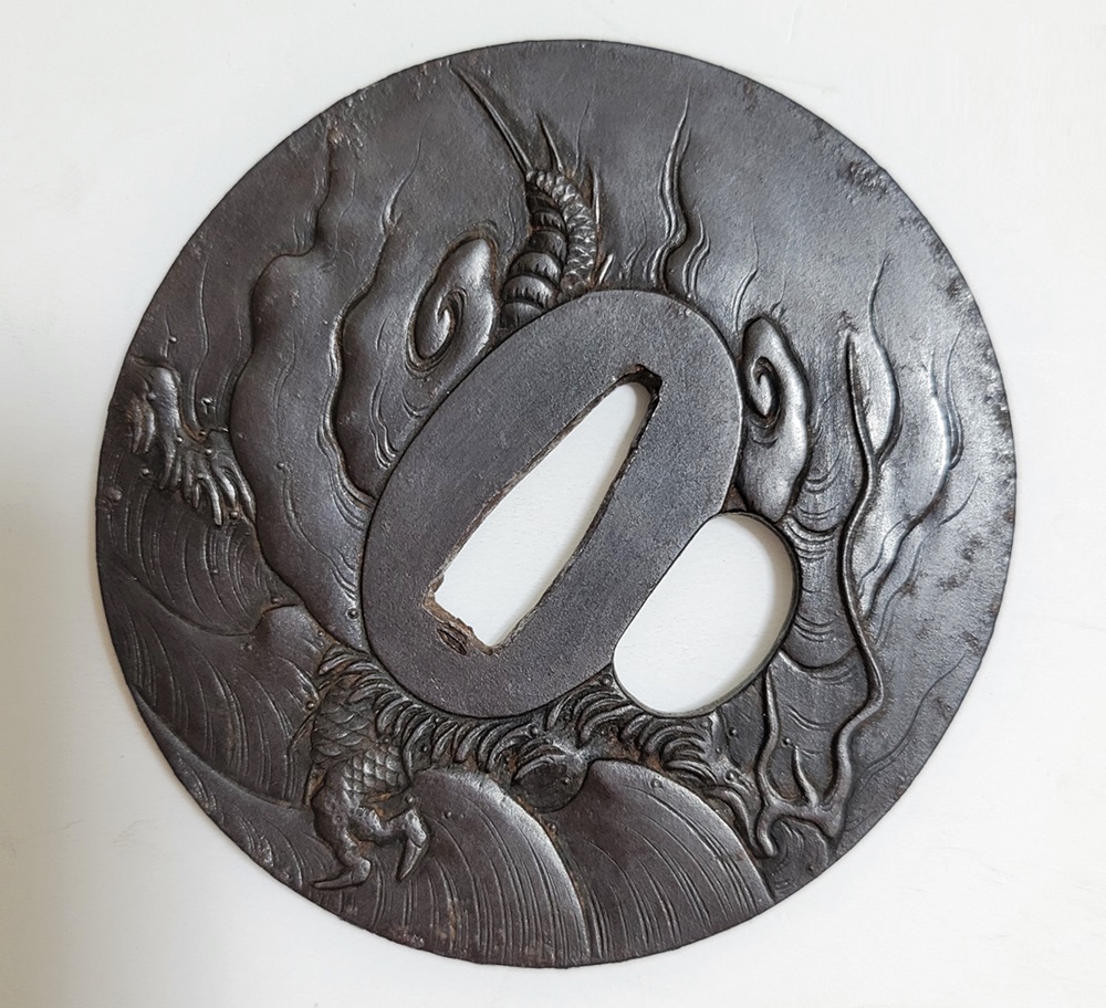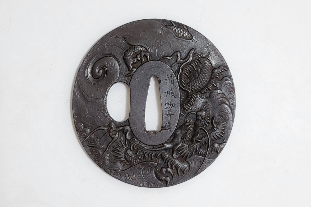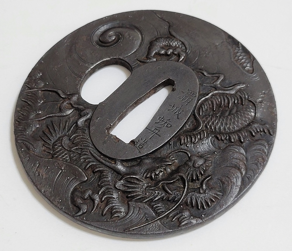 精巧な鋤出高彫で波濤雲龍図をあらわす。作者の蜘舟は、長州を意味する「覇城」を用いており、岡本家五代で毛利家抱工の知賢(ともかた)門人か。「知周」等の銘を当て字で切ったか。めずらしい銘の迫力見応えある長州鐔。2024年特別保審査存合格。