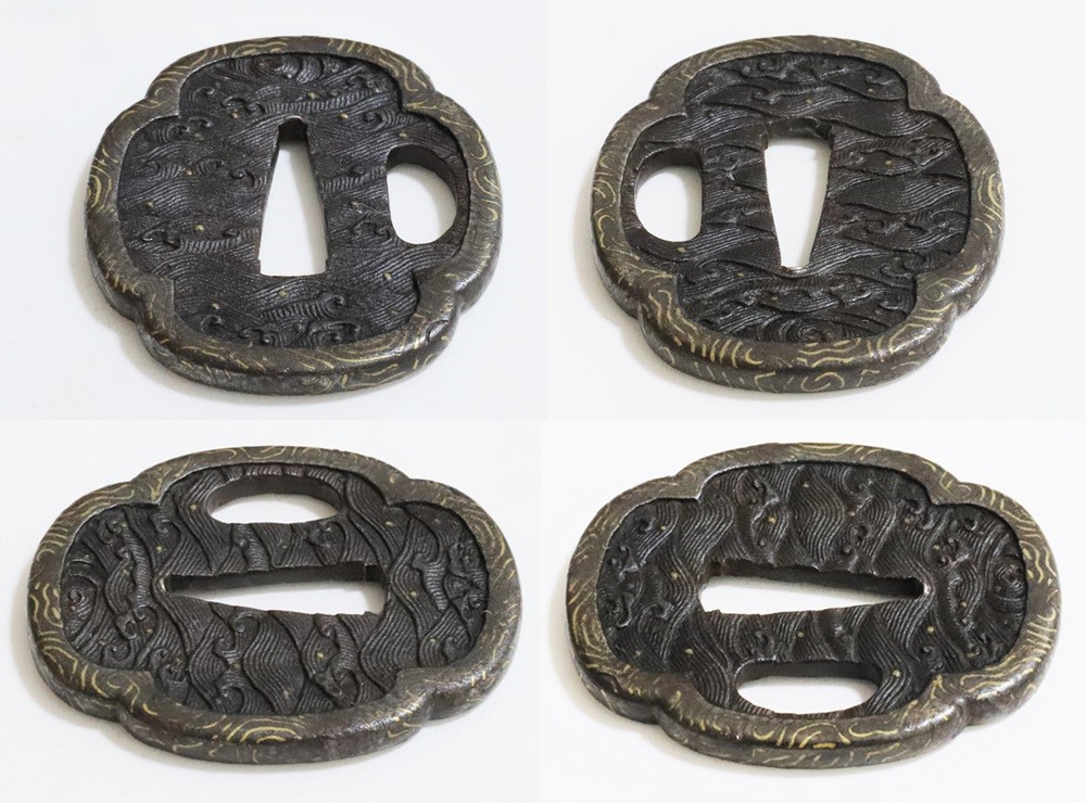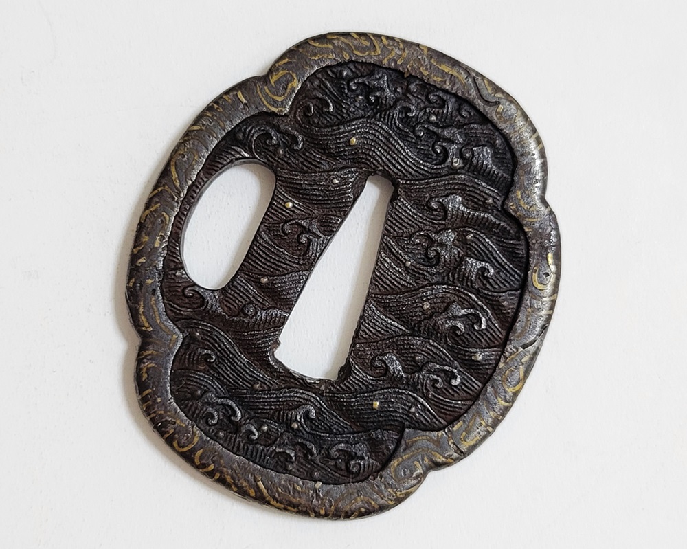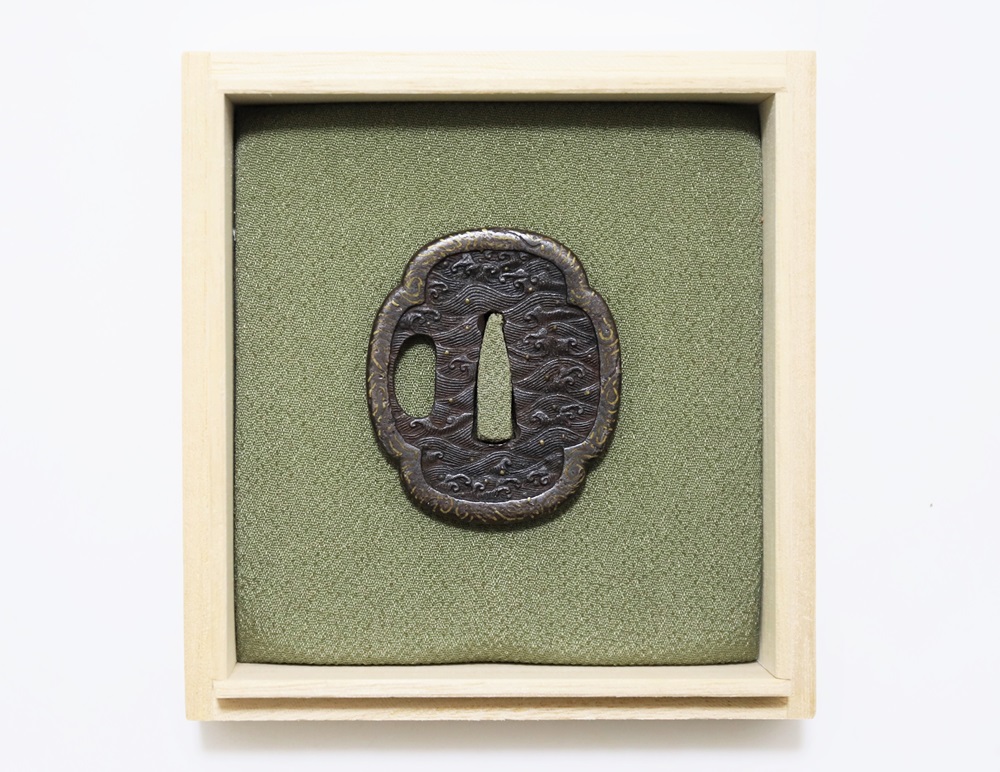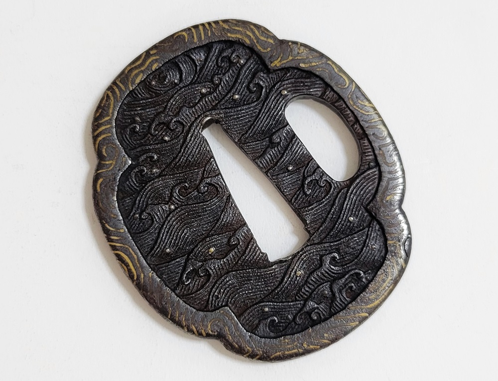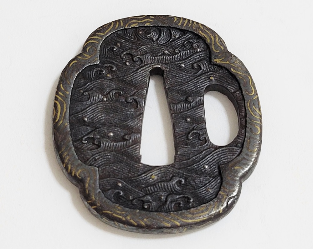 | 波は寄せては返し果てることがなく、吉祥文様として、永遠・不滅・長寿・誕生など未来永劫や永遠の平安の意味がある。本作は、平地に鋤出毛彫で波濤をあらわし、飛沫の露象嵌、土手耳の与四郎風象嵌を真鍮で施す喰出鐔。 |
