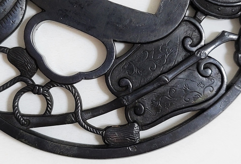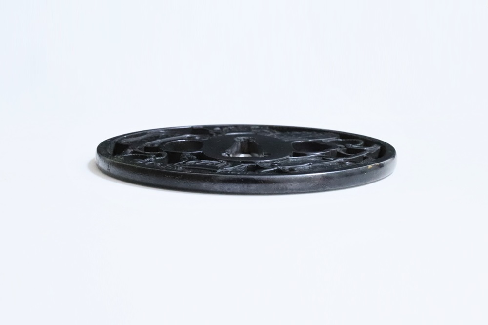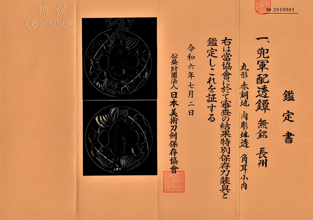 真丸形、赤銅地無色、肉彫透、角耳小肉の長州に極められた兜軍配透鐔。精巧で重厚感あり優美高尚。2024年特別保存審査合格。