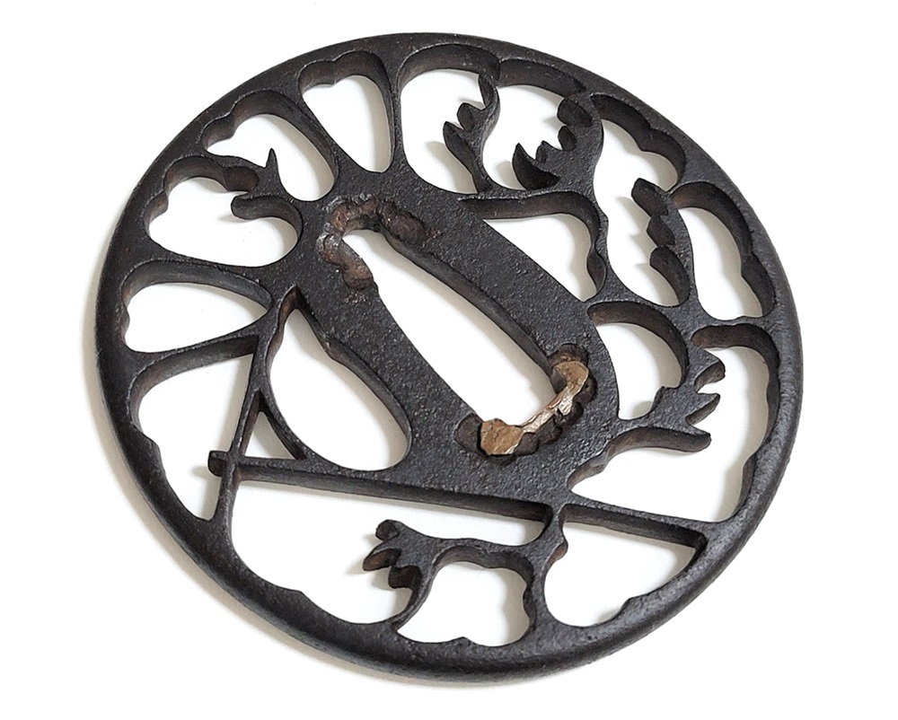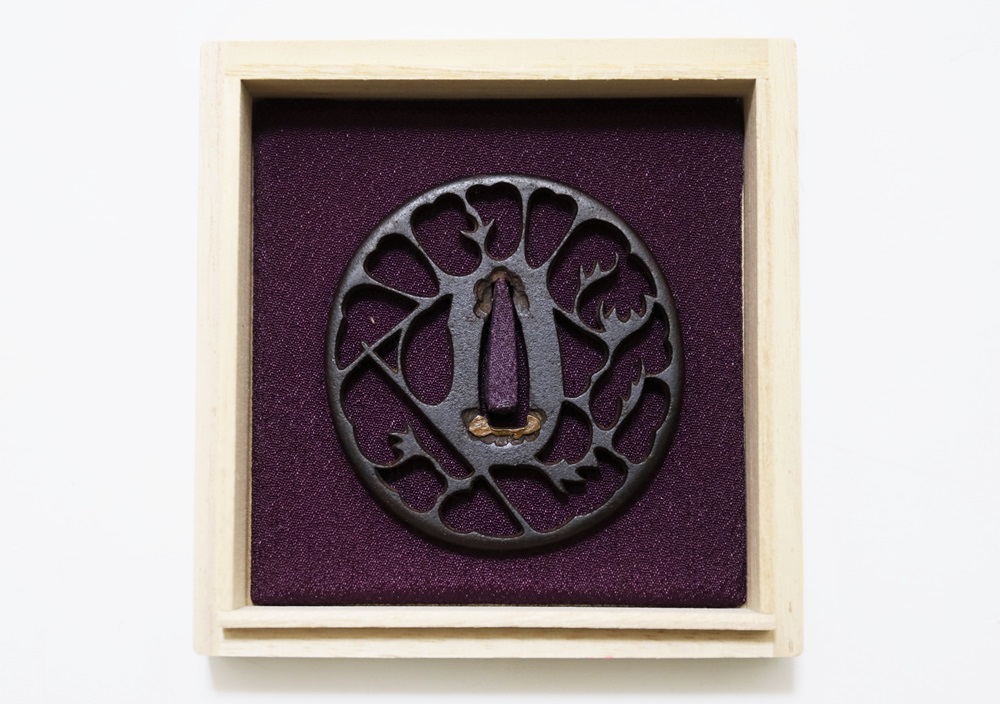 | 洗練された意匠で鉄の鍛がよい赤坂透鐔は、繊細優美な京透や重厚で豪放な尾張透とは異なる。本作は菊花形に内周を透かし、枝葉を地透であらわす菊透鐔。菊花と枝葉の表現が妙で赤坂の洗練感覚があらわれている。2018年保存審査合格。 |