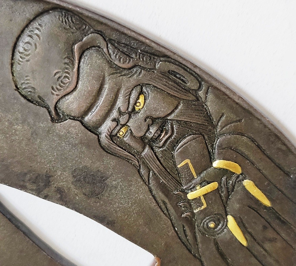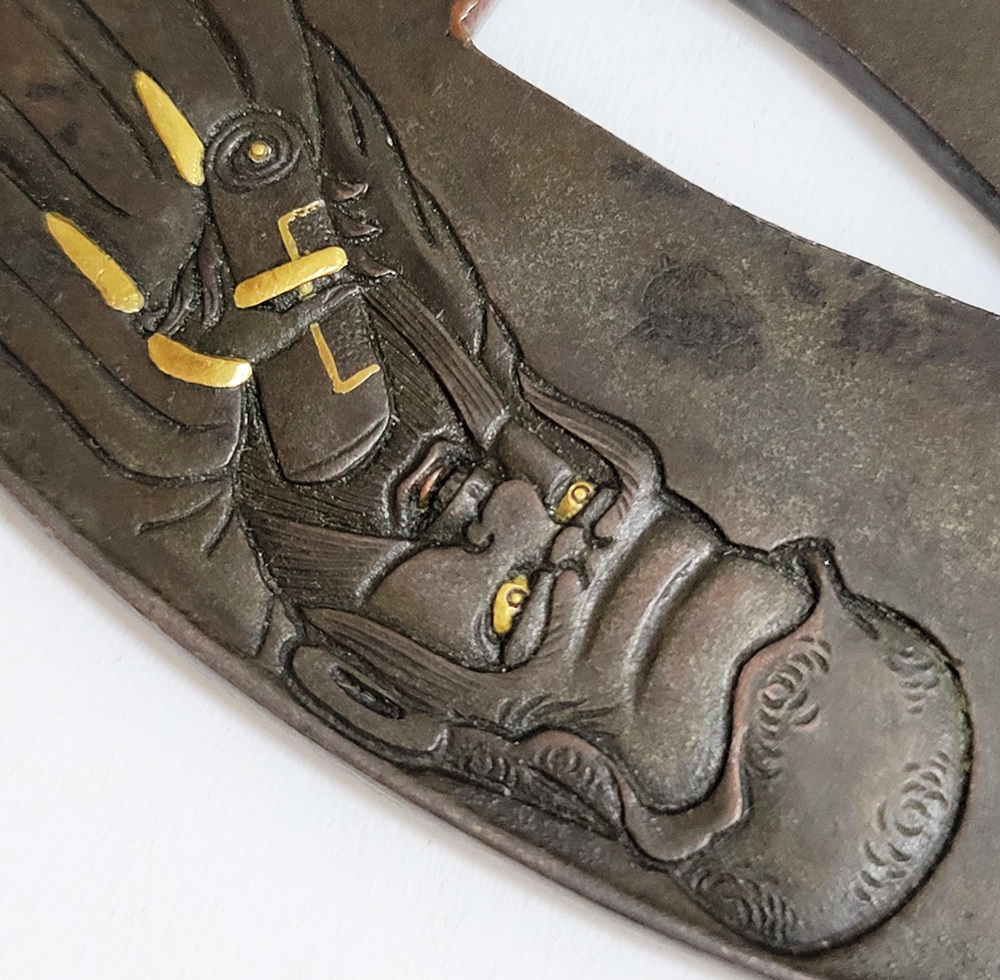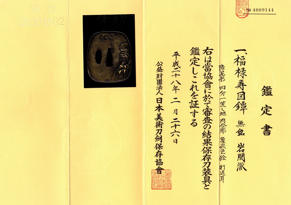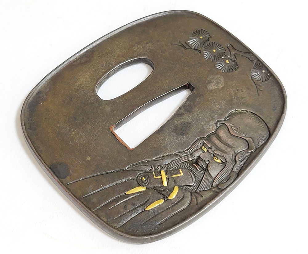 | 無銘ながら岩間派と極められた福禄寿鐔。岩間派は浜野本家で学んだ岩間政盧(まさよし)(明和元年1764・江戸下谷生)を祖とし、信随(のぶゆき)、信盧(のぶよし)、尚盧(たかよし)ら岩間の苗字を許された門弟と共に政随風の高彫工法で主に和漢の人物図作を成す。本作は、厳しく威厳ある顔を端正な彫であらわす。平成28年(2016)保存審査合格。 |