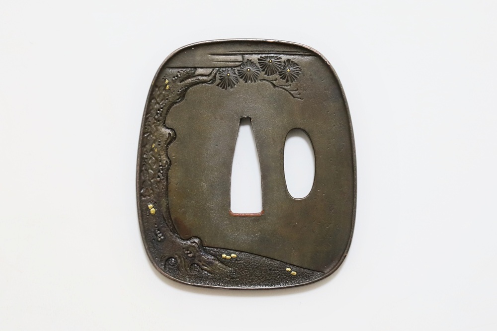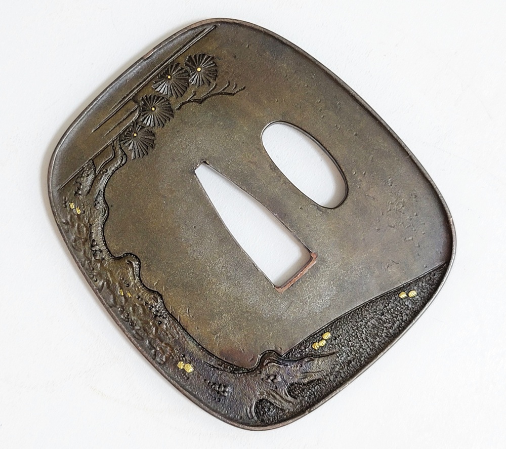 | 材質 | 四分一荒し地 障泥形 肉合彫 象嵌色絵 打返耳 |