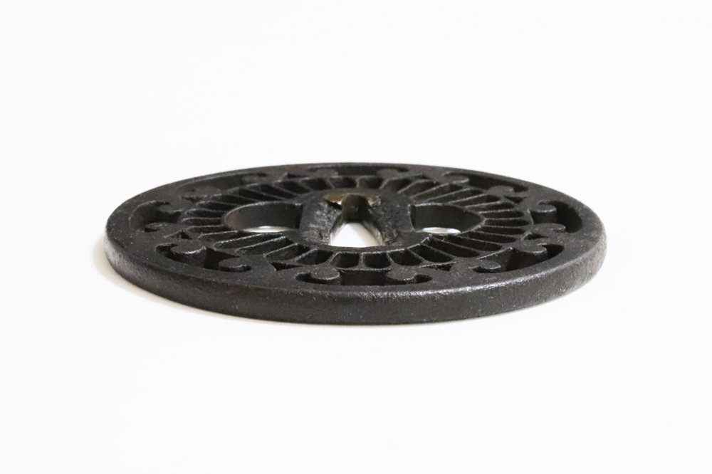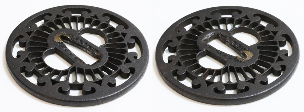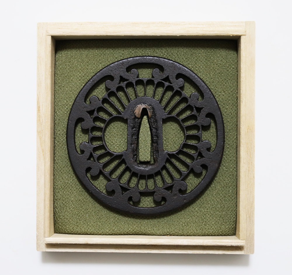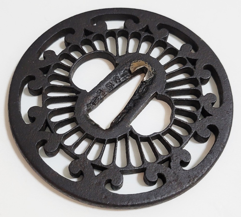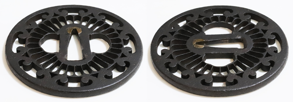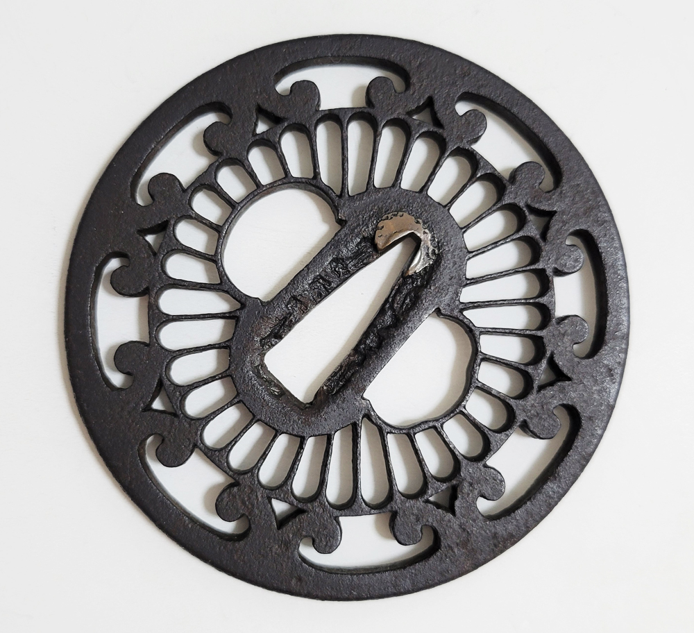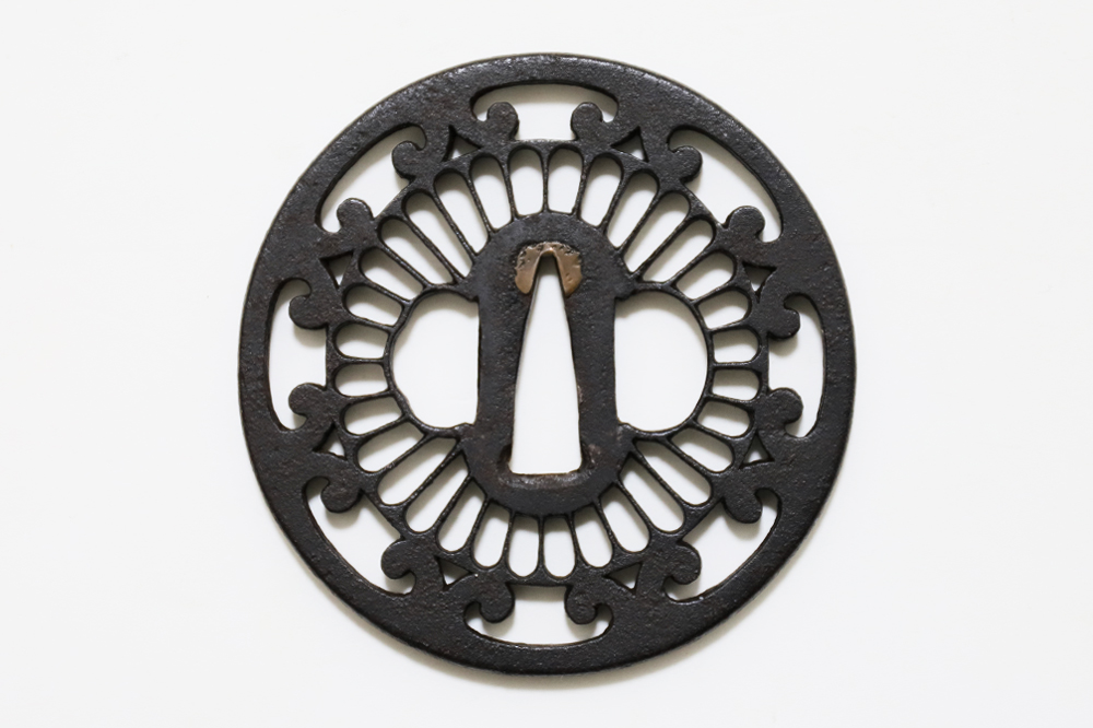 | 平地を菊花形に透かし、その外周を蕨手で繋ぐ意匠の鉄透鐔。頑丈で上手い左右対称の造込みに絵風の図案から時代の下がる尾張鐔と思われる。 |