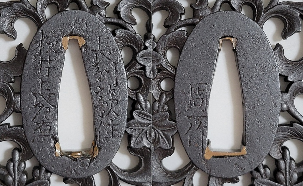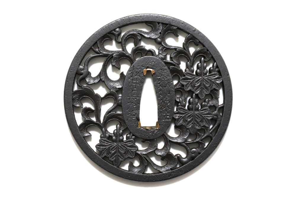 | 松井長左右門周一は、江戸中期、長門国住。鉄地丸形に草花図を肉彫地透にした鉄鐔を造る。嫡弟長左衛門松井氏周一と銘を切って河治友周と合作鐔もある。本作は、鉄色黒く、彫法が精巧で柔らか味がある。表に「長州萩住 松井長左右門」、裏に「周一作」と長銘を切った入念作。2008年保存刀装具審査合格。 |