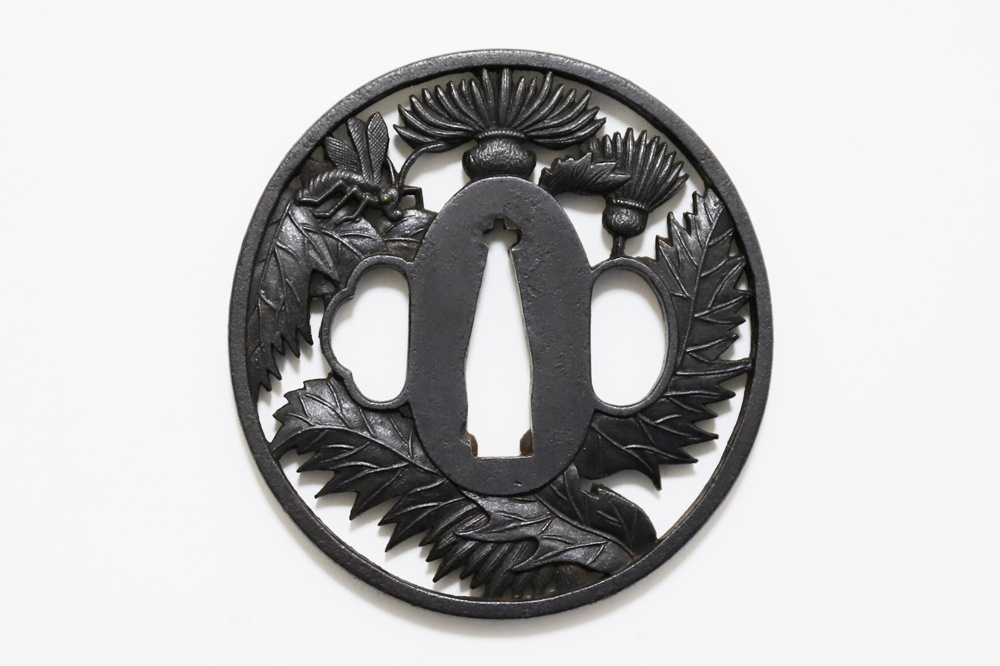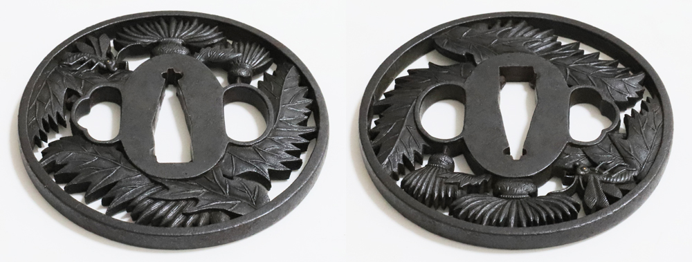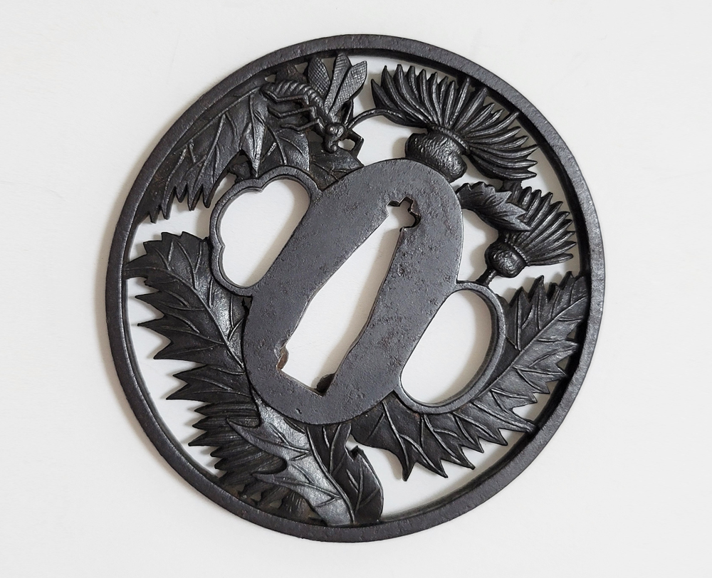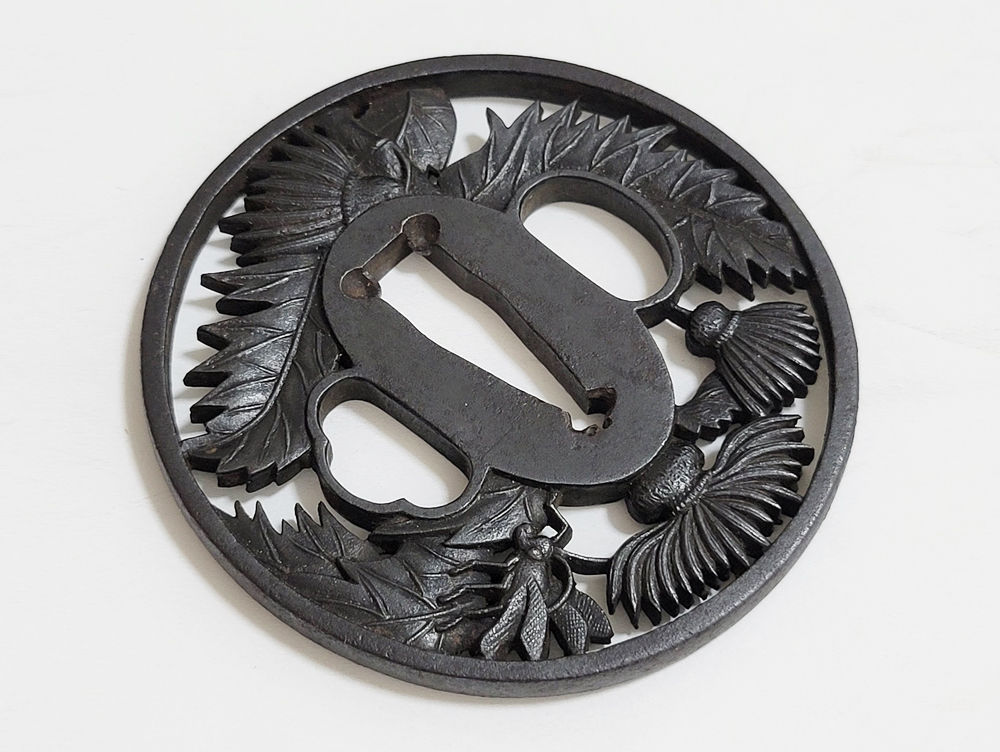 | 菊花と秋虫図の鉄地肉彫地透鐔。立体感ある精巧な菊花の彫り込みに秋虫を宿し目に金露象嵌を施す。出来優れ極めに思いが巡る。 |