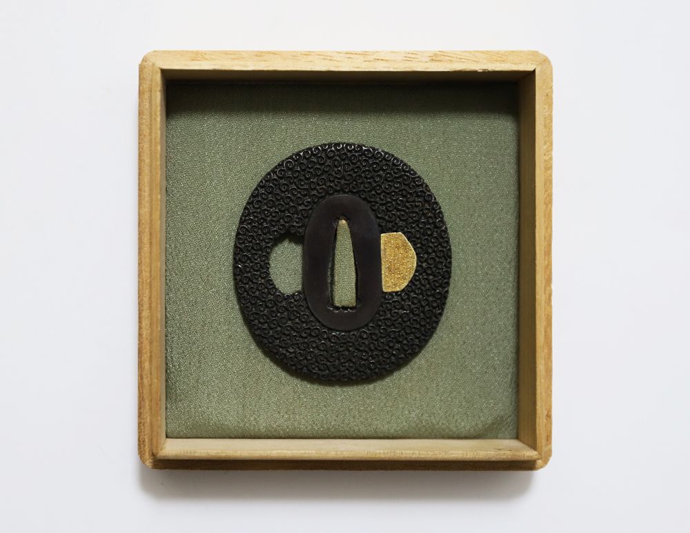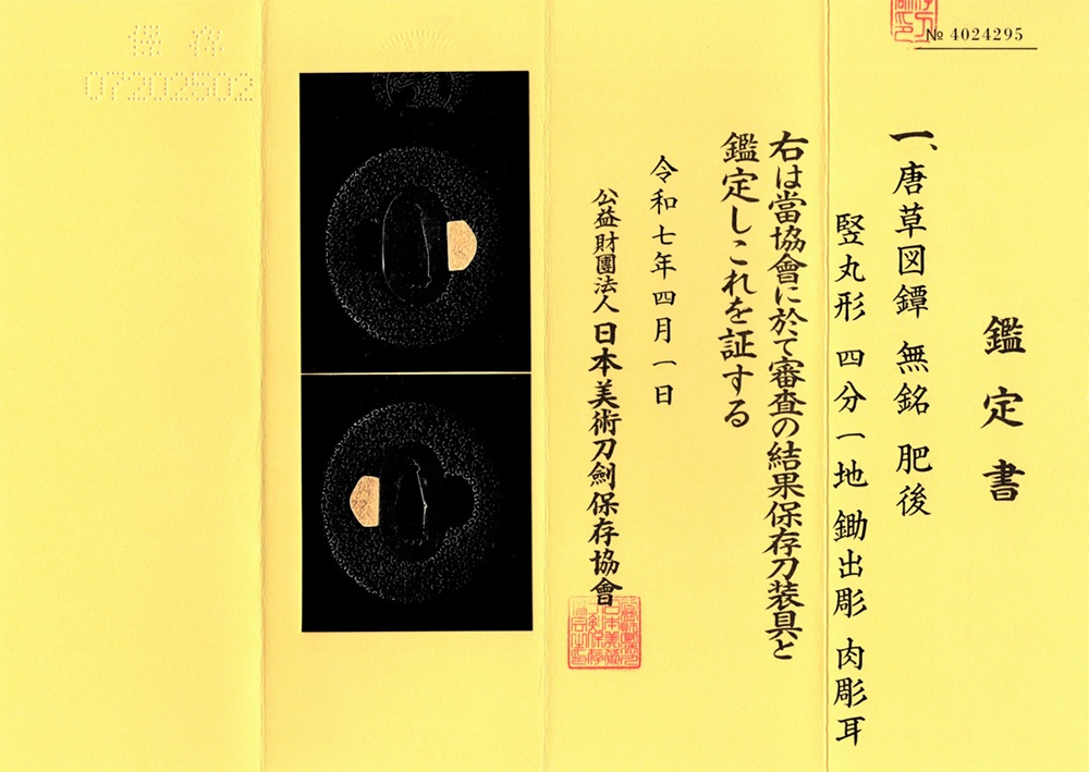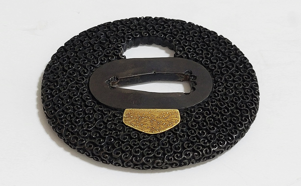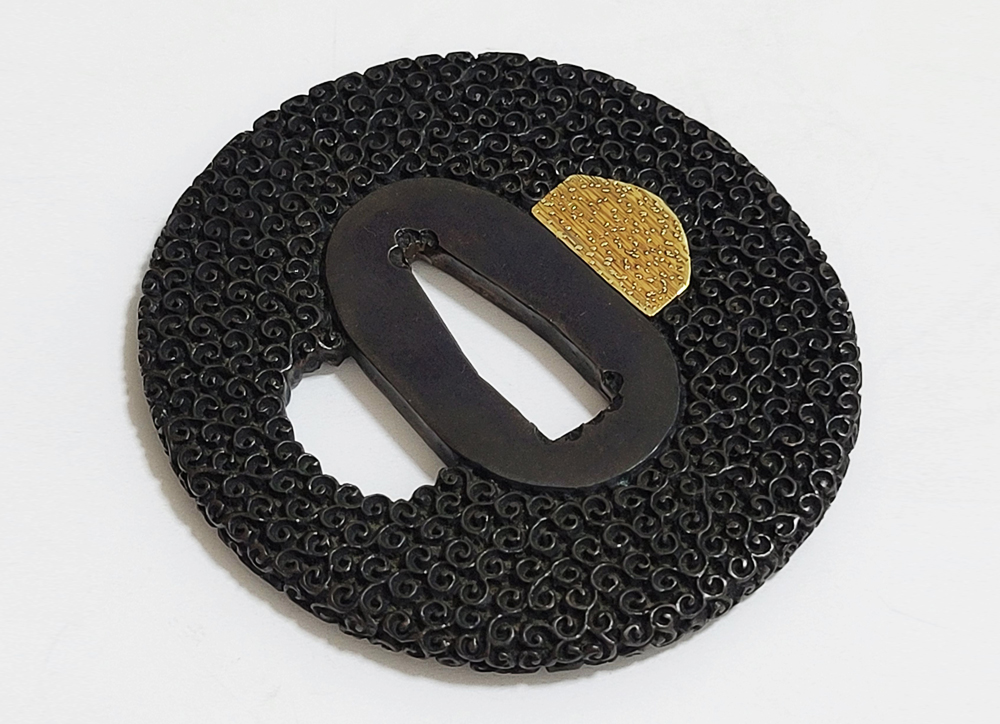 唐草を全面に鋤彫であらわした意匠の赤銅地鐔。めずらしい。2025年2月刀装具審査で「肥後」と極められ保存合格。