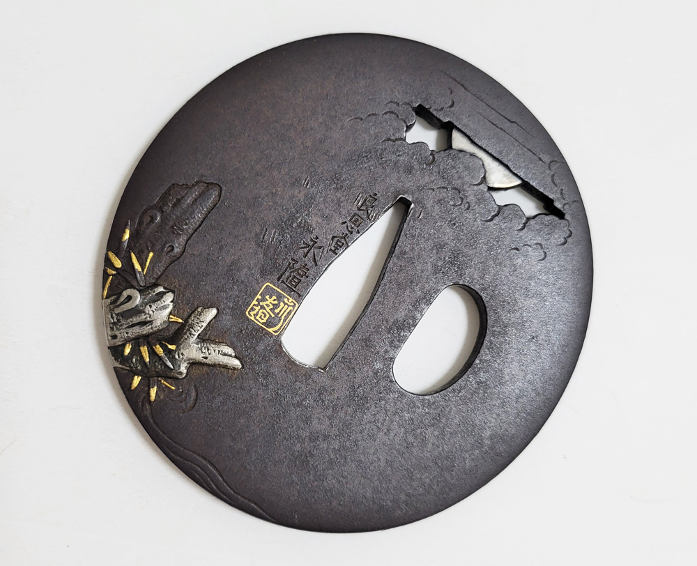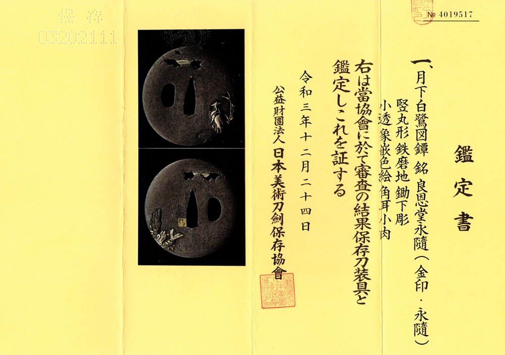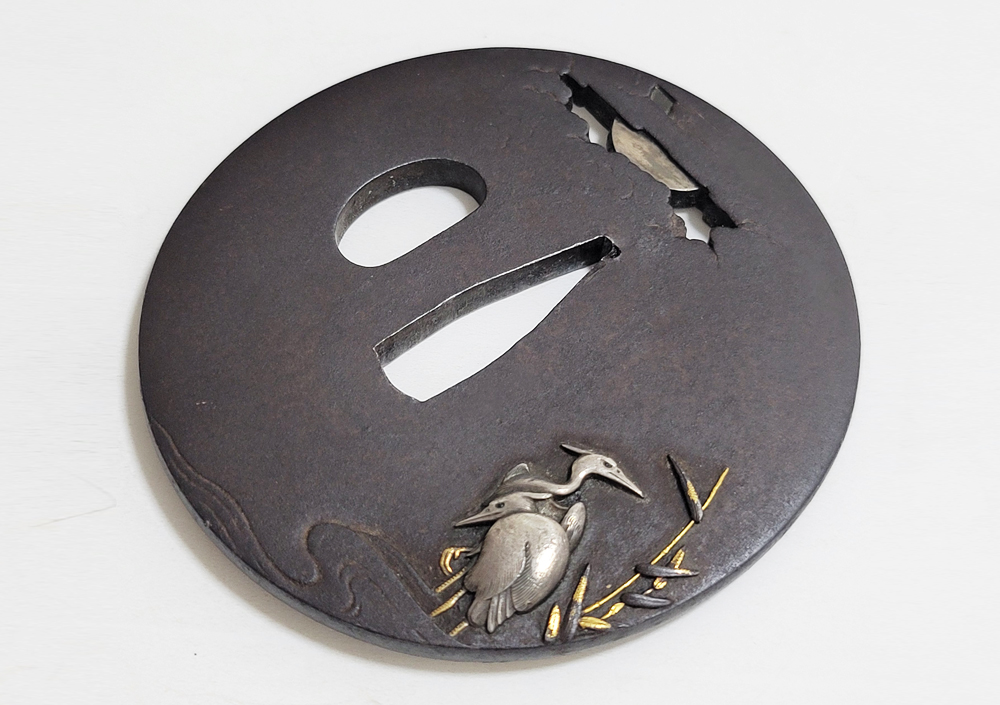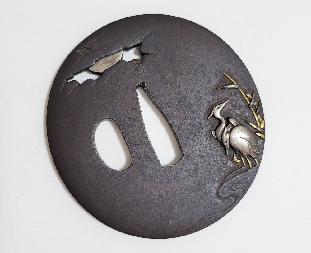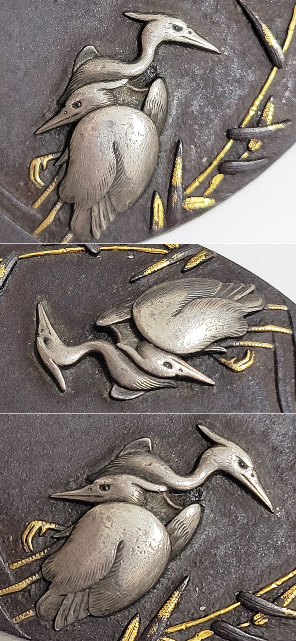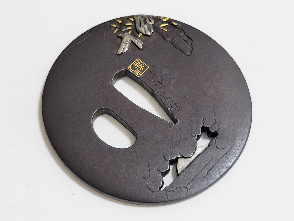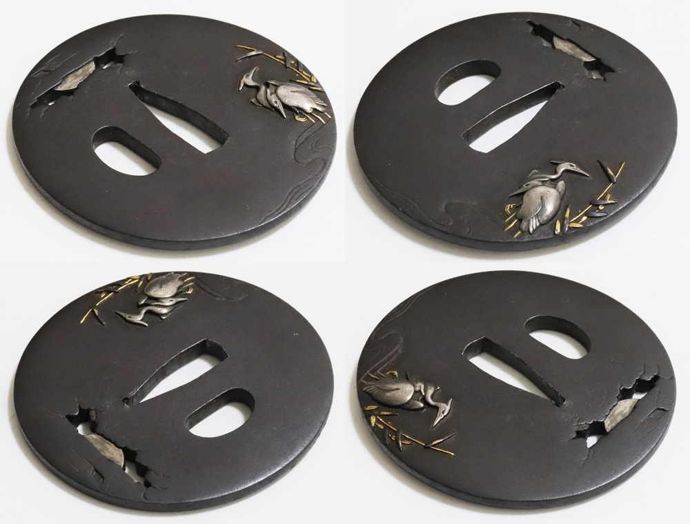 | 永随(ながゆき)は吾妻氏。はじめ稲川良克に学び良随と名乗る。のちに名手の濱野矩随(のりゆき・濱野政随に学び濱野の姓を許された)に師事し永随と改めた。本作は良恩堂を号し金印平象嵌を刻した永随の入念作。技法を駆使した濱野流の粋で思い切りのよい月下白鷺図鐔。 |