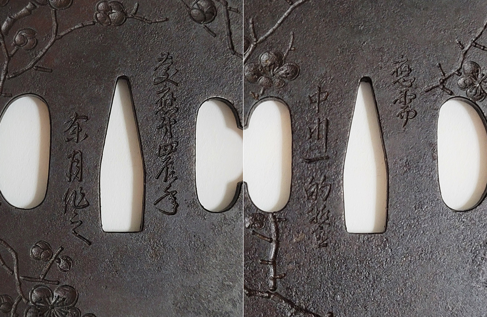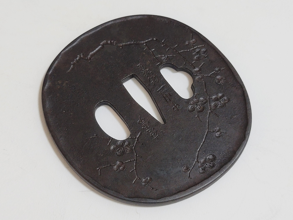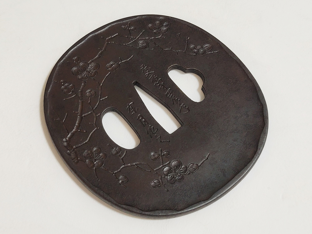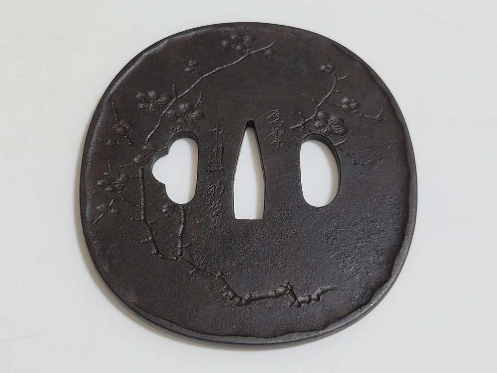 | 中川一的は天保六年(1835)作州津山生まれ。若銘を勝好、勝敬と名乗る。中川一匠、正阿弥勝義が兄。文久元年(1861)父兄の協議で中川本家の継承者となり中川家九代目を相続、津山藩松平家の抱え工となる。明治になり兄一匠の仲介で後藤一乗の門人となり師の一字を許され一的と名乗る。一乗門筆頭格である一琴風の毛彫・甲鋤彫・平象嵌などを得意とする。本作は茎櫃孔が原形で保たれた美品。甲鋤彫で巧みに梅樹が描かれている。2024年特別保存刀装具審査合格。 |