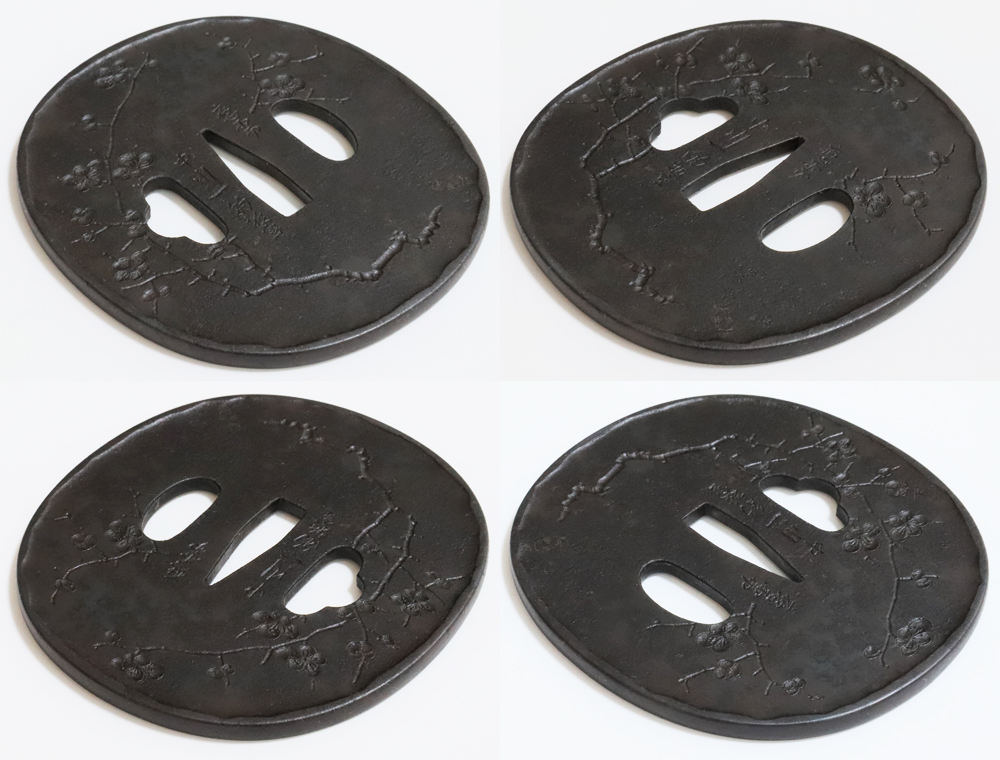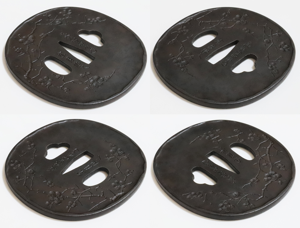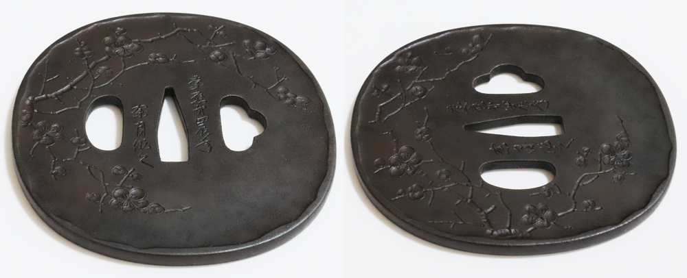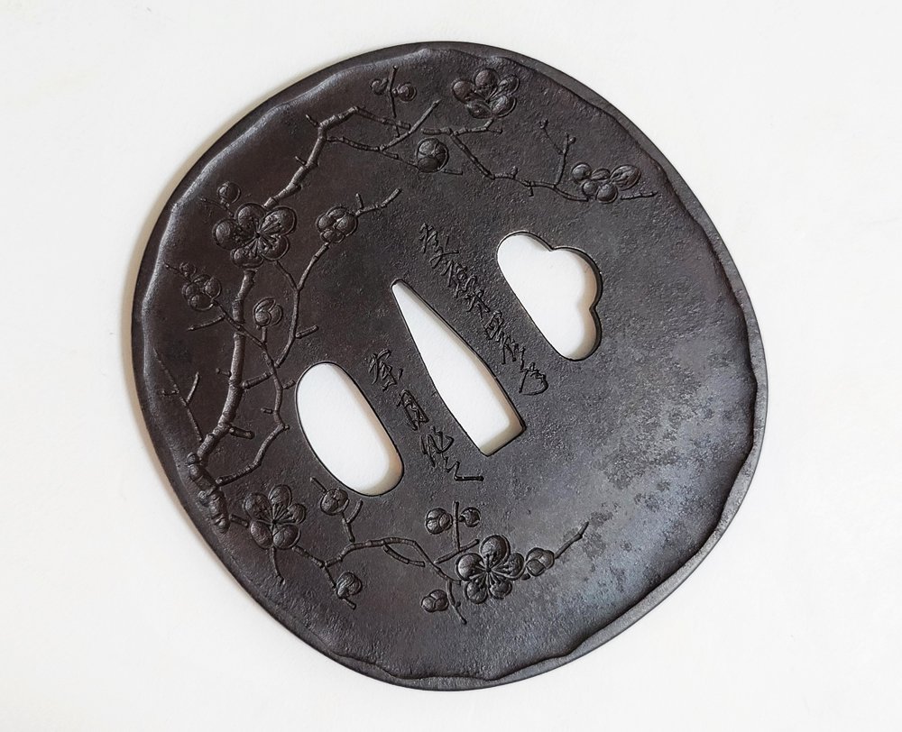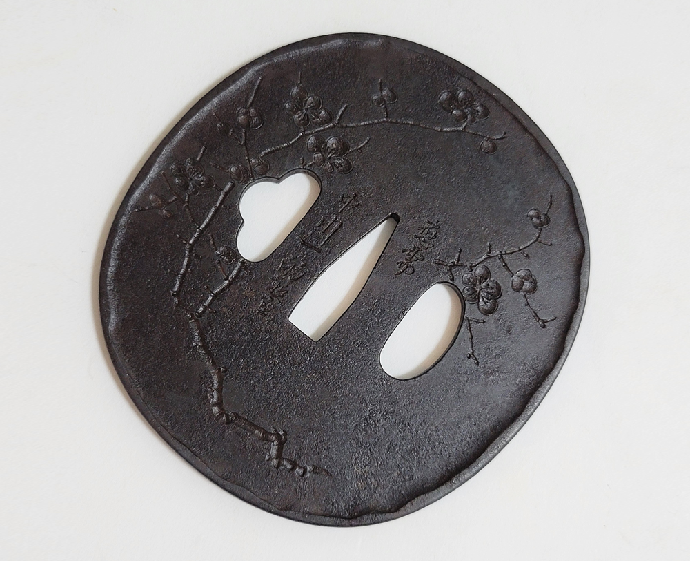 | 中川一的は天保六年(1835)作州津山生まれ。若銘を勝好、勝敬と名乗る。中川一匠、正阿弥勝義が兄。文久元年(1861)父兄の協議で中川本家の継承者となり中川家九代目を相続、津山藩松平家の抱え工となる。明治になり兄一匠の仲介で後藤一乗の門人となり師の一字を許され一的と名乗る。一乗門筆頭格である一琴風の毛彫・甲鋤彫・平象嵌などを得意とする。本作は茎櫃孔が原形で保たれた美品。甲鋤彫で巧みに梅樹が描かれている。2024年特別保存刀装具審査合格。 |
