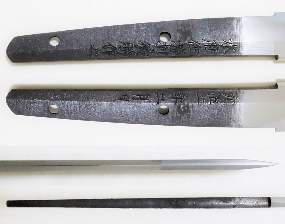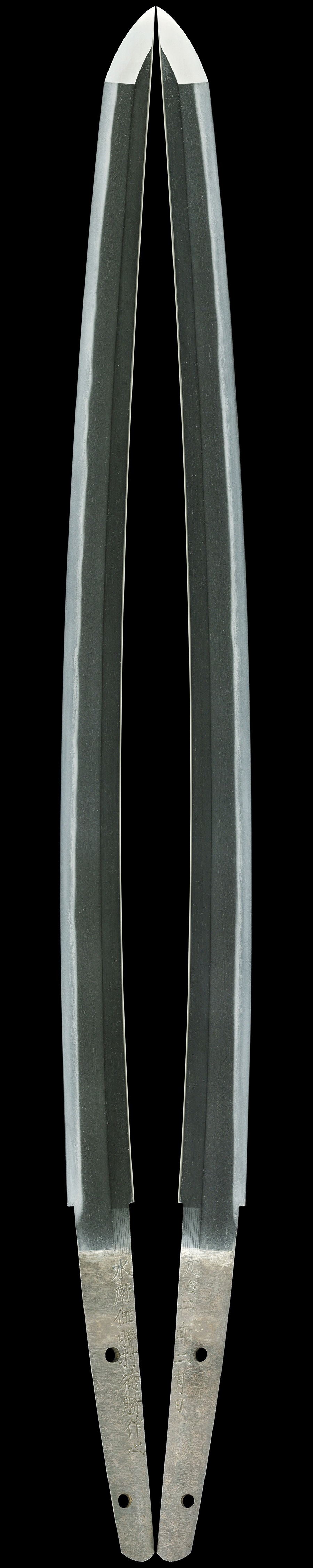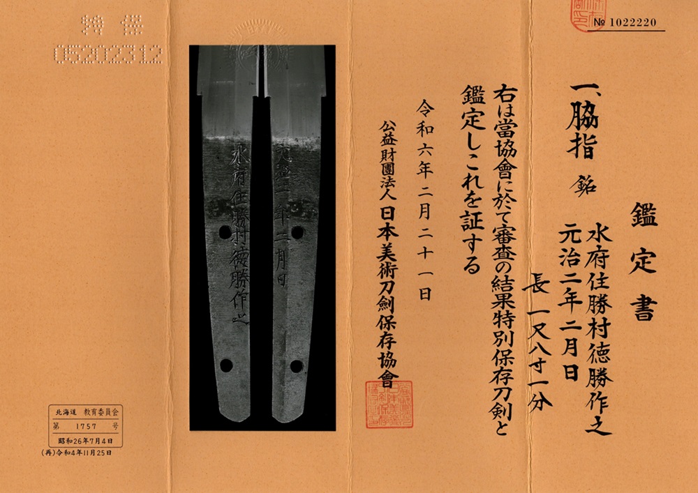 | 本作刀工勝村徳勝は水戸藩士、文化六年(1809)水戸生まれ。初代徳鄰門で多くの門弟を養成した関内徳宗に学ぶ。後江戸に出て細川正義・固山宗次・運寿是一から鍛刀の秘伝を伝授されたという。初銘を楷書に、安政頃より草書に、また晩年の慶応より明治初年までは楷書にて二代徳勝が代銘す。明治五年(1872)64歳歿。武士道に明け暮れた水戸武士にはことのほか珍重された。本作は元治二年(1865)徳勝56歳、特徴である精美な柾目肌の優品。幕末に誂えられたと思われる突兵拵が付されている。2024年特別保存刀剣合格。 |