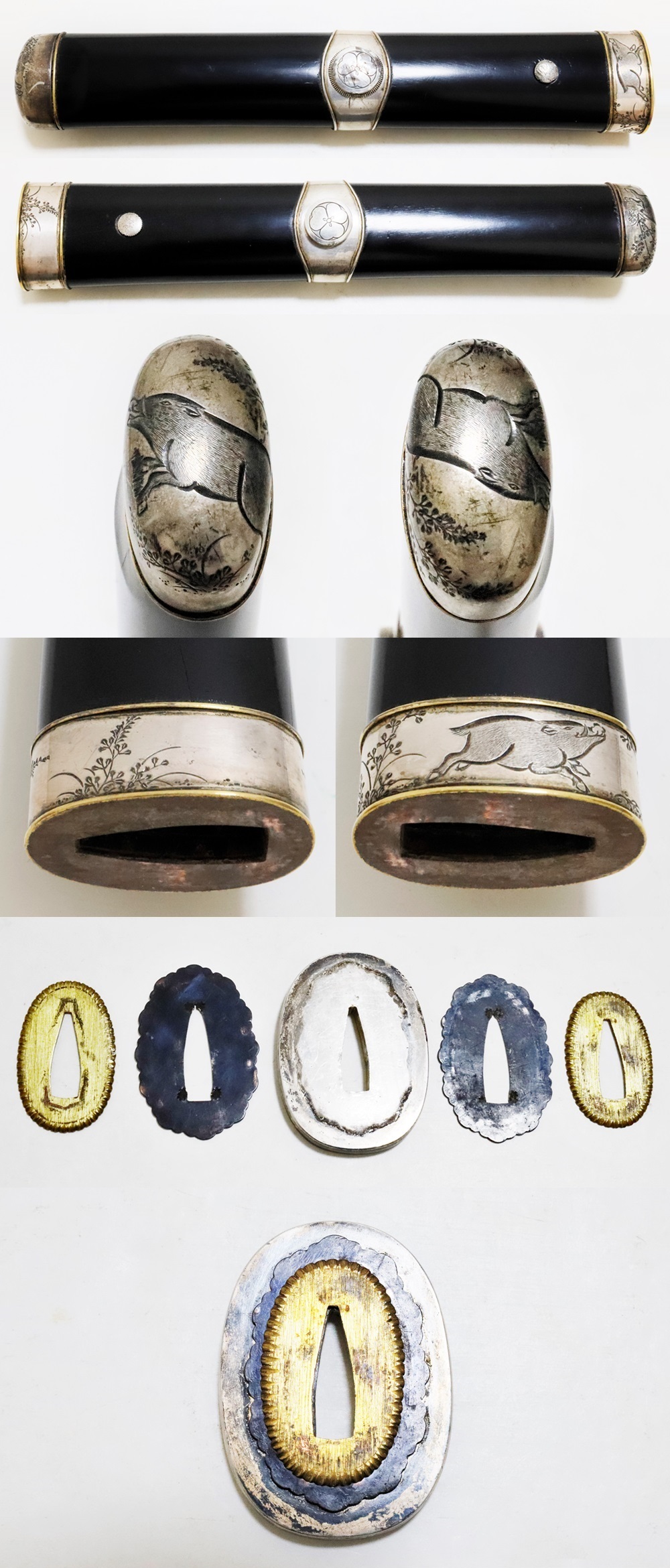 | 縁頭 | 萩に猪図、銀地 片切毛彫 |